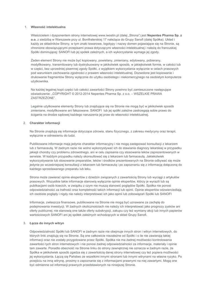 1. Własność intelektualna Właścicielem i dysponentem strony internetowej www.iwostin.pl (dalej „Strona”) jest Nepentes Pharma Sp. z o.o. z siedzibą w Warszawie przy ul. Bonifraterskiej 17 należąca do Grupy Sanofi (dalej Spółka). Układ i każdy ze składników Strony, w tym znaki towarowe, logotypy i nazwy domen pojawiające się na Stronie, są chronione obowiązującymi przepisami prawa dotyczącymi własności intelektualnej i należą do francuskiej Spółki dominującej: SANOFI lub jej spółek zależnych, a ich wykorzystanie wymaga jej zgody. Żaden element Strony nie może być kopiowany, powielany, zmieniany, edytowany, pobierany, modyfikowany, transmitowany lub dystrybuowany w jakikolwiek sposób, w jakiejkolwiek formie, w całości lub w części, bez uprzedniej pisemnej zgody Spółki, z wyjątkiem wykorzystania wyłącznie w celach prasowych pod warunkiem zachowania zgodności z prawem własności intelektualnej. Dozwolone jest kopiowanie i drukowanie fragmentów Strony wyłącznie do użytku osobistego i niekomercyjnego na osobistym komputerze użytkownika. Na każdej legalnej kopii części lub całości zawartości Strony powinno być zamieszczone następujące oświadczenie: „COPYRIGHT © 2012-2014 Nepentes Pharma Sp. z o.o. – WSZELKIE PRAWA ZASTRZEŻONE”. Legalnie użytkowane elementy Strony lub znajdujące się na Stronie nie mogą być w jakikolwiek sposób zmieniane, modyfikowane ani fałszowane. SANOFI lub jej spółki zależne zastrzegają sobie prawo do ścigania na drodze sądowej każdego naruszenia jej praw do własności intelektualnej. 2. Charakter informacji Na Stronie znajdują się informacje dotyczące zdrowia, stanu fizycznego, z zakresu medycyny oraz terapii, wyłącznie w odniesieniu do ludzi. Publikowane informacje mają jedynie charakter informacyjny i nie mogą zastępować konsultacji z lekarzem lub z farmaceutą. W żadnym razie nie wolno wykorzystywać ich do stawiania diagnozy lekarskiej w przypadku jakiejś choroby czy problemu zdrowotnego, ani w celu zapisania czy stosowania leków zaprezentowanych w serwisie. W każdym przypadku należy skonsultować się z lekarzem lub farmaceutą. Jakiekolwiek wykorzystywanie lub stosowanie preparatów, leków i środków prezentowanych na Stronie odbywać się może jedynie po wcześniejszej konsultacji z lekarzem lub farmaceutą i po zapoznaniu się z informacją dołączoną do każdego sprzedawanego preparatu lub leku. Strona może zawierać opinie ekspertów z dziedzin związanych z zawartością Strony lub wyciągi z artykułów prasowych. Wszystkie takie informacje stanowią wyłącznie opinie ekspertów, którzy je wyrazili lub są publikacjami osób trzecich, w związku z czym nie muszą stanowić poglądów Spółki. Spółka nie ponosi odpowiedzialności za trafność oraz kompletność takich informacji lub opinii. Opinie ekspertów odzwierciedlają ich osobiste poglądy i nigdy nie należy interpretować ich jako opinii lub zobowiązań Spółki lub SANOFI Informacje, zwłaszcza finansowe, publikowane na Stronie nie mogą być uznawane za zachętę do podejmowania inwestycji. W żadnych okolicznościach nie należy ich interpretować jako prognozy zysków ani oferty publicznej; nie stanowią one także oferty subskrypcji, zakupu czy też wymiany akcji lub innych papierów wartościowych SANOFI ani jej spółek zależnych wchodzących w skład Grupy Sanofi. 3. Łącza do innych witryn Odpowiedzialność Spółki lub SANOFI w żadnym razie nie obejmuje innych stron i witryn internetowych, do których linki znajdują się na Stronie. Są one całkowicie niezależne od Spółki i o ile nie zawierają takiej informacji oraz nie zostały przygotowane przez Spółki. Spółka nie ma żadnej możliwości kontrolowania zawartości tych stron internetowych i nie ponosi żadnej odpowiedzialności za informacje, materiały i opinie tam zawarte. Ponadto obecność na Stronie linku do strony zewnętrznej nie oznacza w żadnym razie, że Spółka w jakikolwiek sposób zgadza się z zawartością danej strony internetowej czy też popiera możliwości jej wykorzystania. Łączą się Państwo ze wszelkimi innymi stronami lub innymi witrynami na własne ryzyko. Po przejściu na inną witrynę, prosimy o zapoznanie się z informacjami prawnymi na niej zawartymi. Mogą one być odmienne od informacji prawnych przedstawionych na niniejszej Stronie. Dodatkowo, użytkownik jest zobowiązany podjąć wszystkie środki w celu uniknięcia zainfekowania Strony jakimkolwiek wirusem, trojanem czy innym szkodliwym oprogramowaniem. Witryny zewnętrzne mogą zawierać hipertekstowe łącza do Strony. Takie łącza nie mogą być tworzone bez uprzedniej wyraźnej zgody Spółki. W żadnym wypadku Spółka nie ponosi odpowiedzialności za brak dostępności takich witryn. Spółka nie bada, nie sprawdza, nie zatwierdza oraz nie ponosi odpowiedzialności za treści reklam, produktów lub innych elementów dostępnych za pośrednictwem takich witryn. 4. Dane osobowe i inne informacje 4.1 Spółka nie udostępnia osobom trzecim danych osobowych przekazanych jej przez Użytkowników za pośrednictwem poczty elektronicznej lub poprzez zarejestrowanie się na stronie. Administratorem danych osobowych gromadzonych w związku z korzystaniem przez Państwa ze Strony jest firma Nepentes Pharma Sp. z o.o. z siedzibą w Warszawie, ul. Bonifraterska 17. Udostępnione przez Państwa dane osobowe zbierane są i wykorzystywane wyłącznie w celu udzielania jak najbardziej wyczerpujących odpowiedzi na zadane przez Państwa pytania, przekazania zamówionych przez Państwa próbek produktów leczniczych (jeżeli dotyczy) oraz wysyłki newsletterów drogą elektroniczną. Spółka nie wykorzystuje danych osobowych oraz informacji kontaktowych do innych celów niż wskazane w zdaniu poprzednim oraz nie udostępniamy ich osobom trzecim. Wszystkie gromadzone dane osobowe udostępniane są przez Państwa dobrowolnie. Dane osobowe 