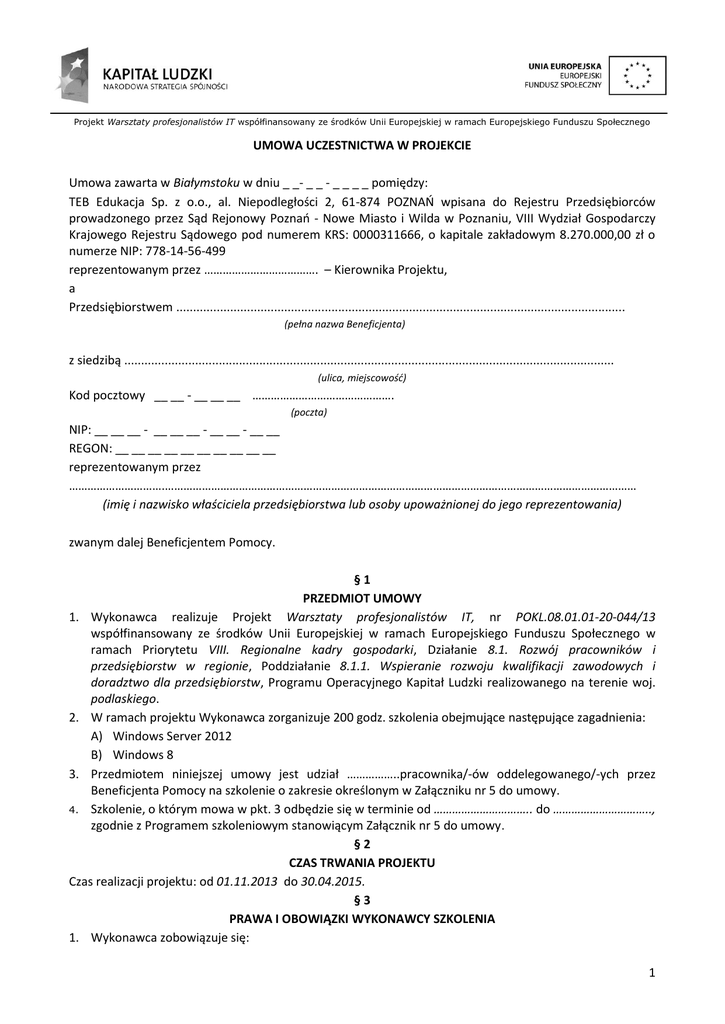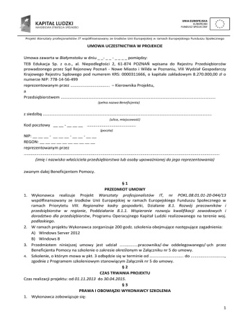 Projekt Warsztaty profesjonalistów IT współfinansowany ze środków Unii Europejskiej w ramach Europejskiego Funduszu Społecznego UMOWA UCZESTNICTWA W PROJEKCIE Umowa zawarta w Białymstoku w dniu _ _- _ _ - _ _ _ _ pomiędzy: TEB Edukacja Sp. z o.o., al. Niepodległości 2, 61-874 POZNAŃ wpisana do Rejestru Przedsiębiorców prowadzonego przez Sąd Rejonowy Poznań - Nowe Miasto i Wilda w Poznaniu, VIII Wydział Gospodarczy Krajowego Rejestru Sądowego pod numerem KRS: 0000311666, o kapitale zakładowym 8.270.000,00 zł o numerze NIP: 778-14-56-499 reprezentowanym przez ………………………………. – Kierownika Projektu, a Przedsiębiorstwem ..................................................................................................................................... (pełna nazwa Beneficjenta) z siedzibą ................................................................................................................................................. (ulica, miejscowość) Kod pocztowy __ __ - __ __ __ ………………………………………. (poczta) NIP: __ __ __ - __ __ __ - __ __ - __ __ REGON: __ __ __ __ __ __ __ __ __ __ reprezentowanym przez ………………………….……………………………………………………………………………………………………………………………………… (imię i nazwisko właściciela przedsiębiorstwa lub osoby upoważnionej do jego reprezentowania) zwanym dalej Beneficjentem Pomocy. §1 PRZEDMIOT UMOWY 1. Wykonawca realizuje Projekt Warsztaty profesjonalistów IT, nr POKL.08.01.01-20-044/13 współfinansowany ze środków Unii Europejskiej w ramach Europejskiego Funduszu Społecznego w ramach Priorytetu VIII. Regionalne kadry gospodarki, Działanie 8.1. Rozwój pracowników i przedsiębiorstw w regionie, Poddziałanie 8.1.1. Wspieranie rozwoju kwalifikacji zawodowych i doradztwo dla przedsiębiorstw, Programu Operacyjnego Kapitał Ludzki realizowanego na terenie woj. podlaskiego. 2. W ramach projektu Wykonawca zorganizuje 200 godz. szkolenia obejmujące następujące zagadnienia: A) Windows Server 2012 B) Windows 8 3. Przedmiotem niniejszej umowy jest udział ……………..pracownika/-ów oddelegowanego/-ych przez Beneficjenta Pomocy na szkolenie o zakresie określonym w Załączniku nr 5 do umowy. 4. Szkolenie, o którym mowa w pkt. 3 odbędzie się w terminie od ………………………….. do ………………………….., zgodnie z Programem szkoleniowym stanowiącym Załącznik nr 5 do umowy. §2 CZAS TRWANIA PROJEKTU Czas realizacji projektu: od 01.11.2013 do 30.04.2015. §3 PRAWA I OBOWIĄZKI WYKONAWCY SZKOLENIA 1. Wykonawca zobowiązuje się: 1 Projekt Warsztaty profesjonalistów IT współfinansowany ze środków Unii Europejskiej w ramach Europejskiego Funduszu Społecznego A) przeprowadzić cykl szkoleniowy zgodnie z programem szkolenia; B) zapewnić odpowiednie pomieszczenie do przeprowadzenia szkolenia; C) zapewnić kadrę dydaktyczną gwarantującą prawidłowy przebieg i realizację programu szkolenia; D) zapewnić Uczestnikom szkolenia catering podczas zajęć (podczas szkoleń całodziennych zapewniony będzie lunch i przerwa kawowa, natomiast w przypadku szkoleń popołudniowych wyłącznie przerwa kawowa); E) przekazać Uczestnikom materiały szkoleniowe i dydaktyczne; F) wystawić certyfikat potwierdzający udział w szkoleniu (pod warunkiem uczestnictwa w min. 80% zajęć); G) wystawić zaświadczenie o udzielonej pomocy de minimis; H) opłacić Uczestnikom egzaminy Microsoft po każdym zakończonym module szkolenia. 2. Wykonawca ma prawo do przeprowadzenia badania ankietowego ewaluacyjnego. 3. Wykonawca zastrzega sobie prawo do odwołania zajęć z przyczyn od siebie niezależnych. Jednocześnie zobowiązuje się do poinformowania Uczestników Projektu o wszelkich zaistniałych zmianach. §4 PRAWA I OBOWIĄZKI BENEFICJENTA 1. Beneficjent pomocy oświadcza, iż ma świadomość faktu, że jego osobisty udział lub udział jego pracowników w szkoleniu organizowanym przez Wykonawcę na podstawie niniejszej Umowy stanowi formę pomocy de minimis udzielonej Beneficjentowi z tytułu szkolenia. Pomoc ta zostanie udzielona 50 mikro, małym i średnim przedsiębiorstwom (i ich 96 pracownikom) posiadającym jednostkę organizacyjną na obszarze województwa podlaskiego i jednocześnie prowadzących działalność w następujących branżach wg PKD 2007: sektor oprogramowania komputerowego i technologii informatycznych: klasa 58.21, 58.29, 62.01; 2. 3. 4. 5. sektor technologii informacyjnych i komunikacyjnych: klasa 33.20, 62.02, 62.03, 62.09; grupa 63.1. sektor -przetwórstwa rolno - spożywczego: dział 10, dział 11; sektor maszynowy: dział 28, dział 29, dział 30; sektor metalowy: dział 24, dział 25; sektor drzewny i meblarski: dział 16, dział 31; sektor bieliźniarski: klasa 14.14; sektor artykułów i sprzętu medycznego: dział 21, grupa 26.6, klasa 30.92, grupa 32.5, klasa 46.46, klasa 47.73, klasa 47.74; Szacowana wartość udzielonej pomocy de minimis przypadająca na jedną osobę za udział w całości szkolenia wynosi 6 567,42zł (sześć tysięcy pięćset sześćdziesiąt siedem złotych 42/100) . Wartość udzielonej pomocy de minimis na dzień podpisania umowy (całkowity koszt uczestnictwa osób delegowanych przez Beneficjenta pomocy do udziału w szkoleniu) wynosi …….………………………………………… zł (6 567,42 zł x liczba pracowników oddelegowanych na szkolenie) Rzeczywista wysokość pomocy de minimis może ulec zmianie, ponieważ jest uzależniona od liczby zgłoszonych osób na dany termin szkolenia. O kwocie tej przedsiębiorstwo zostanie poinformowane po zakończeniu szkolenia. Beneficjent zobowiązuje się: A) przed podpisaniem niniejszej Umowy, zapoznać się z treścią Regulaminu organizacji i udziału w szkoleniu dostępnym w Biurze Projektu oraz na stronie internetowej Projektu http://profesjonalisc