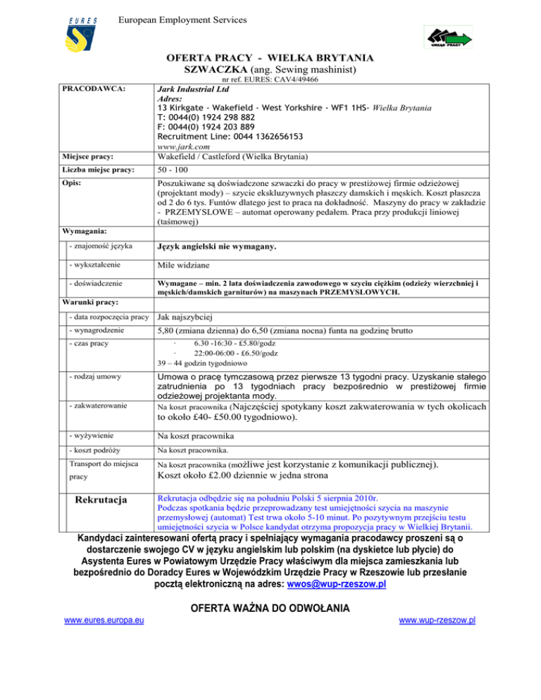 European Employment Services OFERTA PRACY - WIELKA BRYTANIA SZWACZKA (ang. Sewing mashinist) nr ref. EURES: CAV4/49466 PRACODAWCA: Miejsce pracy: Jark Industrial Ltd Adres: 13 Kirkgate - Wakefield - West Yorkshire - WF1 1HS- Wielka Brytania T: 0044(0) 1924 298 882 F: 0044(0) 1924 203 889 Recruitment Line: 0044 1362656153 www.jark.com Wakefield / Castleford (Wielka Brytania) Liczba miejsc pracy: 50 - 100 Opis: Poszukiwane są doświadczone szwaczki do pracy w prestiżowej firmie odzieżowej (projektant mody) – szycie ekskluzywnych płaszczy damskich i męskich. Koszt płaszcza od 2 do 6 tys. Funtów dlatego jest to praca na dokładność. Maszyny do pracy w zakładzie - PRZEMYSLOWE – automat operowany pedałem. Praca przy produkcji liniowej (taśmowej) Wymagania: - znajomość języka Język angielski nie wymagany. - wykształcenie Mile widziane - doświadczenie Wymagane – min. 2 lata doświadczenia zawodowego w szyciu ciężkim (odzieży wierzchniej i męskich/damskich garniturów) na maszynach PRZEMYSLOWYCH. Warunki pracy: - data rozpoczęcia pracy Jak najszybciej - wynagrodzenie 5,80 (zmiana dzienna) do 6,50 (zmiana nocna) funta na godzinę brutto - czas pracy · 6.30 -16:30 - £5.80/godz · 22:00-06:00 - £6.50/godz 39 – 44 godzin tygodniowo - rodzaj umowy Umowa o pracę tymczasową przez pierwsze 13 tygodni pracy. Uzyskanie stałego zatrudnienia po 13 tygodniach pracy bezpośrednio w prestiżowej firmie odzieżowej projektanta mody. - zakwaterowanie Na koszt pracownika (Najczęściej - wyżywienie Na koszt pracownika - koszt podróży Na koszt pracownika. Transport do miejsca Na koszt pracownika (możliwe pracy Rekrutacja spotykany koszt zakwaterowania w tych okolicach to około £40- £50.00 tygodniowo). jest korzystanie z komunikacji publicznej). Koszt około £2.00 dziennie w jedna strona Rekrutacja odbędzie się na południu Polski 5 sierpnia 2010r. Podczas spotkania będzie przeprowadzany test umiejętności szycia na maszynie przemysłowej (automat) Test trwa około 5-10 minut. Po pozytywnym przejściu testu umiejętności szycia w Polsce kandydat otrzyma propozycja pracy w Wielkiej Brytanii. Kandydaci zainteresowani ofertą pracy i spełniający wymagania pracodawcy proszeni są o dostarczenie swojego CV w języku angielskim lub polskim (na dyskietce lub płycie) do Asystenta Eures w Powiatowym Urzędzie Pracy właściwym dla miejsca zamieszkania lub bezpośrednio do Doradcy Eures w Wojewódzkim Urzędzie Pracy w Rzeszowie lub przesłanie pocztą elektroniczną na adres: [email protected] OFERTA WAŻNA DO ODWOŁANIA www.eures.europa.eu www.wup-rzeszow.pl