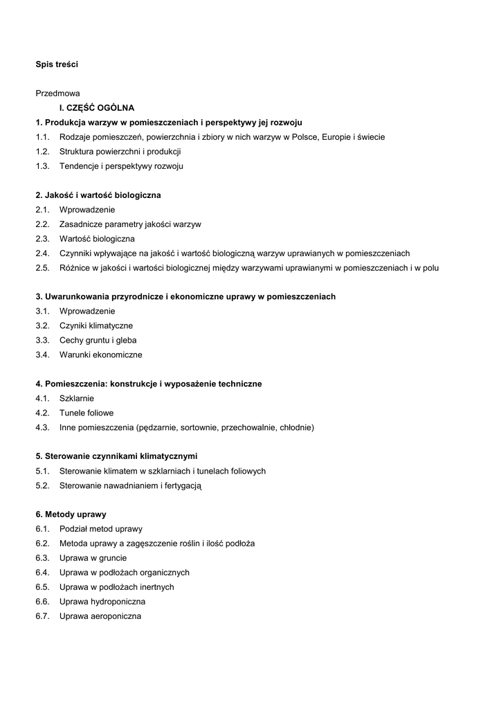 Spis treści Przedmowa I. CZĘŚĆ OGÓLNA 1. Produkcja warzyw w pomieszczeniach i perspektywy jej rozwoju 1.1. Rodzaje pomieszczeń, powierzchnia i zbiory w nich warzyw w Polsce, Europie i świecie 1.2. Struktura powierzchni i produkcji 1.3. Tendencje i perspektywy rozwoju 2. Jakość i wartość biologiczna 2.1. Wprowadzenie 2.2. Zasadnicze parametry jakości warzyw 2.3. Wartość biologiczna 2.4. Czynniki wpływające na jakość i wartość biologiczną warzyw uprawianych w pomieszczeniach 2.5. RóŜnice w jakości i wartości biologicznej między warzywami uprawianymi w pomieszczeniach i w polu 3. Uwarunkowania przyrodnicze i ekonomiczne uprawy w pomieszczeniach 3.1. Wprowadzenie 3.2. Czyniki klimatyczne 3.3. Cechy gruntu i gleba 3.4. Warunki ekonomiczne 4. Pomieszczenia: konstrukcje i wyposaŜenie techniczne 4.1. Szklarnie 4.2. Tunele foliowe 4.3. Inne pomieszczenia (pędzarnie, sortownie, przechowalnie, chłodnie) 5. Sterowanie czynnikami klimatycznymi 5.1. Sterowanie klimatem w szklarniach i tunelach foliowych 5.2. Sterowanie nawadnianiem i fertygacją 6. Metody uprawy 6.1. Podział metod uprawy 6.2. Metoda uprawy a zagęszczenie roślin i ilość podłoŜa 6.3. Uprawa w gruncie 6.4. Uprawa w podłoŜach organicznych 6.5. Uprawa w podłoŜach inertnych 6.6. Uprawa hydroponiczna 6.7. Uprawa aeroponiczna 7. PodłoŜa 7.1. PodłoŜa w uprawie warzyw 8. śywienie roślin 8.1. Składniki pokarmowe oraz kryteria niezbędności 8.2. Klasyfikacja składników pokarmowych 8.3. Formy pobierania składników pokarmowych przez rośliny 8.4. Ruch jonów w środowisku korzeniowym 8.5. Forma przyswajalna i dostępna składnika w glebie 8.6. Roztwór glebowy 8.7. Transport składników pokarmowych w roślinie 8.8. Podstawowe funkcja makro- i mikroelementów w roślinach 8.9. Nowe liczby graniczne dla uprawy warzyw pod osłonami 8.10. PoŜywki dla uprawy wybranych roślin warzywnych w podłoŜach inertnych 8.11. Zamknięty system nawoŜenia 9. Produkcja rozsady 9.1. Cel produkcji rozsady 9.2. Warunki produkcji rozsady 9.3. PodłoŜa i pojemniki do produkcji rozsady 9.4. Technologia produkcji rozsady 10. Zabiegi pielęgnacyjne 10.1. Prowadzenie roślin 10.2. Stosowanie biostymulatorów 10.3. Zapylanie 10.4. Hormonizacja 10.5. Dokarmianie dwutlenkiem węgla 10.6. Wietrzenie 10.7. Doświetlanie 10.8. Cieniowanie 11. Ochrona warzyw w pomieszczeniach 11.1. Zasady ogólne 11.2. Metody o charakterze zapobiegawczym 11.3. Metody bezpośredniego zwalczania 11.4. Sposoby stosowania chemicznych środków ochrony roślin 11.5. Integrowana ochrona 12. Zbiory, traktowanie posprzętne, przechowywanie 12.1. Procesy zachodzące w czasie dojrzewania 12.2. Technika zbiorów 12.3. Traktowanie pozbiorcze 12.4. Przechowywanie II. CZĘŚĆ SZCZEGÓŁOWA 1. Pomidor – Lycopersicon esculentum Mill. 1.1. Charakterystyka rośliny 1.2. Cechy odmianowe 1.3. Metody uprawy i podłoŜe 1.4. Warunki wzrostu i rozwoju 1.5. Terminy uprawy 1.6. Wymagania pokarmowe i potrzeby nawozowe 1.7. Produkcja rozsady 1.8. Technologia uprawy 1.9. Zbiór i przygotowanie owoców do obrotu 1.10. Przechowywanie owoców pomidora 1.11. Choroby i szkodniki 2. Papryka – Capsicum annuum L. 2.1. Charakterystyka rośliny 2.2. Cechy odmianowe 2.3. Metody uprawy, podłoŜa, pojemniki 2.4. Warunki wzrostu i rozwoju 2.5. Terminy uprawy 2.6. Wymagania pokarmowe I potrzeby nawozowe 2.7. Produkcja rozsady 2.8. Technologia uprawy 2.9. Zbiór i przygotowanie do obrotu 2.10. Przechowywanie 2.11. Choroby i szkodniki 3. OberŜyna – Solanum melongena L 3.1. Charakterystyka rośliny 3.2. Cechy odmianowe 3.3. Metody uprawy 3.4. Warunki wzrostu i rozwoju 3.5. Terminy uprawy 3.6. Wymagania pokarmowe i potrzeby nawozowe 3.7. Produkcja rozsady 3.8. Technologia uprawy 3.9. Zbiór i przygotowanie do obrotu 3.10. Przechowywanie 3.11. Choroby i szkodniki 4. Ogórek – Cucumis sativus L. 4.1. Charakterystyka rośliny 4.2. Cechy odmianowe 4.3. Metody uprawy 4.4. Warunki wzrostu i rozwoju 4.5. Terminy uprawy 4.6. Wymagania pokarmowe i potrzeby nawozowe 4.7. Produkcja rozsady 4.8. Technologia uprawy 4.9. Zbiory i przygotowanie do obrotu 4.10. Przechowywanie 4.11. Choroby i szkodniki 5. Melon – Cucumis melo L. 5.1. Charakterystyka rośliny 5.2. Cechy odmianowe 5.3. Warunki wzrostu i rozwoju 5.4. Terminy uprawy 5.5. Wymagania pokarmowe i potrzeby nawozowe 5.6. Produkcja rozsady 5.7. Technologia uprawy 5.8. Zbiór i przygotowanie do obrotu 5.9. Przechowywanie 5.10. Choroby i szkodniki 6. Sałata – Lactuca sativa L. 6.1. Charakterystyka rośliny 6.2. Cechy odmianowe 6.3. Metody uprawy 6.4. Warunki wzrostu i rozwoju 6.5. Terminy uprawy 6.6. Wymagania pokarmowe i potrzeby nawozowe 6.7. Produkcja rozsady 6.8. Technologia uprawy 6.9. Zbiór i przygotowanie do obrotu 6.10. Przechowywanie 6.11. Choroby i szkodniki 7. Rzodkiewka – Raphanus radicula Pers. 7.1. Charakterystyka rośliny 7.2. Cechy odmianowe 7.3. Warunki wzrostu i rozwoju 7.4. Terminy uprawy 7.5. Wymagania pokarmowe i potrzeby nawozowe 7.6. Technologia uprawy 7.7. Zbiór i przygotowanie do obrotu 7.8. Choroby i szkodniki 8. Rzodkiew uprawna – Raphanus sativus L. var. niger i 8.1. Charakterystyka rośliny 8.2. Cechy odmianowe 8.3. Metody uprawy 8.4. Warunki wzrostu i rozwoju 8.5. Wymagania pokarmowe i potrzeby nawozowe 8.6. Zbiór i przygotowanie do obrotu 8.7. Choroby i szkodniki 9. Warzywa kapustne 9.1. Kapusta głowiasta biała – Brassica oleracea var. gongylodes L. 9.2. Kalafior – Brassica oleracea var botrytis L. Subvar. cauliflora 9.3. Kalarepa – Brassica oleracea var gongylodes L. 9.4. Kapusta pekińska – Brassica pekinensis Rupr. 9.5. Brokuł – Brassica oleracea var botrytis subvar. Asparagoides L. 10. Fasola – Phaseolus vulgaris L. 10.1. Charakterystyka rośliny 10.2. Cechy odmianowe 10.3. Metody uprawy 10.4 Warunki wzrostu i rozwoju 10.5. Wymagania pokarmowe i potrzeby nawozowe 10.6 Choroby i szkodniki 11. Truskawka – Fragaria x ananasa Duch. 11.1. Charakterystyka rośliny 11.2. Cechy odmianow