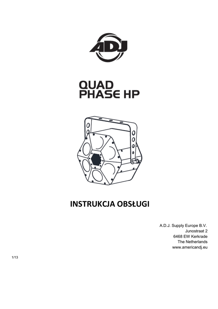 INSTRUKCJA OBSŁUGI A.D.J. Supply Europe B.V. Junostraat 2 6468 EW Kerkrade The Netherlands www.americandj.eu 1/13 Spis treści INFORMACJE OGÓLNE ............................................................................................................................................................ 3 INSTRUKCJE OGÓLNE .............................................................................................................................................................. 3 CECHY...................................................................................................................................................................................... 3 BEZPIECZNA OBSŁUGA ............................................................................................................................................................ 3 ŚRODKI BEZPIECZEŃSTWA ...................................................................................................................................................... 4 USTAWIENIA ........................................................................................................................................................................... 4 INSTALACJA ............................................................................................................................................................................. 6 MENU SYSTEMU ..................................................................................................................................................................... 6 DZIAŁANIE ............................................................................................................................................................................... 8 POŁĄCZENIE SZEREGOWE ....................................................................................................................................................... 9 STEROWANIE KONSOLĄ UC3 .................................................................................................................................................. 9 WARTOŚCI I FUNKCJE DMX ................................................................................................................................................... 10 DZIAŁANIE ADJ-RC1............................................................................................................................................................... 11 WYMIANA BEZPIECZNIKA ..................................................................................................................................................... 11 CZYSZCZENIE ......................................................................................................................................................................... 11 USUWANIE USTEREK............................................................................................................................................................. 11 SPECYFIKACJA ....................................................................................................................................................................... 12 ROHS - Ważny wkład w ochronę środowiska ....................................................................................................................... 13 WEEE – Utylizacja odpadów elektrycznych i elektronicznych .............................................................................................. 14 UWAGI .................................................................................................................................................................................. 15 A.D.J. Supply Europe B.V. – www.americandj.eu – Quad Phase HP Instrukcja Obsługi Strona 2 INFORMACJE OGÓLNE Wypakowanie: Dziękujemy za zakup Quad Phase HP firmy ADJ Products, LLC. Każdy egzemplarz Quad Phase HP został gruntownie przetestowany, co jest gwarancją jego prawidłowego funkcjonowania. Należy dokładnie sprawdzić czy opakowanie nie posiada uszkodzeń powstałych w czasie transportu. W razie stwierdzenia uszkodzenia opakowania, dokładnie sprawdź, czy nie nastąpiło uszkodzenie sprzętu oraz upewnij się, że wszystkie części konieczne do obsługi urządzenia przybyły w stanie nienaruszonym. W razie stwierdzenia uszkodzeń lub braku części, należy skontaktować się z wsparciem klienta poprzez nasz bezpłatny numer. Prosimy o taki kontakt przed podjęciem decyzji o zwrocie urządzenia do sprzedawcy. Wstęp: Quad Phase HP to czterokanałowy, sterowany DMX Efekt Moonflower. Urządzenie może być używane samodzielnie w trybie Stand Alone lub w konfiguracji Master/Slave. Quad Phase HP posiada dwa tryby pracy: reakcja na dźwięk i Sterowanie DMX. W celu osiągnięcia lepszych efektów poprzez poprawienie widoczności projektowanej wiązki światła, należy równocześnie użyć maszyny mgielnej lub dymu do efektów specjalnych. Obsługa klienta: W razie jakichkolwiek problemów, prosimy o kontakt z zaufanym punktem sprzedaży American Audio. Istnieje również możliwość bezpośredniego kontaktu z nami. Można to zrobić poprzez naszą stronę internetową www.americandj.eu oraz pisząc na adres: [email protected]. Ostrzeżenie! Aby zapobiec lub zmniejszyć ryzyko porażenia prądem lub pożaru, nie włączaj urządzenia w warunkach deszczowych lub przy podwyższonej wilgotności powietrza. Uwaga! Urządzenie może uszkodzić wzrok. Nie należy nigdy patrzeć bezpośrednio na źródło światła! Należy zachować rozsądek i uwagę. INSTRUKCJE OGÓLNE Aby w pełni wykorzystać możliwości urządzenia, prosimy o przeczytanie instrukcji obsługi i zapoznanie się z podstawowymi funkcjami urządzenia. Instrukcja zawiera ważne informacje dotyczące bezpieczeństwa obsługi oraz sposobu konserwacji urządzenia. Prosimy o zachowanie instrukcji obsługi w celu ponownego użycia. CECHY • Kompatybilny z Protokołem DMX-5