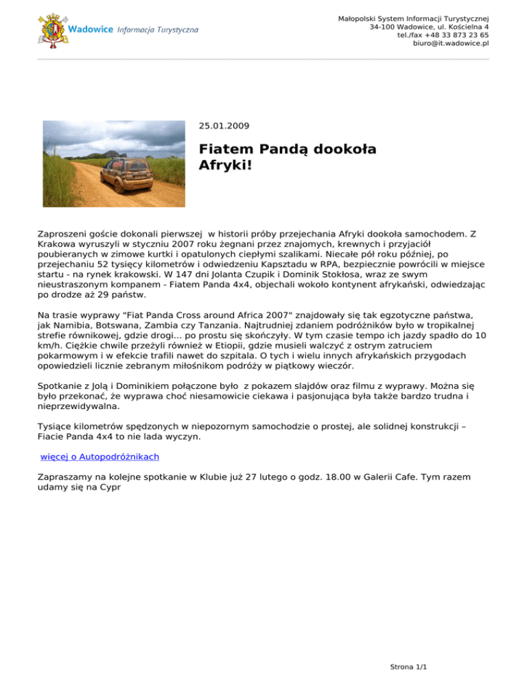 Małopolski System Informacji Turystycznej 34-100 Wadowice, ul. Kościelna 4 tel./fax +48 33 873 23 65 [email protected] 25.01.2009 Fiatem Pandą dookoła Afryki! Zaproszeni goście dokonali pierwszej w historii próby przejechania Afryki dookoła samochodem. Z Krakowa wyruszyli w styczniu 2007 roku żegnani przez znajomych, krewnych i przyjaciół poubieranych w zimowe kurtki i opatulonych ciepłymi szalikami. Niecałe pół roku później, po przejechaniu 52 tysięcy kilometrów i odwiedzeniu Kapsztadu w RPA, bezpiecznie powrócili w miejsce startu - na rynek krakowski. W 147 dni Jolanta Czupik i Dominik Stokłosa, wraz ze swym nieustraszonym kompanem - Fiatem Panda 4x4, objechali wokoło kontynent afrykański, odwiedzając po drodze aż 29 państw. Na trasie wyprawy "Fiat Panda Cross around Africa 2007" znajdowały się tak egzotyczne państwa, jak Namibia, Botswana, Zambia czy Tanzania. Najtrudniej zdaniem podróżników było w tropikalnej strefie równikowej, gdzie drogi... po prostu się skończyły. W tym czasie tempo ich jazdy spadło do 10 km/h. Ciężkie chwile przeżyli również w Etiopii, gdzie musieli walczyć z ostrym zatruciem pokarmowym i w efekcie trafili nawet do szpitala. O tych i wielu innych afrykańskich przygodach opowiedzieli licznie zebranym miłośnikom podróży w piątkowy wieczór. Spotkanie z Jolą i Dominikiem połączone było z pokazem slajdów oraz filmu z wyprawy. Można się było przekonać, że wyprawa choć niesamowicie ciekawa i pasjonująca była także bardzo trudna i nieprzewidywalna. Tysiące kilometrów spędzonych w niepozornym samochodzie o prostej, ale solidnej konstrukcji – Fiacie Panda 4x4 to nie lada wyczyn. więcej o Autopodróżnikach Zapraszamy na kolejne spotkanie w Klubie już 27 lutego o godz. 18.00 w Galerii Cafe. Tym razem udamy się na Cypr Strona 1/1 Powered by TCPDF (www.tcpdf.org)