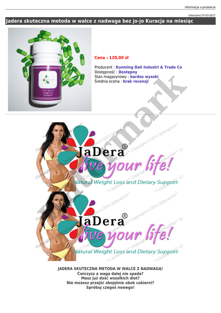 Informacje o produkcie Utworzono 07-03-2017 Jadera skuteczna metoda w walce z nadwaga bez jo-jo Kuracja na miesiąc Cena : 120,00 zł w at er m ar k Producent : Kunming Dali Industri & Trade Co Dostępność : Dostępny Stan magazynowy : bardzo wysoki Średnia ocena : brak recenzji JADERA SKUTECZNA METODA W WALCE Z NADWAGĄ! Ćwiczysz a waga dalej nie spada? Masz już dość wszelkich diet? Nie możesz przejść obojętnie obok cukierni? Spróbuj czegoś nowego! Środek tłumi łaknienie a jednocześnie ma działanie termogeniczne polegające na spalaniu tkanki tłuszczowej pod wpływem zwiększonej temperatury.Preparat podnosi efektywność metabolizmu tłuszczu i podstawowego metabolizmu(BMR) tzn.wzmaga energie organizmu,co jest powodem rozkładu odkłądanej tkanki tłuszczowej na ciepłote,dwutlenek węgla i wode. Opakowanie zawiera 30 tab DZIAŁANIE: - Skuteczna blokada łaknienia - Spalanie tkanki tłuszczowej - Pobudzenie metabolizmu - Blokada przyswajania cukrów er m ar k Przy powyższym działaniu uzyskujemy spadek masy ciała 5-10 kg w 30 dni DOZOWANIE: 1 kapsułka dziennie Podczas stosowania w/w preparatów zaleca się picie wody, minimum 2,5 litra wody dziennie(najlepiej niegazowanej) Kuracja odchudzająca może trwać tak długo jak długo widoczne są efekty odchudzania, można ją powtarzać wielokrotnie po zastosowaniu 1 tygodniowej przerwy. Podczas stosowania preparatów nie należy stosować głodówek. Kuracja nie wymaga specjalnej diety. PRZECIWWSKAZANIA: w at 1. Nadciśnienie tętnicze. 2. Choroby serca. 3. Ciąża i okres karmienia piersią. 4. Równoległe stosowanie leków: - przeciwdepresyjnych, - przeciwgrzybicznych, - przeciwnowotworowych, - przeciwparkinsonowskich, - neuroleptyków, - przeciwmigrenowych, - silnych leków przeciwbólowych, - zawierających efedryne 5. Cukrzyca. 6. Nadczynność i niedoczynność tarczycy. 7. Apopleksja. 8. Nie mogą stosować osoby: - cierpiące na choroby układu nerwowego, np. psychozy, depresja, parkinsonizm, bulimia - leczą się z powodu choroby wieńcowej - stwierdzono u nich choroby naczyń - przebyli udary - cierpią na niewydolność wątroby, nerek, przerost gruczołu krokowego, jaskrę - są uzależnione od leków lub alkoholu,