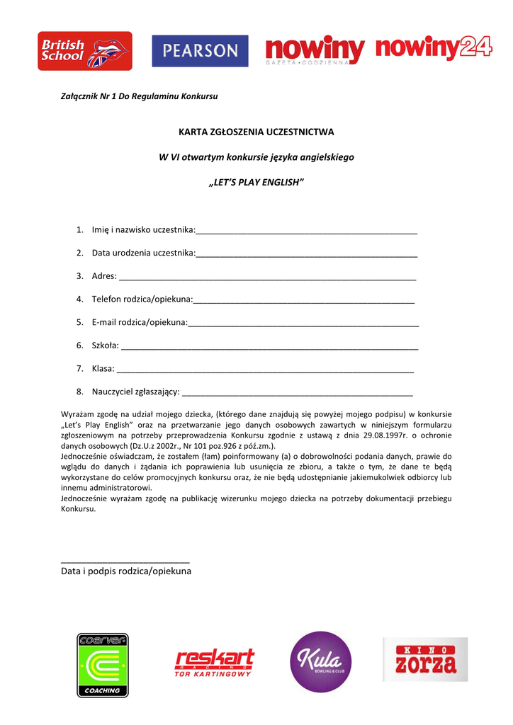 Załącznik Nr 1 Do Regulaminu Konkursu KARTA ZGŁOSZENIA UCZESTNICTWA W VI otwartym konkursie języka angielskiego „LET’S PLAY ENGLISH” 1. Imię i nazwisko uczestnika:_______________________________________________ 2. Data urodzenia uczestnika:_______________________________________________ 3. Adres: _______________________________________________________________ 4. Telefon rodzica/opiekuna:_______________________________________________ 5. E-mail rodzica/opiekuna:_________________________________________________ 6. Szkoła: _______________________________________________________________ 7. Klasa: _______________________________________________________________ 8. Nauczyciel zgłaszający: _________________________________________________ Wyrażam zgodę na udział mojego dziecka, (którego dane znajdują się powyżej mojego podpisu) w konkursie „Let’s Play English” oraz na przetwarzanie jego danych osobowych zawartych w niniejszym formularzu zgłoszeniowym na potrzeby przeprowadzenia Konkursu zgodnie z ustawą z dnia 29.08.1997r. o ochronie danych osobowych (Dz.U.z 2002r., Nr 101 poz.926 z póź.zm.). Jednocześnie oświadczam, że zostałem (łam) poinformowany (a) o dobrowolności podania danych, prawie do wglądu do danych i żądania ich poprawienia lub usunięcia ze zbioru, a także o tym, że dane te będą wykorzystane do celów promocyjnych konkursu oraz, że nie będą udostępnianie jakiemukolwiek odbiorcy lub innemu administratorowi. Jednocześnie wyrażam zgodę na publikację wizerunku mojego dziecka na potrzeby dokumentacji przebiegu Konkursu. _________________________ Data i podpis rodzica/opiekuna