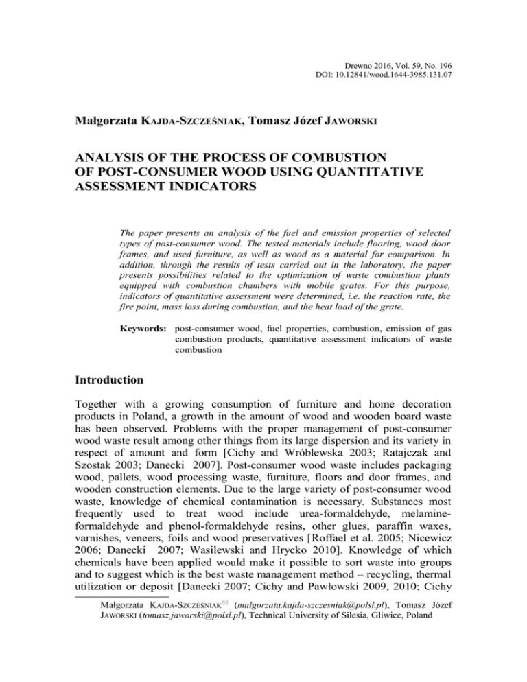 Drewno 2016, Vol. 59, No. 196 DOI: 10.12841/wood.1644-3985.131.07 Małgorzata KAJDA-SZCZEŚNIAK, Tomasz Józef JAWORSKI ANALYSIS OF THE PROCESS OF COMBUSTION OF POST-CONSUMER WOOD USING QUANTITATIVE ASSESSMENT INDICATORS The paper presents an analysis of the fuel and emission properties of selected types of post-consumer wood. The tested materials include flooring, wood door frames, and used furniture, as well as wood as a material for comparison. In addition, through the results of tests carried out in the laboratory, the paper presents possibilities related to the optimization of waste combustion plants equipped with combustion chambers with mobile grates. For this purpose, indicators of quantitative assessment were determined, i.e. the reaction rate, the fire point, mass loss during combustion, and the heat load of the grate. Keywords: post-consumer wood, fuel properties, combustion, emission of gas combustion products, quantitative assessment indicators of waste combustion Introduction Together with a growing consumption of furniture and home decoration products in Poland, a growth in the amount of wood and wooden board waste has been observed. Problems with the proper management of post-consumer wood waste result among other things from its large dispersion and its variety in respect of amount and form [Cichy and Wróblewska 2003; Ratajczak and Szostak 2003; Danecki 2007]. Post-consumer wood waste includes packaging wood, pallets, wood processing waste, furniture, floors and door frames, and wooden construction elements. Due to the large variety of post-consumer wood waste, knowledge of chemical contamination is necessary. Substances most frequently used to treat wood include urea-formaldehyde, melamineformaldehyde and phenol-formaldehyde resins, other glues, paraffin waxes, varnishes, veneers, foils and wood preservatives [Roffael et al. 2005; Nicewicz 2006; Danecki 2007; Wasilewski and Hrycko 2010]. Knowledge of which chemicals have been applied would make it possible to sort waste into groups and to suggest which is the best waste management method – recycling, thermal utilization or deposit [Danecki 2007; Cichy and Pawłowski 2009, 2010; Cichy Małgorzata KAJDA-SZCZEŚNIAK ([email protected]), Tomasz Józef JAWORSKI ([email protected]), Technical University of Silesia, Gliwice, Poland 92 Małgorzata KAJDA-SZCZEŚNIAK , Tomasz Józef JAWORSKI 2012; Nicewicz et al. 2012; Klimczewski and Nicewicz 2013; Wan et al. 2014]. This is an important issue, because in Poland an increase of 4% in the demand for wood and wood-like products has been observed. At the same time, a decrease in wood resources has been accompanied by an increase in wood and wood-like waste [3spare: reading on 29.05.2015]. It is estimated that the supply of post-consumer wood which comes only from the replacement of furniture and interior furnishings amounts to approximately 1.44-1.68 Mio m3 per year. On the basis of European indicators of the post-consumer wood market, it may be assumed that with the acquisition in 2005 of 29.7 Mio m3 of wood from forests, the amount of post-consumer wood for reuse in the period of one year would reach 2.8 Mio m3 and 5.7 Mio m3 for energy use [Danecki 2007]. The appropriate management of such wood waste could significantly contribute to a limitation of forest logging, a decrease in the amount of waste directed to landfills, and the recovery of energy and raw materials [3spare: reading on 29.05.2015]. One method for recovering energy from biomass and wood waste is combustion or co-combustion with traditional fuel. The combustion process seems to be simple. However, in reality, it is a complex process due to a number of physical and chemical phenomena taking place during combustion. The combustion of waste in industrial plants has been carried out for nearly 100 years. The characteristics of this process are totally different from those in the combustion of conventional fuels, such as coal or lignite. These differences are caused by the heterogenic content of waste, the large graining variety (different fractions) and regional and seasonal variations in the physiochemical properties of the waste. The combustion of waste is characterized by an unspecified and non-homogeneous process, as well as by the generation of detrimental substances. The possible, detrimental consequences of this process consist of slag formation, as well as the corrosion and erosion of the combustion device. Hence, it is necessary to assure constant optimization of the waste combustion plant operation [Marutzky and Schriever 1986; Nussbaumer 2003; Jaworski 2005, 2007; Cichy 2012; Nadziakiewicz et. al. 2012; Czop 2014; KajdaSzcześniak and Nowak 2014]. Due to the above, this article deals with the issues related to the optimization of the combustion process, the goal of which is to decrease the risk of detrimental impact on the natural environment. Tests were carried out in the laboratory and they were pertained to a real combustion plant with application of quantitative assessment indicators. Indicators of quantitative evaluation of waste combustion The replacement of classic fuels with fuels based on wood waste allows, on the one hand, a reduction in CO 2 emissions (especially in respect of biodegradable mass, for example biomass) and, on the other, helps to avoid the deposition of natural fuels, following the rules of sustainable development. For the thermal Analysis of the process of combustion of post-consumer wood... 93 disposal of fuels produced from wood waste in incineration or heat plants operating with coal and biomass, etc, it is necessary to define and determine certain characteristic indicators in order to evaluate the combustion process. These indicators should serve as a basis for a comparison between waste fuels and with classic fuels. In addition, perhaps more importantly, they could serve as some sort of “criteria numbers” allowing the transfer of values from the laboratory device, which w