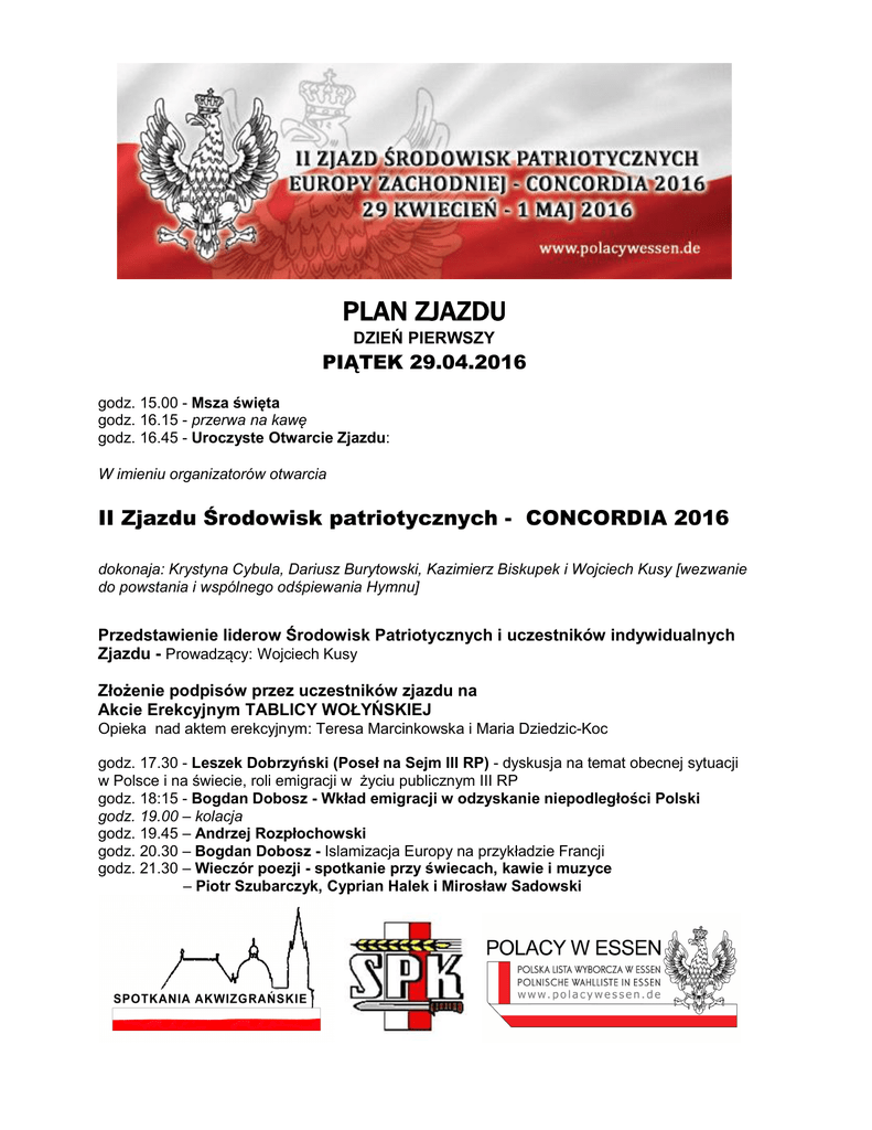PLAN ZJAZDU DZIEŃ PIERWSZY PIĄTEK 29.04.2016 godz. 15.00 - Msza święta godz. 16.15 - przerwa na kawę godz. 16.45 - Uroczyste Otwarcie Zjazdu: W imieniu organizatorów otwarcia II Zjazdu Środowisk patriotycznych - CONCORDIA 2016 dokonaja: Krystyna Cybula, Dariusz Burytowski, Kazimierz Biskupek i Wojciech Kusy [wezwanie do powstania i wspólnego odśpiewania Hymnu] Przedstawienie liderow Środowisk Patriotycznych i uczestników indywidualnych Zjazdu - Prowadzący: Wojciech Kusy Złożenie podpisów przez uczestników zjazdu na Akcie Erekcyjnym TABLICY WOŁYŃSKIEJ Opieka nad aktem erekcyjnym: Teresa Marcinkowska i Maria Dziedzic-Koc godz. 17.30 - Leszek Dobrzyński (Poseł na Sejm III RP) - dyskusja na temat obecnej sytuacji w Polsce i na świecie, roli emigracji w życiu publicznym III RP godz. 18:15 - Bogdan Dobosz - Wkład emigracji w odzyskanie niepodległości Polski godz. 19.00 – kolacja godz. 19.45 – Andrzej Rozpłochowski godz. 20.30 – Bogdan Dobosz - Islamizacja Europy na przykładzie Francji godz. 21.30 – Wieczór poezji - spotkanie przy świecach, kawie i muzyce – Piotr Szubarczyk, Cyprian Halek i Mirosław Sadowski 23.30 - KINO NOCNYCH MARKÓW Z ARCHIWUM IPN - filmy dokumentalne o Wołyniu CRISTIADA – film meksykański TAJEMNICA TAJEMNIC - prawdziwa historia ocalenia Polski i świata. POLACY - film w reżyserii Marii Dłużewskiej [...Inne propozycje] DZIEŃ DRUGI SOBOTA 30 kwietnia 2016 r. godz. 8.00 - 9.00 śniadanie godz. 9.15 – Mariusz Krzysztofiński – IPN Rzeszów – wykład i uroczyste otwarcie wystawy o ks. abp. Ignacym Tokarczuku „Nie wolno zdradzić Ewangelii” godz. 10.30 – Tomasz Bereza – IPN Rzeszów – Wołyń 1943 godz. 12.00-13.00 – obiad godz. 13.15 – Piotr Szubarczyk – IPN, Biuro Edukacji Publicznej, Gdańsk godz. 14.20 - Anna Kołakowska – źródła ukraińskiego nacjonalizmu / wykład autorski godz. 15.30 - Ks. Isakowicz-Zaleski – Wołyń i Kresy II RP godz. 16.30 - przerwa na kawę godz. 17.00 – ODSŁONIĘCIE TABLICY WOŁYŃSKIEJ Laudacja: Tomasz Bereza – IPN Rzeszów Piotr Szubarczyk IPN Gdańsk Ks. Isakowicz-Zaleski (prowadzenie: Bożena Wisłocka - Polska Lista Wyborcza „Polacy w Essen” i Ala Bona - Spotkania Akwizgrańskie) Umieszczenie Aktu Erekcyjnego w postumencie TABLICY WOLYNSKIEJ Dariusz Butyrowski, Zbigniew J. Kowalik i Jarosław Kardela Ks. Isakowicz-Zaleski - poświęcenie TABLICY WOŁYŃSKIEJ godz. 18.00 – Andrzej Kołakowski – recital autorski godz. 19.30 - ognisko, wspólny grill (kolacja) i śpiewanie pieśni patriotycznych. DZIEŃ TRZECI NIEDZIELA 01.05.2016 godz. 8.00 - 9.00 – śniadanie godz. 9.30 – Bogdan Dobosz - „Islamizacja Europy na przykładzie Francji” gody. 11.15 - Organizatorzy – Podsumowanie i sformułowanie komunikatu w imieniu wszystkich zebranych uczestników Zjazdu godz. 12.00 - Uroczysta Msza święta [zakończona hymnem “Boże coś Polskę” – rozdać teksty]. godz. 13.15 - wspólne zdjęcie wszystkich uczestników Zjazdu godz. 13.30 – obiad oraz możliwość zamówienia kawy i ciasta godz. 14.15 - Raport finansowy wszystkich wpływów i wydatków organizacji zjazdu – Wojciech Kusy –– przewodniczący Polskiej Listy Wyborczej w Essen godz. 14.30 - Zakończenie II Zjazdu Środowisk Patriotycznych Europy Zachodniej wspólnym śpiewem i opuszczenie Ośrodka CONCORDIA. Organizatorzy zastrzegają sobie prawo do zmian programowych wynikających z uwarunkowań niezależnych od nich samych .