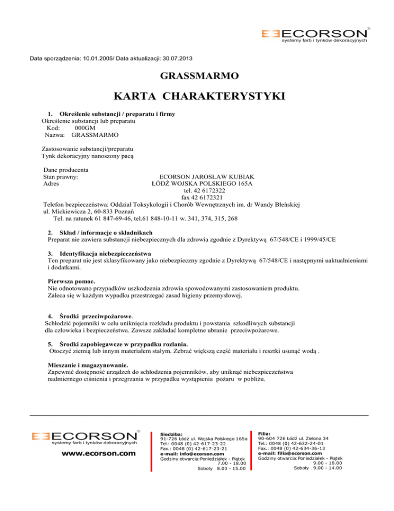 Data sporządzenia: 10.01.2005/ Data aktualizacji: 30.07.2013 GRASSMARMO KARTA CHARAKTERYSTYKI 1. Określenie substancji / preparatu i firmy Określenie substancji lub preparatu Kod: 000GM Nazwa: GRASSMARMO Zastosowanie substancji/preparatu Tynk dekoracyjny nanoszony pacą Dane producenta Stan prawny: Adres ECORSON JAROSŁAW KUBIAK ŁÓDŹ WOJSKA POLSKIEGO 165A tel. 42 6172322 fax 42 6172321 Telefon bezpieczeństwa: Oddział Toksykologii i Chorób Wewnętrznych im. dr Wandy Błeńskiej ul. Mickiewicza 2, 60-833 Poznań Tel. na ratunek 61 847-69-46, tel.61 848-10-11 w. 341, 374, 315, 268 2. Skład / informacje o składnikach Preparat nie zawiera substancji niebezpiecznych dla zdrowia zgodnie z Dyrektywą 67/548/CE i 1999/45/CE 3. Identyfikacja niebezpieczeństwa Ten preparat nie jest sklasyfikowany jako niebezpieczny zgodnie z Dyrektywą 67/548/CE i następnymi uaktualnieniami i dodatkami. Pierwsza pomoc. Nie odnotowano przypadków uszkodzenia zdrowia spowodowanymi zastosowaniem produktu. Zaleca się w każdym wypadku przestrzegać zasad higieny przemysłowej. 4. Środki przeciwpożarowe. Schłodzić pojemniki w celu uniknięcia rozkładu produktu i powstania szkodliwych substancji dla człowieka i bezpieczeństwa. Zawsze zakładać kompletne ubranie przeciwpożarowe. 5. Środki zapobiegawcze w przypadku rozlania. Otoczyć ziemią lub innym materiałem stałym. Zebrać większą część materiału i resztki usunąć wodą . Mieszanie i magazynowanie. Zapewnić dostępność urządzeń do schłodzenia pojemników, aby uniknąć niebezpieczeństwa nadmiernego ciśnienia i przegrzania w przypadku wystąpienia pożaru w pobliżu. __________________________________________________________________________________________ w w w .e c o rs o n .co m www.ecorson.com Siedziba: 91-726 Łódź ul. Wojska Polskiego 165a Tel.: 0048 (0) 42-617-23-22 Fax.: 0048 (0) 42-617-23-21 e-mail: [email protected] Godziny otwarcia:Poniedziałek - Piątek 7.00 - 18.00 Soboty 8.00 - 15.00 Filia: 90-604 726 Łódź ul. Zielona 34 Tel.: 0048 (0) 42-632-24-01 Fax.: 0048 (0) 42-634-36-13 e-mail: [email protected] Godziny otwarcia:Poniedziałek - Piątek 9.00 - 18.00 Soboty 9.00 - 14.00 6. Ochrona indywidualna / kontrola ekspozycji Przestrzegać zasad higieny przemysłowej, stosując odpowiednie środki ochrony osobistej , jak rękawice i wszystko do pracy. Nie jeść nie palić podczas pracy, myć ręce przed jedzeniem i po skończonej pracy. Zaleca się przeprowadzić badania medyczne w okresie i z częstotliwością określoną w przepisach medycznych. 7. Właściwości fizyczne i chemiczne Stan fizyczny Gęstość oparów Rozcieńczalność Lepkość Szybkość parowania Właściwości pH. Punkt Punkt zapalny Właściwości wybuchowe Natężenie oparów Ciężar właściwy Masa gęsta Brak danych Miesza się z wodą Brak danych Brak danych Brak danych Brak danych Brak danych Brak danych Brak danych Brak danych 1550-1650g/l 8. Stabilność i zdolność reagowania Produkt stabilny w normalnych warunkach nanoszenia i magazynowania. W przypadku rozkładu pod wpływem działania temperatury lub pożaru mogą się uwolnić opary potencjalnie szkodliwe dla zdrowia. 9. Informacje toksykologiczne Nie odnotowano przypadków uszkodzenia zdrowia spowodowanymi działaniem produktu. Zaleca się w każdym wypadku przestrzegać zasad higieny przemysłowej. 10. Informacje ekologiczne Używać zgodnie z zasadami przeznaczenia, unikać rozprowadzenia produktu w środowisku. 11. Uwagi na temat odpadów Puste pojemniki powinny być poddane recyklingowi zgodnie z instrukcją znajdującą się na nich. 12. Informacje na temat transportu Preparat nie stwarza zagrożenia w sensie istniejących etykiet w dziedzinie transportu dotyczących towarów niebezpiecznych na drodze (A.D.R.), na kolei (R.I.D.), na morzu (IMDG kod) i w powietrzu (IATA). 13. Informacje o normach. Symbole niebezpieczeństwa: brak Zalecenia o środkach ostrożności: brak Etykieta CE – N.CE 231-791-2 Produkt nie wymaga oznakowania o niebezpieczeństwie zgodnie z dyrektywą 67/548/CEE i 1999/45/CE VOC (Dyrektywa 2004/42/CE Farby i masy dekoracyjne VOC wyrażonej w gr/L produktu gotowego do użytku: Ilość maksymalna: 300,00 (2007)-200,00 (2010) __________________________________________________________________________________________ w w w .e c o rs o n .co m www.ecorson.com Siedziba: 91-726 Łódź ul. Wojska Polskiego 165a Tel.: 0048 (0) 42-617-23-22 Fax.: 0048 (0) 42-617-23-21 e-mail: [email protected] Godziny otwarcia:Poniedziałek - Piątek 7.00 - 18.00 Soboty 8.00 - 15.00 Filia: 90-604 726 Łódź ul. Zielona 34 Tel.: 0048 (0) 42-632-24-01 Fax.: 0048 (0) 42-634-36-13 e-mail: [email protected] Godziny otwarcia:Poniedziałek - Piątek 9.00 - 18.00 Soboty 9.00 - 14.00 VOC produktu: 200,00 16. Inne informacje Bibliografia: 1. Dyrektywa 1999/45/CE z następnymi modyfikacjami 2. Dyrektywa 67/548/CEE z następnymi modyfikacjami i odpowiednikami 3. Dyrektywa 91/155/CEE z następnymi modyfikacjami 4. The Merc Index.ED.10 5. Handling Chemical Safety 6. Nios-Registry of Toxic Effets of Chemical Substances 7. INRS- Fische Tixologiqe 8. Patty – Industrial Hygiene and Toxicology 9. N.I. SAX – Danderous properties of Industrial Material - 7 Ed.1989 Uwagi dla użytkowników: Informacje zawarte w tej karcie zawierają dane znane przez nas wg ostatniej wersji. Użytkownik powinien posiadać pełna wiedzę o właściwościach wykorzystywanego produktu. Nie można traktować tego dokumentu jako gwarancji właściwości tego produktu. Osoba korzystająca z produktu powinna zapoznać się dokładnie ze wszystkimi opisami występującymi na opakowaniu dotyczącymi bezpieczeństwa i higieny. Etykieta GRASSMARMO - tynk dekoracyjny Ekologiczny tynk dekoracyjny do zastosowania wewnętrznego i zewnętrznego stworzony na bazie wapna gaszonego. Dzięki swoim właściwościom jest odporny na rozwój grzybów i pleśni oraz pozwala na łatwe odprowadzenie wilgoci ze ścian. Tynk pozwala uzyska