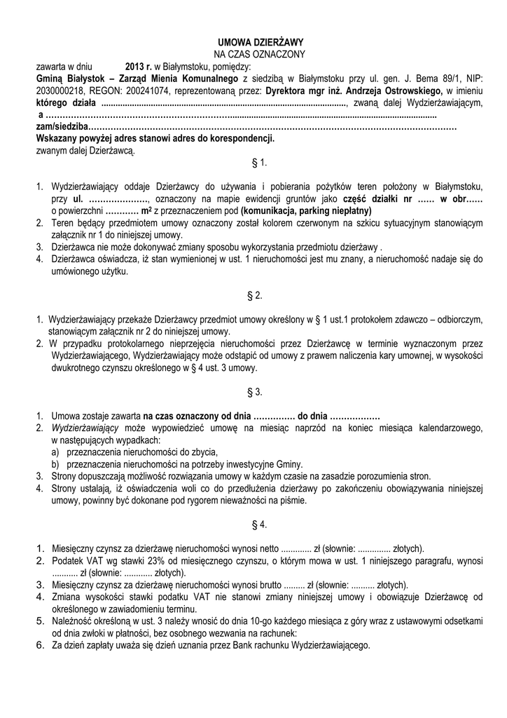 UMOWA DZIERŻAWY NA CZAS OZNACZONY zawarta w dniu 2013 r. w Białymstoku, pomiędzy: Gminą Białystok – Zarząd Mienia Komunalnego z siedzibą w Białymstoku przy ul. gen. J. Bema 89/1, NIP: 2030000218, REGON: 200241074, reprezentowaną przez: Dyrektora mgr inż. Andrzeja Ostrowskiego, w imieniu którego działa ........................................................................................................, zwaną dalej Wydzierżawiającym, a …………………………………………………………........................................................................................ zam/siedziba…………………………………………………………………………………………………………………… Wskazany powyżej adres stanowi adres do korespondencji. zwanym dalej Dzierżawcą. § 1. 1. Wydzierżawiający oddaje Dzierżawcy do używania i pobierania pożytków teren położony w Białymstoku, przy ul. …………………, oznaczony na mapie ewidencji gruntów jako część działki nr …… w obr…… o powierzchni ………… m2 z przeznaczeniem pod (komunikacja, parking niepłatny) 2. Teren będący przedmiotem umowy oznaczony został kolorem czerwonym na szkicu sytuacyjnym stanowiącym załącznik nr 1 do niniejszej umowy. 3. Dzierżawca nie może dokonywać zmiany sposobu wykorzystania przedmiotu dzierżawy . 4. Dzierżawca oświadcza, iż stan wymienionej w ust. 1 nieruchomości jest mu znany, a nieruchomość nadaje się do umówionego użytku. § 2. 1. Wydzierżawiający przekaże Dzierżawcy przedmiot umowy określony w § 1 ust.1 protokołem zdawczo – odbiorczym, stanowiącym załącznik nr 2 do niniejszej umowy. 2. W przypadku protokolarnego nieprzejęcia nieruchomości przez Dzierżawcę w terminie wyznaczonym przez Wydzierżawiającego, Wydzierżawiający może odstąpić od umowy z prawem naliczenia kary umownej, w wysokości dwukrotnego czynszu określonego w § 4 ust. 3 umowy. § 3. 1. Umowa zostaje zawarta na czas oznaczony od dnia …………… do dnia ……………… 2. Wydzierżawiający może wypowiedzieć umowę na miesiąc naprzód na koniec miesiąca kalendarzowego, w następujących wypadkach: a) przeznaczenia nieruchomości do zbycia, b) przeznaczenia nieruchomości na potrzeby inwestycyjne Gminy. 3. Strony dopuszczają możliwość rozwiązania umowy w każdym czasie na zasadzie porozumienia stron. 4. Strony ustalają, iż oświadczenia woli co do przedłużenia dzierżawy po zakończeniu obowiązywania niniejszej umowy, powinny być dokonane pod rygorem nieważności na piśmie. § 4. 1. Miesięczny czynsz za dzierżawę nieruchomości wynosi netto ............. zł (słownie: .............. złotych). 2. Podatek VAT wg stawki 23% od miesięcznego czynszu, o którym mowa w ust. 1 niniejszego paragrafu, wynosi ........... zł (słownie: ............ złotych). 3. Miesięczny czynsz za dzierżawę nieruchomości wynosi brutto ......... zł (słownie: .......... złotych). 4. Zmiana wysokości stawki podatku VAT nie stanowi zmiany niniejszej umowy i obowiązuje Dzierżawcę od określonego w zawiadomieniu terminu. 5. Należność określoną w ust. 3 należy wnosić do dnia 10-go każdego miesiąca z góry wraz z ustawowymi odsetkami od dnia zwłoki w płatności, bez osobnego wezwania na rachunek: 6. Za dzień zapłaty uważa się dzień uznania przez Bank rachunku Wydzierżawiającego. 7. Wysokość stawki czynszu, podlega jednostronnej zmianie przez Wydzierżawiającego na wypadek spadku siły nabywczej pieniądza, corocznie, zgodnie ze średniorocznym wskaźnikiem wzrostu cen towarów i usług ogłoszonym przez Prezesa Głównego Urzędu Statystycznego określonym w odrębnych przepisach. 8. Zmiana stawki czynszu, o której mowa w ust. 7 oraz zmiana numeru konta bankowego Wydzierżawiającego nie stanowi zmiany umowy i obowiązuje Dzierżawcę od określonego w zawiadomieniu terminu. 9. Wszelkie opłaty dokonane przez Dzierżawcę będą zaliczane w następującej kolejności: - należności uboczne w szczególności odsetki, koszty dochodzenia roszczeń, - najstarsza należność główna, - należności bieżące. 10. Opóźnienie w zapłacie czynszu dzierżawy przekraczające dwa miesiące stanowi podstawę do rozwiązania niniejszej umowy ze skutkiem natychmiastowym, po uprzednim udzieleniu Dzierżawcy na piśmie dodatkowo jednomiesięcznego terminu do zapłaty zaległości wraz z odsetkami. § 5. 1. Dzierżawca zobowiązany jest do: a) używania przedmiotu dzierżawy zgodnie z jego przeznaczeniem opisanym w § 1 ust. 1 i zasadami prawidłowej gospodarki, b) ponoszenia podatku od nieruchomości oraz innych kosztów i opłat związanych z bieżącą eksploatacją przedmiotu dzierżawy, c) zgłoszenia w terminie 14 dni od daty zawarcia umowy do Departament Finansów Urzędu Miejskiego faktu zawarcia umowy, będącej podstawą do ustalenia wymiaru podatku od nieruchomości. d) utrzymywania czystości i porządku, na całym przedmiocie dzierżawy, jak też w promieniu 1 m wokół niego, e) przestrzegania warunków bezpieczeństwa, przepisów przeciwpożarowych i sanitarnych. 2. Naruszenie przez Dzierżawcę postanowień zawartych w ust. 1 stanowi podstawę do rozwiązania umowy bez wypowiedzenia. § 6. 1. Dzierżawca może dokonywać nakładów na przedmiocie dzierżawy wyłącznie za pisemną zgodą Wydzierżawiającego. 2. Po wygaśnięciu, rozwiązaniu lub wypowiedzeniu niniejszej umowy, Dzierżawca zobowiązany jest zwrócić Wydzierżawiającemu przedmiot dzierżawy uporządkowany, wolny od jakichkolwiek nakładów bez prawa żądania odszkodowania z tytułu poniesionych nakładów i utraconych korzyści. 3. Rozpoczęcie i prowadzenie na dzierżawionym terenie robót budowlanych w rozumieniu przepisów prawa budowlanego, czynienie nakładów na przedmiocie umowy bez zgody Wydzierżawiającego a także nasadzanie drzew spowoduje rozwiązanie umowy bez wypowiedzenia. 4. Podstawę do ustalenia