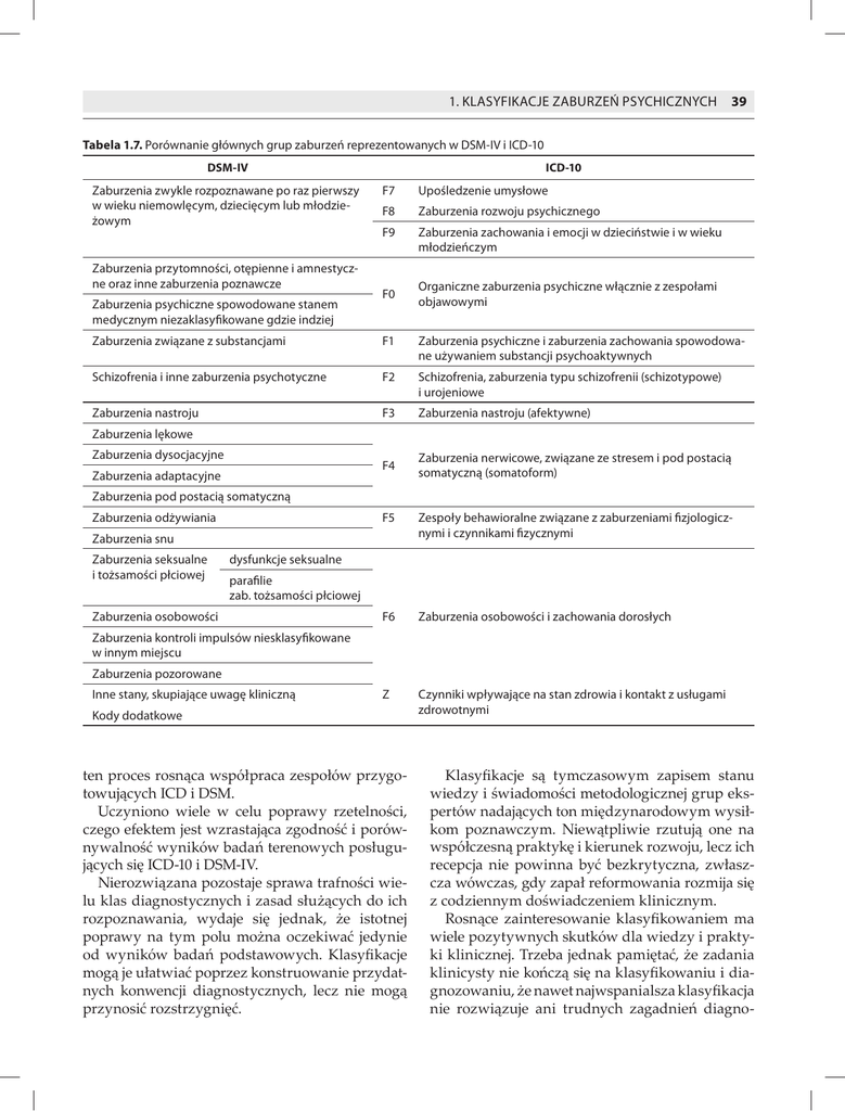 1. Klasyfikacje zaburzeń psychicznych 39 Tabela 1.7. Porównanie głównych grup zaburzeń reprezentowanych w DSM-IV i ICD-10 DSM-IV Zaburzenia zwykle rozpoznawane po raz pierwszy w wieku niemowlęcym, dziecięcym lub młodzieżowym Zaburzenia przytomności, otępienne i amnestyczne oraz inne zaburzenia poznawcze Zaburzenia psychiczne spowodowane stanem medycznym niezaklasyfikowane gdzie indziej ICD-10 F7 Upośledzenie umysłowe F8 Zaburzenia rozwoju psychicznego F9 Zaburzenia zachowania i emocji w dzieciństwie i w wieku młodzieńczym F0 Organiczne zaburzenia psychiczne włącznie z zespołami objawowymi Zaburzenia związane z substancjami F1 Zaburzenia psychiczne i zaburzenia zachowania spowodowane używaniem substancji psychoaktywnych Schizofrenia i inne zaburzenia psychotyczne F2 Schizofrenia, zaburzenia typu schizofrenii (schizotypowe) i urojeniowe Zaburzenia nastroju F3 Zaburzenia nastroju (afektywne) F4 Zaburzenia nerwicowe, związane ze stresem i pod postacią somatyczną (somatoform) Zaburzenia lękowe Zaburzenia dysocjacyjne Zaburzenia adaptacyjne Zaburzenia pod postacią somatyczną Zaburzenia odżywiania F5 Zespoły behawioralne związane z zaburzeniami fizjologicznymi i czynnikami fizycznymi F6 Zaburzenia osobowości i zachowania dorosłych Z Czynniki wpływające na stan zdrowia i kontakt z usługami zdrowotnymi Zaburzenia snu Zaburzenia seksualne i tożsamości płciowej dysfunkcje seksualne parafilie zab. tożsamości płciowej Zaburzenia osobowości Zaburzenia kontroli impulsów niesklasyfikowane w innym miejscu Zaburzenia pozorowane Inne stany, skupiające uwagę kliniczną Kody dodatkowe ten proces rosnąca współpraca zespołów przygotowujących ICD i DSM. Uczyniono wiele w celu poprawy rzetelności, czego efektem jest wzrastająca zgodność i porównywalność wyników badań terenowych posługujących się ICD-10 i DSM-IV. Nierozwiązana pozostaje sprawa trafności wielu klas diagnostycznych i zasad służących do ich rozpoznawania, wydaje się jednak, że istotnej poprawy na tym polu można oczekiwać jedynie od wyników badań podstawowych. Klasyfikacje mogą je ułatwiać poprzez konstruowanie przydatnych konwencji diagnostycznych, lecz nie mogą przynosić rozstrzygnięć. Klasyfikacje są tymczasowym zapisem stanu wiedzy i świadomości metodologicznej grup ekspertów nadających ton międzynarodowym wysiłkom poznawczym. Niewątpliwie rzutują one na współczesną praktykę i kierunek rozwoju, lecz ich recepcja nie powinna być bezkrytyczna, zwłaszcza wówczas, gdy zapał reformowania rozmija się z codziennym doświadczeniem klinicznym. Rosnące zainteresowanie klasyfikowaniem ma wiele pozytywnych skutków dla wiedzy i praktyki klinicznej. Trzeba jednak pamiętać, że zadania klinicysty nie kończą się na klasyfikowaniu i diagnozowaniu, że nawet najwspanialsza klasyfikacja nie rozwiązuje ani trudnych zagadnień diagno-