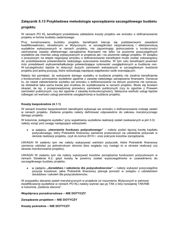 Załącznik 5.13 Przykładowa metodologia sporządzania szczegółowego budżetu projektu W ramach PO KL beneficjent przedstawia zakładane koszty projektu we wniosku o dofinansowanie projektu w formie budżetu zadaniowego. Przy konstruowaniu budżetu projektu beneficjent kieruje się podstawowymi zasadami kwalifikowalności, określonymi w Wytycznych, w szczególności racjonalnością i efektywnością wydatków wykazywanych w ramach projektu, nie zapominając jednocześnie o konieczności zachowania zasady efektywnego zarządzania finansami nie tylko na poziomie poszczególnych wydatków ale również usług wykazywanych w projekcie jak i na poziomie całego projektu. W związku z powyższym na etapie negocjacji wniosku o dofinansowanie beneficjent może zostać zobowiązany do przedstawienia potwierdzenia należytego szacowania kosztów. W tym celu beneficjent powinien móc przedstawić wyliczenia/kalkulacje potwierdzające rynkowość uwzględnionych w budżecie cen. W szczególności będzie to dotyczyć dużych zamówień wskazanych w szczegółowym budżecie projektu pod jedną pozycją, które wzbudzają najwięcej wątpliwości osób oceniających. Należy też pamiętać, że wykazanie danego wydatku w budżecie projektu nie zwalnia beneficjenta z konieczności ponoszenia wydatków zgodnie z zasadą należytego zarządzania finansami. Oznacza to, że nawet zatwierdzenie wydatku we wniosku o dofinansowanie na danym poziomie nie oznacza, że dokładnie taka sama kwota jest możliwa do wydatkowania w ramach projektu. Może się bowiem okazać, że np. z przeprowadzonej procedury zamówień publicznych (czy to zgodnie z Prawem zamówień publicznych, czy też zgodnie z zasadą konkurencyjności), faktyczna wartość usługi będzie odbiegać od wartości usługi pierwotnie uwzględnionej w budżecie projektu. Koszty bezpośrednie (4.1.1) W ramach kosztów bezpośrednich beneficjent wykazuje we wniosku o dofinansowanie rodzaje zadań w ramach projektu. Zadania projektu należy definiować odpowiednio do zakresu merytorycznego danego projektu. W kolumnie „kategoria wydatku” przy wypełnianiu wydatków realizacji zadań (wskazanych w pkt 3.3) należy wziąć pod uwagę następujące wskazówki: utworzenie funduszu pożyczkowego” – należy podać łączną kwotę kapitału pożyczkowego, który Pośrednik finansowy zamierza przeznaczyć na udzielanie pożyczek w okresie realizacji projektu, czyli do końca 2015 r. oraz pokrycie kosztów zarządzania. UWAGA! W zadaniu tym nie należy wykazywać wartości pożyczek, które Pośrednik finansowy zamierza udzielać po jednokrotnym obrocie (bez względu czy nastąpi to w okresie realizacji czy okresie monitorowania projektu). UWAGA! W zadaniu tym nie należy wykazywać kosztów zarządzania funduszem pożyczkowym w ramach Działania 6.2, gdyż koszty te powinny zostać wyszczególnione w uzasadnieniu do szczegółowego budżetu projektu. iu „doradztwo i szkolenia dla pożyczkobiorców” – należy wykazać poszczególne pozycje kosztowe, jakie Pośrednik finansowy planuje ponosić w związku z udzielaniem doradztwa i szkoleń dla pożyczkobiorców; W przypadku zlecania zadań merytorycznych w projekcie (w rozumieniu Wytycznych w zakresie kwalifikowania wydatków w ramach PO KL) należy wybrać opc.ję TAK z listy rozwijanej TAK/NIE w kolumnie „Zadania zlecone”. Współpraca ponadnarodowa – NIE DOTYCZY Zarządzanie projektem – NIE DOTYCZY Koszty pośrednie – NIE DOTYCZY Koszty zarządzania projektem Wartość kosztów zarządzania o jaką ubiega się Pośrednik finansowy w ramach Działania 6.2 należy wskazać w Uzasadnieniu Kosztów, wskazując koszty łączne w podziale na podkategorie określone w katalogu, o którym mowa w podrozdziale 3.4.2 Zasad, z wyłączeniem kosztów osobowych, które muszą zostać wykazane jednostkowo. Oznacza to konieczność przedstawienia w odrębnych pozycjach kosztów wynagrodzeń wszystkich osób zaangażowanych w ramach zarządzania projektem. Przykładowo: 1) wynagrodzenie oficera pożyczkowego: 1 etat x 24m-ce x 3000 zł = 72 000 zł; 2) koszty utrzymania powierzchni biurowych: 36 m-cy x 700 zł = 25 200 zł; 3) amortyzacja sprzętu niezbędnego do zarządzania projektem: 3 lata x 1 500 zł = 4 500 zł. UWAGA! Łączna wartość kosztów zarządzania nie może przekraczać średniorocznie 4% wartości zadania „utworzenie funduszu pożyczkowego”. Oceniając koszty zarządzania należy jednocześnie zwrócić uwagę na: a) Zasadność i racjonalność wydatków związanych z zatrudnieniem personelu zarządzającego projektem1, w tym liczby i charakteru zadań przez ten personel wykonywanych; W szczególności należy pamiętać, że nie w każdym projekcie niezbędne jest zatrudnienie koordynatora na pełen etat jak również, że nie każdy projekt wymaga zaangażowania specjalisty ds. obsługi finansowej. Jednocześnie beneficjent ma obowiązek wykazania szacunkowego wymiaru czasu pracy personelu projektu (tj. wykazania wymiaru etatu lub liczby godzin) niezbędnego do wykonywania zadania/zadań we wniosku o dofinansowanie projektu, co pozwoli na ocenę zasadności i racjonalności wydatków związanych z personelem zarządzającym projektu. W przypadku gdy personelowi mają zostać przyznane dodatki za pracę w projekcie należy to odpowiednio wykazać w szczegółowym budżecie projektu we wniosku o dofinansowanie projektu. Przykładowo, nie jest zasadnym zatrudnianie personelu projektu do zadań okresowych (np. rekrutacja) na okres dłuższy niż bezpośrednio wynikający z realizowanych zadań. b) adekwatność i niezbędność dla osiągnięcia celów projektu wydatków na działania informacyjno-promocyjne w zależności od specyfiki projektu. Przykładowo, nie wydaje się być zasadnym drukowanie ogłoszeń promujących projekt lokalny w prasie ogólnokrajowej lub przygotowywanie gadżetów promocyjnych dla uczestników szkoleń zamkniętych. Zakup wszelkiego typu gadżet