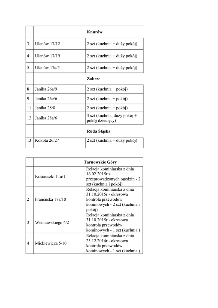 Knurów 3 Ułanów 17/12 2 szt (kuchnia + duży pokój) 4 Ułanów 17/19 2 szt (kuchnia + duży pokój) 5 Ułanów 17a/5 2 szt (kuchnia + duży pokój) Zabrze 8 Janika 26a/9 2 szt (kuchnia + pokój) 9 Janika 26c/6 2 szt (kuchnia + pokój) 11 Janika 28/8 2 szt (kuchnia + pokój) 12 Janika 28a/6 3 szt (kuchnia, duży pokój + pokój dziecięcy) Ruda Śląska 13 Kokota 26/27 2 szt (kuchnia + duży pokój) Tarnowskie Góry 1 Kościuszki 11a/1 2 Francuska 17a/10 3 Wieniawskiego 4/2 4 Mickiewicza 5/10 Relacja kominiarska z dnia 16.02.2015r z przeprowadzonych ogędzin - 2 szt (kuchnia i pokój) Relacja kominiarska z dnia 31.10.2015r - okresowa kontrola przewodów kominowych - 2 szt (kuchnia i pokój) Relacja kominiarska z dnia 31.10.2015r - okresowa kontrola przewodów kominowych - 1 szt (kuchnia ) Relacja kominiarska z dnia 23.12.2014r - okresowa kontrola przewodów kominowych - 1 szt (kuchnia )