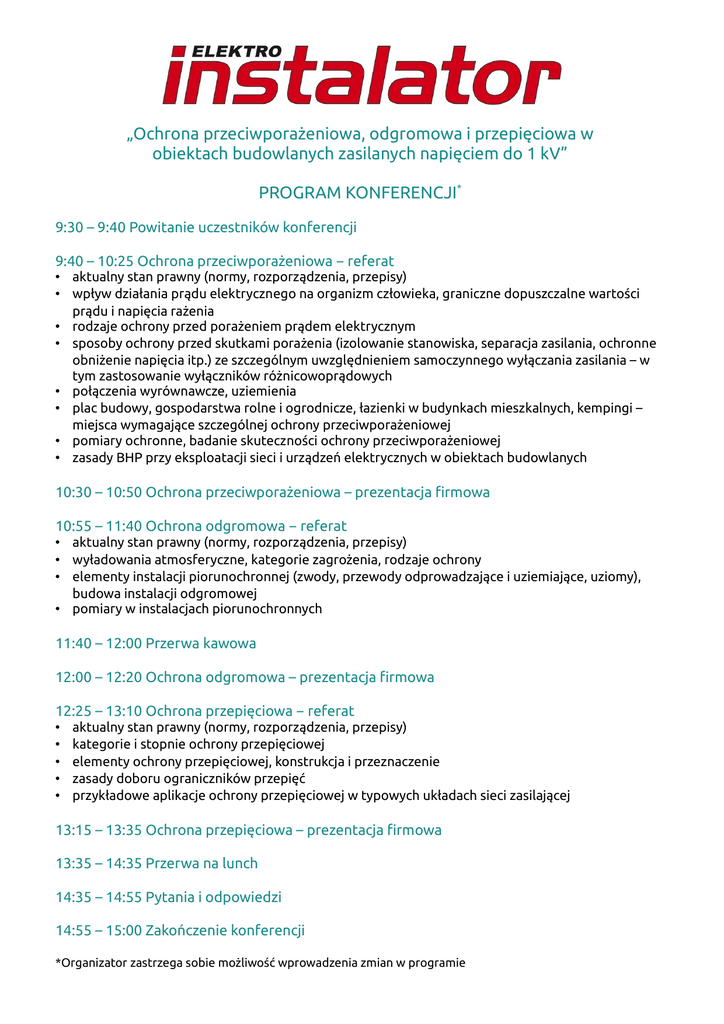 „Ochrona przeciwporażeniowa, odgromowa i przepięciowa w obiektach budowlanych zasilanych napięciem do 1 kV” PROGRAM KONFERENCJI* 9:30 – 9:40 Powitanie uczestników konferencji 9:40 – 10:25 Ochrona przeciwporażeniowa − referat • aktualny stan prawny (normy, rozporządzenia, przepisy) • wpływ działania prądu elektrycznego na organizm człowieka, graniczne dopuszczalne wartości prądu i napięcia rażenia • rodzaje ochrony przed porażeniem prądem elektrycznym • sposoby ochrony przed skutkami porażenia (izolowanie stanowiska, separacja zasilania, ochronne obniżenie napięcia itp.) ze szczególnym uwzględnieniem samoczynnego wyłączania zasilania – w tym zastosowanie wyłączników różnicowoprądowych • połączenia wyrównawcze, uziemienia • plac budowy, gospodarstwa rolne i ogrodnicze, łazienki w budynkach mieszkalnych, kempingi – miejsca wymagające szczególnej ochrony przeciwporażeniowej • pomiary ochronne, badanie skuteczności ochrony przeciwporażeniowej • zasady BHP przy eksploatacji sieci i urządzeń elektrycznych w obiektach budowlanych 10:30 – 10:50 Ochrona przeciwporażeniowa – prezentacja firmowa 10:55 – 11:40 Ochrona odgromowa − referat • aktualny stan prawny (normy, rozporządzenia, przepisy) • wyładowania atmosferyczne, kategorie zagrożenia, rodzaje ochrony • elementy instalacji piorunochronnej (zwody, przewody odprowadzające i uziemiające, uziomy), budowa instalacji odgromowej • pomiary w instalacjach piorunochronnych 11:40 – 12:00 Przerwa kawowa 12:00 – 12:20 Ochrona odgromowa – prezentacja firmowa 12:25 – 13:10 Ochrona przepięciowa − referat • • • • • aktualny stan prawny (normy, rozporządzenia, przepisy) kategorie i stopnie ochrony przepięciowej elementy ochrony przepięciowej, konstrukcja i przeznaczenie zasady doboru ograniczników przepięć przykładowe aplikacje ochrony przepięciowej w typowych układach sieci zasilającej 13:15 – 13:35 Ochrona przepięciowa – prezentacja firmowa 13:35 – 14:35 Przerwa na lunch 14:35 – 14:55 Pytania i odpowiedzi 14:55 – 15:00 Zakończenie konferencji *Organizator zastrzega sobie możliwość wprowadzenia zmian w programie