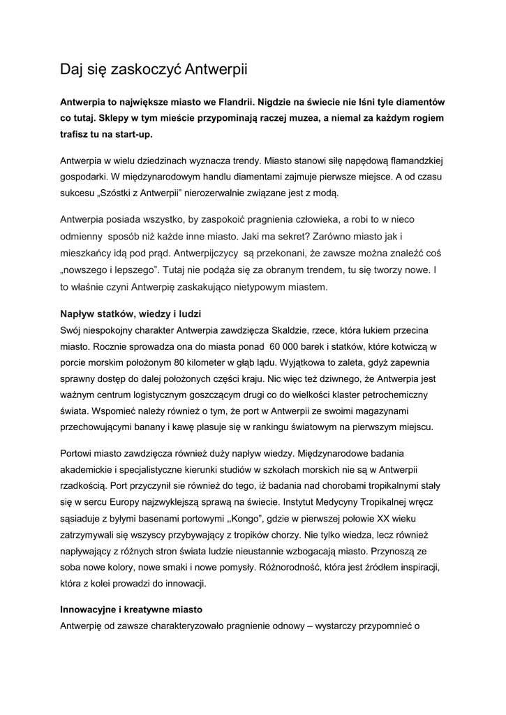 Daj się zaskoczyć Antwerpii Antwerpia to największe miasto we Flandrii. Nigdzie na świecie nie lśni tyle diamentów co tutaj. Sklepy w tym mieście przypominają raczej muzea, a niemal za każdym rogiem trafisz tu na start-up. Antwerpia w wielu dziedzinach wyznacza trendy. Miasto stanowi siłę napędową flamandzkiej gospodarki. W międzynarodowym handlu diamentami zajmuje pierwsze miejsce. A od czasu sukcesu „Szóstki z Antwerpii” nierozerwalnie związane jest z modą. Antwerpia posiada wszystko, by zaspokoić pragnienia człowieka, a robi to w nieco odmienny sposób niż każde inne miasto. Jaki ma sekret? Zarówno miasto jak i mieszkańcy idą pod prąd. Antwerpijczycy są przekonani, że zawsze można znaleźć coś „nowszego i lepszego”. Tutaj nie podąża się za obranym trendem, tu się tworzy nowe. I to właśnie czyni Antwerpię zaskakująco nietypowym miastem. Napływ statków, wiedzy i ludzi Swój niespokojny charakter Antwerpia zawdzięcza Skaldzie, rzece, która łukiem przecina miasto. Rocznie sprowadza ona do miasta ponad 60 000 barek i statków, które kotwiczą w porcie morskim położonym 80 kilometer w głąb lądu. Wyjątkowa to zaleta, gdyż zapewnia sprawny dostęp do dalej położonych części kraju. Nic więc też dziwnego, że Antwerpia jest ważnym centrum logistycznym goszczącym drugi co do wielkości klaster petrochemiczny świata. Wspomieć należy również o tym, że port w Antwerpii ze swoimi magazynami przechowującymi banany i kawę plasuje się w rankingu światowym na pierwszym miejscu. Portowi miasto zawdzięcza również duży napływ wiedzy. Międzynarodowe badania akademickie i specjalistyczne kierunki studiów w szkołach morskich nie są w Antwerpii rzadkością. Port przyczynił sie również do tego, iż badania nad chorobami tropikalnymi stały się w sercu Europy najzwyklejszą sprawą na świecie. Instytut Medycyny Tropikalnej wręcz sąsiaduje z byłymi basenami portowymi „Kongo”, gdzie w pierwszej połowie XX wieku zatrzymywali się wszyscy przybywający z tropików chorzy. Nie tylko wiedza, lecz również napływający z różnych stron świata ludzie nieustannie wzbogacają miasto. Przynoszą ze soba nowe kolory, nowe smaki i nowe pomysły. Różnorodność, która jest źródłem inspiracji, która z kolei prowadzi do innowacji. Innowacyjne i kreatywne miasto Antwerpię od zawsze charakteryzowało pragnienie odnowy – wystarczy przypomnieć o zrodzonej tu sztuce drukarstwa lub mających swoje korzenie w Antwerpii międzynarodowych certyfikatach diamentów ‘Cut in Antwerp’ i ‘Hearts and Arrows’. W DNA Antwerpii zapisany jest postęp. Nie spotkasz tu naśladowców, lecz twórców. Najlepszym tego dowodem jest Akademia, Konserwatorium, kierunki studiów, takie jak: wzornictwo przemysłowe, Multimedia Technology i słynny wydział mody Królewskiej Akademii Sztuk Pięknych. Od Rubensa po Tuymansa, od Szóstki z Antwerpii po Rafa Simonsa: Antwerpijczycy pragną wybiegać w przód i wyznaczać nowy kierunek. Także świat biznesu może poszczycić się wybitnymi talentami. Nic więc dziwnego, że star-upy rosną tu jak grzyby po deszczu, a dzięki płodnej ziemi tego miasta szybko przeradzają się w (międzynarodowe) sukcesy. Zastanawiająco inne Wszystko w Antwerpii jest odbrobinę inne. Zakupy robi się w budynkach, które gdzieś indziej byłyby muzeami. Można się tu wybrać na zakupy do w całości pozłacanej miejskiej sali balowej. Z kolei wizyta w muzeum oszołomi zwiedzających nie tylko swoją kolekcją, ale również położeniem: niewykluczone, że w muzeum MAS najpiękniejsze dzieło sztuki znajduje się na zewnątrz, 60 metrów nad ziemią, gdzie podziwiać można widok na Antwerpię. Na tych, którzy chcą wybrać się do restauracji czekają najbardziej zaskakujące miejsca: od kaplicy po pałac. W tym mieście nawet niewykończonej wieży katedry udaje się zostać obiektem światowego dziedzictwa kulturowego. Na jednym kilometrze kwadratowym w Antwerpii można znaleźć więcej diamentów niż jest ich w całej reszcie świata. A najpiękniejsza sala biblioteczna w Belgii - Nottebohmzaal, jest przypuszczalnie najlepiej strzeżoną tajemnicą miasta. Spacer po mieście to przechadzka wśród późno klasycystycznych zabytków, secesyjnych budynków, modernistycznych dzielnic i współczesnych dzieł sztuki. O takim szlaku architektonicznym inne miasta mogą tylko pomarzyć. Odkryj różnorodność Mieszkańcy Antwerpii lubią nazywać swoje miasto miastem światowym – pod żadnym pozorem nie należy im się w tej kwestii sprzeciwiać – niekiedy jednak ośmielają się nazwać je wioską, w której każdy każdego zna. Budzi to pewne wątpliwości, gdyż Antwerpia jest największym miastem we Flandrii liczącym 510 000 mieszkańców i 174 narodowości. Niemniej jednak pozostaje metropolią na ludzką skalę, w której łatwo zakosztować można wszystkich stylów, kolorów i smaków.