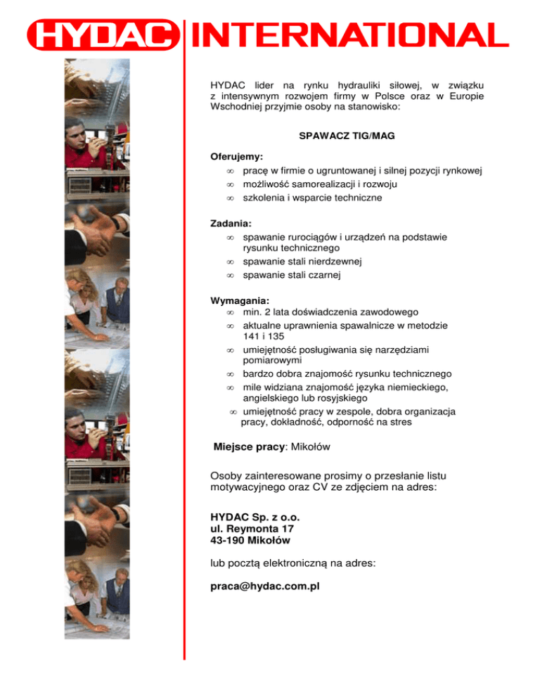 HYDAC lider na rynku hydrauliki siłowej, w związku z intensywnym rozwojem firmy w Polsce oraz w Europie Wschodniej przyjmie osoby na stanowisko: SPAWACZ TIG/MAG Oferujemy: • pracę w firmie o ugruntowanej i silnej pozycji rynkowej • możliwość samorealizacji i rozwoju • szkolenia i wsparcie techniczne Zadania: • spawanie rurociągów i urządzeń na podstawie rysunku technicznego • spawanie stali nierdzewnej • spawanie stali czarnej Wymagania: • min. 2 lata doświadczenia zawodowego • aktualne uprawnienia spawalnicze w metodzie 141 i 135 • umiejętność posługiwania się narzędziami pomiarowymi • bardzo dobra znajomość rysunku technicznego • mile widziana znajomość języka niemieckiego, angielskiego lub rosyjskiego • umiejętność pracy w zespole, dobra organizacja pracy, dokładność, odporność na stres Miejsce pracy: Mikołów Osoby zainteresowane prosimy o przesłanie listu motywacyjnego oraz CV ze zdjęciem na adres: HYDAC Sp. z o.o. ul. Reymonta 17 43-190 Mikołów lub pocztą elektroniczną na adres: [email protected]