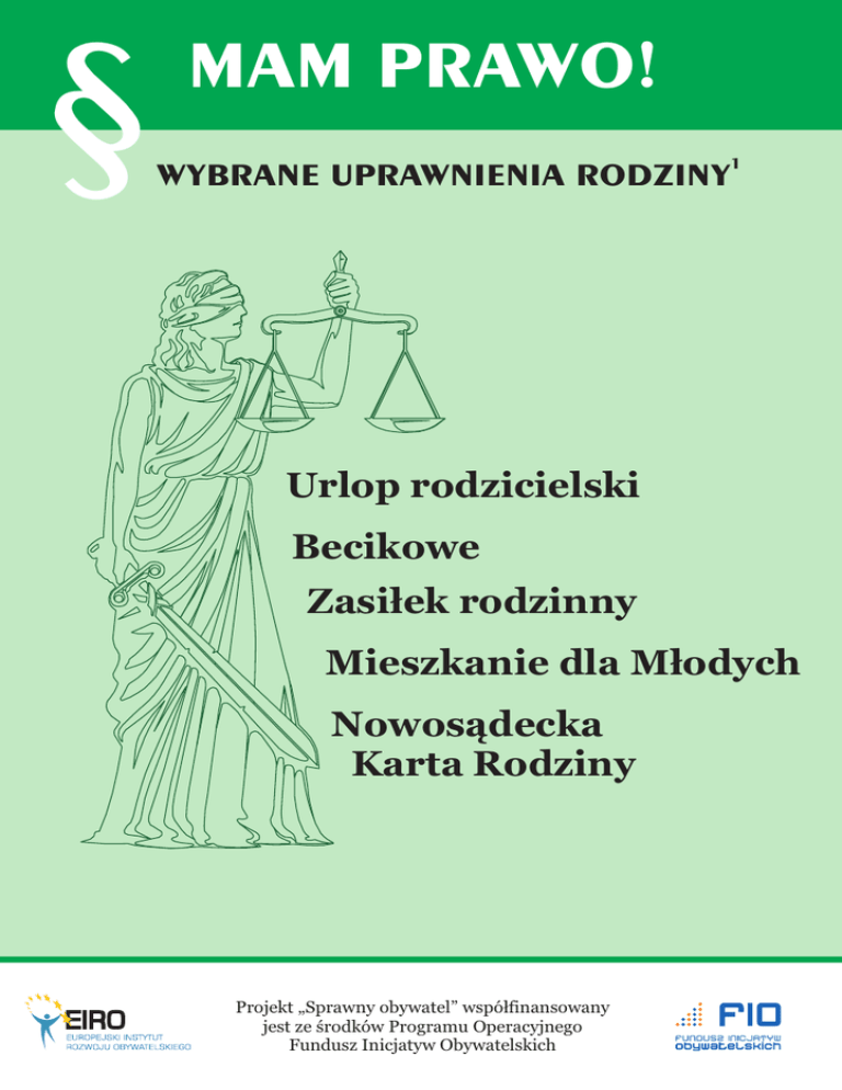 § MAM PRAWO! WYBRANE UPRAWNIENIA RODZINY1 Urlop rodzicielski Becikowe Zasiłek rodzinny Mieszkanie dla Młodych Nowosądecka Karta Rodziny Projekt „Sprawny obywatel” współfinansowany jest ze środków Programu Operacyjnego Fundusz Inicjatyw Obywatelskich MAM PRAWO! URLOP RODZICIELSKI Istota i zasady korzystania z urlopu rodzicielskiego. Od dnia 17 czerwca 2013 r. rodzice mają możliwość korzystania z nowego urlopu związanego z urodzeniem dziecka - urlopu rodzicielskiego. Niezależnie od liczby dzieci urodzonych przy jednym porodzie, wymiar tego urlopu nie może przekraczać 26 tygodni. Urlop ten przysługuje bezpośrednio po wykorzystaniu przed nim, w pełnym wymiarze, dodatkowego urlopu macierzyńskiego. Urlop rodzicielski jest udzielany jednorazowo albo nie więcej niż w trzech częściach - nie muszą być one równe, ale każda z części powinna obejmować co najmniej 8 tygodni i następować bezpośrednio po części ją poprzedzającej. Nie ma prawnego obowiązku korzystania z urlopu rodzicielskiego - to rodzice decydują, czy skorzystają z tego uprawnienia, a jeżeli tak, to w jaki sposób. Ustawodawca przewidział w tym zakresie kilka możliwych rozwiązań. Pełny okres urlopu lub jego część może wykorzystać jeden z rodziców oboje z rodziców mogą podzielić go również pomiędzy siebie (np.: pierwsze 13 tygodni wykorzystuje matka dziecka, a kolejne 13 tygodni - ojciec). Istnieje również opcja, w ramach której oboje rodzice przebywają na urlopie rodzicielskim równocześnie (nie więcej niż przez 13 tygodni). Czy w trakcie urlopu rodzicielskiego można podjąć pracę? Tak. W okresie urlopu rodzicielskiego można podjąć pracę u dotychczasowego pracodawcy udzielającego tego urlopu, w wymiarze nie przekraczającym ½ etatu. Jest to możliwe na pisemny wniosek rodzica korzystającego z urlopu złożony do pracodawcy w terminie nie krótszym niż 14 dni przed rozpoczęciem pracy. W w/w wniosku powinno wskazać się wymiar czasu pracy oraz okres, przez który rodzic zamierza łączyć korzystanie z urlopu rodzicielskiego z jej wykonywaniem. Pracodawca powinien uwzględnić wniosek pracownika, chyba że nie jest to możliwe ze względu na organizację pracy lub rodzaj pracy wykonywanej przez pracownika. O przyczynie odmowy uwzględnienia w/w wniosku pracodawca powinien poinformować pracownika na piśmie. ZASIŁEK RODZINNY Czym jest i komu przysługuje zasiłek rodzinny? Zasiłek rodzinny jest formą zapomogi udzielanej przez Państwo, która ma na celu częściowe pokrycie wydatków związanych z utrzymaniem dziecka. Prawo do zasiłku rodzinnego przysługuje: • rodzicom, jednemu z rodziców albo opiekunowi prawnemu dziecka; • opiekunowi faktycznemu dziecka; • osobie uczącej się. Zasiłek rodzinny przysługuje rodzicom i opiekunom, do ukończenia przez dziecko: • 18. roku życia lub nauki w szkole lub, • nauki w szkole, jednak nie dłużej niż do ukończenia 21. roku życia albo, • 24. roku życia, jeżeli kontynuuje naukę w szkole lub w szkole wyższej i legitymuje się orzeczeniem o umiarkowanym albo znacznym stopniu niepełnosprawności. Ponadto zasiłek rodzinny przysługuje osobie uczącej się, która kontynuuje naukę w szkole lub w szkole wyższej, jednak nie dłużej niż do ukończenia przez nią 24. roku życia. MAM PRAWO! Jaka jest wysokość zasiłku rodzinnego? Wysokość zasiłku rodzinnego wynosi miesięcznie: 1) 77 zł na dziecko w wieku do ukończenia 5 roku życia; 2) 106 zł na dziecko w wieku powyżej 5 roku życia do ukończenia 18 roku życia; 3) 115 zł na dziecko w wieku powyżej 18 roku życia do ukończenia 24 roku życia. Przyznanie prawa do zasiłku rodzinnego uzależnione jest przede wszystkim od spełnienia kryterium dochodowego. Zasiłek rodzinny przysługuje jeżeli dochód rodziny w przeliczeniu na osobę albo dochód osoby uczącej się nie przekracza kwoty 539 zł. W sytuacji, gdy członkiem rodziny jest dziecko legitymujące się orzeczeniem o niepełnosprawności lub orzeczeniem o umiarkowanym albo o znacznym stopniu niepełnosprawności, zasiłek ten przysługuje, jeżeli dochód rodziny w przeliczeniu na osobę albo dochód osoby uczącej się nie przekracza kwoty 623 zł. Gdzie należy złożyć wniosek o wypłatę zasiłku rodzinnego? Wniosek o ustalenie prawa do zasiłku rodzinnego oraz innych świadczeń rodzinnych należy złożyć w urzędzie gminy lub miasta właściwym ze względu na miejsce zamieszkania wnioskodawcy. BECIKOWE Czym jest i komu przysługuje „becikowe”? Jest to jednorazowa zapomoga w wysokości 1000 zł na jedno dziecko, która przysługuje rodzicom z tytułu urodzenia się dziecka. Od 1 stycznia 2013 r. świadczenie to przysługuje, jeżeli dochód rodziny w przeliczeniu na osobę nie przekracza kwoty 1922 zł netto. Dochód ustala się tak, jak w przypadku ubiegania się o zasiłek rodzinny. Świadczenie to, podobnie jak wszystkie świadczenia rodzinne, jest wolne od podatku dochodowego. Ponadto warunkiem koniecznym otrzymania zapomogi jest pozostawanie matki dziecka pod opieką medyczną nie później niż od 10 tygodnia ciąży do dnia porodu, co powinno zostać udokumentowane zaświadczeniem wystawionym przez lekarza lub położną. Gdzie i w jakim terminie należy złożyć wniosek o wypłatę „becikowego”? Wniosek o wypłatę „becikowego” należy złożyć w terminie 12 miesięcy od dnia narodzin dziecka w urzędzie gminy właściwym ze względu na nasze miejsce zamieszkania. MIESZKANIE dla MŁODYCH Co to jest program „Mieszkanie dla Młodych”? Z końcem 2012 roku przestał funkcjonować program pomocowy „Rodzina na Swoim”. Ma on zostać zastąpiony nowym programem pod nazwą „Mieszkanie dla Młodych”. Spodziewany termin rozpoczęcia jego realizacji to 1 stycznia 2014 r. Założenia rządowego projektu ustawy o pomocy państwa w nabyciu pierwszego mieszkania przez ludzi młodych przewidują pomoc polegającą na dofinansowaniu wkładu własnego, 