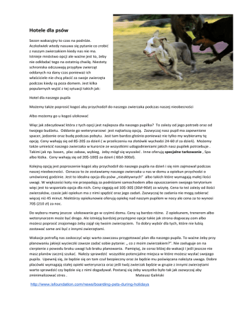 Hotele dla psów Sezon wakacyjny to czas na podróże. Aczkolwiek wtedy nasuwa się pytanie co zrobić z naszym zwierzakiem kiedy nas nie ma. Istnieje mnóstwo opcji ale ważne jest to, żeby nie odkładać tego na ostatnią chwilę. Niestety schroniska odczuwają przypływ zwierząt oddanych na dany czas ponieważ ich właściciele nie chcą płacić za swoje zwierzęta podczas kiedy są poza domem. Jest kilka popularnych wyjść z tej sytuacji takich jak: Hotel dla naszego pupila Możemy także poprosić kogoś aby przychodził do naszego zwierzaka podczas naszej nieobecności Albo możemy go u kogoś ulokować Więc jak zdecydować która z tych opcji jest najlepsza dla naszego pupilka? To zależy od jego potrzeb oraz od twojego budżetu. Oddanie go weterynarzowi jest najtańszą opcją. Zazwyczaj nasz pupil ma zapewnione spacer, jedzenie oraz budę podczas pobytu. Jest tam bardzo głośnio ponieważ nie tylko my wybieramy tę opcję. Ceny wahają się od 8$-20$ za dzień ( w przeliczeniu na złotówki wychodzi 24-60 zł za dzień). Możemy także umieścić naszego zwierzaka w kurorcie ze wszystkimi udogodnieniami jakich nasz pupilek potrzebuje . Takimi jak np. basen, plac zabaw, wybieg, żeby mógł się wyszaleć . Inne oferują specjalne tarkowanie , Spa albo łóżka. Ceny wahają się od 20$-100$ za dzień ( 60zł-300zl). Kolejną opcją jest poproszenie kogoś aby przychodził do naszego pupila na dzień i się nim zajmował podczas naszej nieobecności. Oznacza to że zostawiamy naszego zwierzaka u nas w domu a opiekun przychodzi o umówionej godzinie. Jest to idealna opcja dla psów „nieaktywnych” albo takich które wymagają małej ilości uwagi. W większości koty nie przepadają za podróżami samochodem albo opuszczaniem swojego terytorium więc jest to wspaniała opcja dla nich. Ceny sięgają od 10$-30$ (30zł-90zł) za wizytę. Cena ta też zależy od ilości zwierzaków, czasie jaki opiekun ma z nimi spędzić oraz jego zadań. Zazwyczaj te zadania nie mogą zabierać więcej niż 45 minut. Niektórzy opiekunowie oferują opiekę nad naszym pupilem w nocy ale cena za to wynosi 70$ (210 zł) za noc. Do wyboru mamy jeszcze ulokowanie go w czyimś domu. Ceny są bardzo różne. Z opiekunem, trenerem albo weterynarzem może być drogo. Ale istnieją bardziej przystępne opcje takie jak strona dogvacay.com albo możesz poprosić znajomego żeby zajął się twoim zwierzęciem. To dobry wybór dla tych, które nie lubią zostawać same ani być z innymi zwierzętami. Wakacje potrafią nas zaskoczyć więc warto zawczasu przygotować plan dla naszego pupila. To ważne żeby przy planowaniu jakiejś wycieczki zawsze zadać sobie pytanie: „ co z moim zwierzakiem?”. Nie zasługuje on na cierpienie z powodu braku uwagi lub braku planowania. Pamiętaj, że coraz bliżej do wakacji i jeśli jeszcze nie masz planów zacznij szukać. Należy sprawdzić wszystkie potencjalne miejsca w które możesz wysłać swojego pupila. Upewnij się, że będzie się on tam czuł bezpieczny oraz że będzie mu poświęcana należyta uwaga. Dobre placówki wymagają stałej opieki weterynarza oraz jeśli twój zwierzak będzie w grupie z innymi zwierzętami warto sprawdzić czy będzie się z nimi dogadywał. Postaraj się żeby wszystko było tak jak zazwyczaj aby zminimalizować stres . Mateusz Galiński http://www.isfoundation.com/news/boarding-pets-during-holidays
