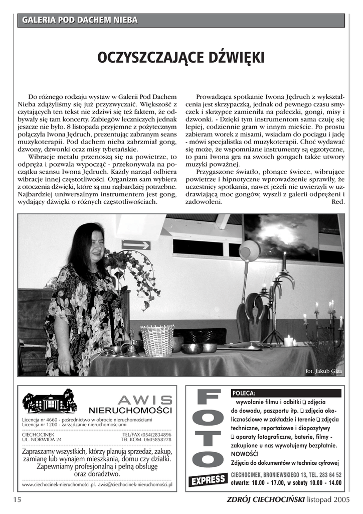 GALERIA POD DACHEM NIEBA OCZYSZCZAJÑCE DèWI¢KI Do ró˝nego rodzaju wystaw w Galerii Pod Dachem Nieba zdà˝yliÊmy si´ ju˝ przyzwyczaiç. Wi´kszoÊç z czytajàcych ten tekst nie zdziwi si´ te˝ faktem, ˝e odbywa∏y si´ tam koncerty. Zabiegów leczniczych jednak jeszcze nie by∏o. 8 listopada przyjemne z po˝ytecznym po∏àczy∏a Iwona J´druch, prezentujàc zabranym seans muzykoterapii. Pod dachem nieba zabrzmia∏ gong, dzwony, dzwonki oraz misy tybetaƒskie. Wibracje metalu przenoszà si´ na powietrze, to odpr´˝a i pozwala wypoczàç - przekonywa∏a na poczàtku seansu Iwona J´druch. Ka˝dy narzàd odbiera wibracje innej cz´stotliwoÊci. Organizm sam wybiera z otoczenia dêwi´ki, które sà mu najbardziej potrzebne. Najbardziej uniwersalnym instrumentem jest gong, wydajàcy dêwi´ki o ró˝nych cz´stotliwoÊciach. Prowadzàca spotkanie Iwona J´druch z wykszta∏cenia jest skrzypaczkà, jednak od pewnego czasu smyczek i skrzypce zamieni∏a na pa∏eczki, gongi, misy i dzwonki. - Dzi´ki tym instrumentom sama czuj´ si´ lepiej, codziennie gram w innym mieÊcie. Po prostu zabieram worek z misami, wsiadam do pociàgu i jad´ - mówi specjalistka od muzykoterapii. Choç wydawaç si´ mo˝e, ˝e wspomniane instrumenty sà egzotyczne, to pani Iwona gra na swoich gongach tak˝e utwory muzyki powa˝nej. Przygaszone Êwiat∏o, p∏onàce Êwiece, wibrujàce powietrze i hipnotyczne wprowadzenie sprawi∏y, ˝e uczestnicy spotkania, nawet je˝eli nie uwierzyli w uzdrawiajàcà moc gongów, wyszli z galerii odpr´˝eni i zadowoleni. Red. fot. Jakub Giza Licencja nr 4660 - poÊrednictwo w obrocie nieruchomoÊciami Licencja nr 1200 - zarzàdzanie nieruchomoÊciami -----------------------------------------------------------------------------------------CIECHOCINEK TEL/FAX (054)2834896 UL. NORWIDA 24 TEL.KOM. 0605858278 ------------------------------------------------------------------------------------------ Zapraszamy wszystkich, którzy planujà sprzeda˝, zakup, zamian´ lub wynajem mieszkania, domu czy dzia∏ki. Zapewniamy profesjonalnà i pe∏nà obs∏ug´ oraz doradztwo. -----------------------------------------------------------------------------------------www.ciechocinek-nieruchomoÊci.pl, awis@ciechocinek-nieruchomoÊci.pl 15 POLECA: wywo∏anie filmu i odbitki zdj´cia do dowodu, paszportu itp. zdj´cia okolicznoÊciowe w zak∏adzie i terenie zdj´cia techniczne, reporta˝owe i diapozytywy aparaty fotograficzne, baterie, filmy zakupione u nas wywo∏ujemy bezp∏atnie. NOWOÂå! Zdj´cia do dokumentów w technice cyfrowej CIECHOCINEK, BRONIEWSKIEGO 13, TEL. 283 64 52 otwarte: 10.00 - 17.00, w soboty 10.00 - 14.00 ZDRÓJ CIECHOCI¡SKI listopad 2005