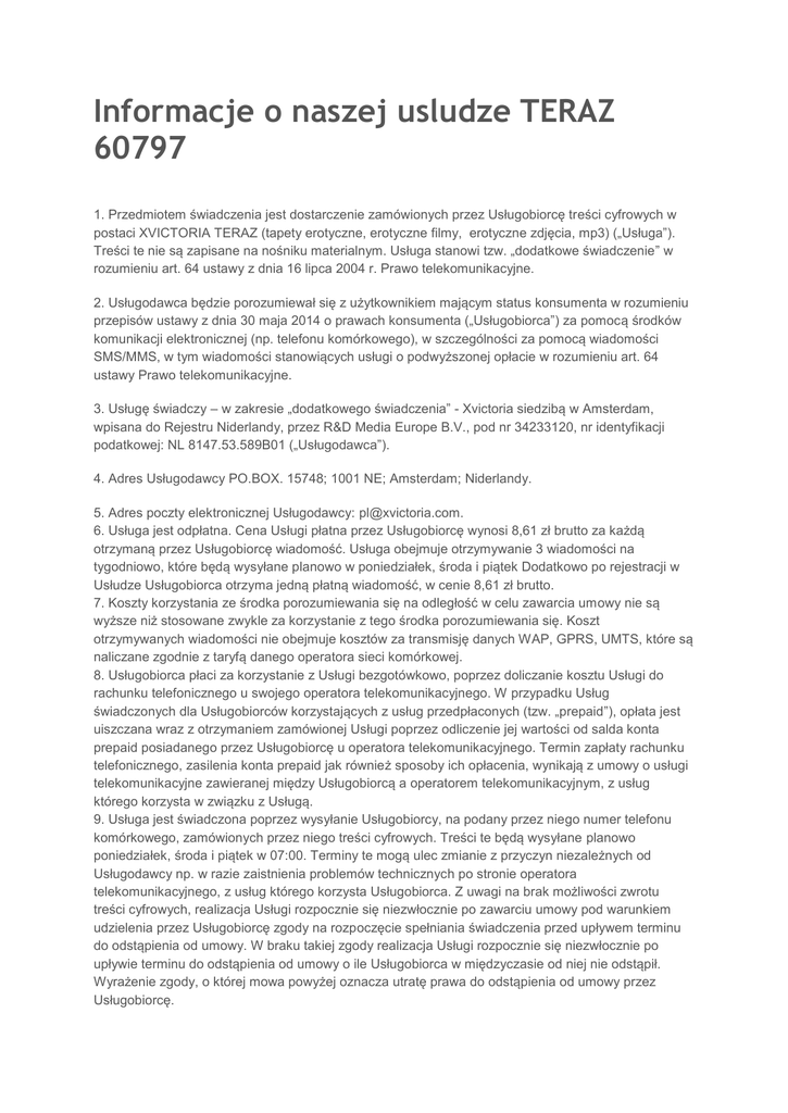 Informacje o naszej usludze TERAZ 60797 1. Przedmiotem świadczenia jest dostarczenie zamówionych przez Usługobiorcę treści cyfrowych w postaci XVICTORIA TERAZ (tapety erotyczne, erotyczne filmy, erotyczne zdjęcia, mp3) („Usługa”). Treści te nie są zapisane na nośniku materialnym. Usługa stanowi tzw. „dodatkowe świadczenie” w rozumieniu art. 64 ustawy z dnia 16 lipca 2004 r. Prawo telekomunikacyjne. 2. Usługodawca będzie porozumiewał się z użytkownikiem mającym status konsumenta w rozumieniu przepisów ustawy z dnia 30 maja 2014 o prawach konsumenta („Usługobiorca”) za pomocą środków komunikacji elektronicznej (np. telefonu komórkowego), w szczególności za pomocą wiadomości SMS/MMS, w tym wiadomości stanowiących usługi o podwyższonej opłacie w rozumieniu art. 64 ustawy Prawo telekomunikacyjne. 3. Usługę świadczy – w zakresie „dodatkowego świadczenia” - Xvictoria siedzibą w Amsterdam, wpisana do Rejestru Niderlandy, przez R&D Media Europe B.V., pod nr 34233120, nr identyfikacji podatkowej: NL 8147.53.589B01 („Usługodawca”). 4. Adres Usługodawcy PO.BOX. 15748; 1001 NE; Amsterdam; Niderlandy. 5. Adres poczty elektronicznej Usługodawcy: [email protected]. 6. Usługa jest odpłatna. Cena Usługi płatna przez Usługobiorcę wynosi 8,61 zł brutto za każdą otrzymaną przez Usługobiorcę wiadomość. Usługa obejmuje otrzymywanie 3 wiadomości na tygodniowo, które będą wysyłane planowo w poniedziałek, środa i piątek Dodatkowo po rejestracji w Usłudze Usługobiorca otrzyma jedną płatną wiadomość, w cenie 8,61 zł brutto. 7. Koszty korzystania ze środka porozumiewania się na odległość w celu zawarcia umowy nie są wyższe niż stosowane zwykle za korzystanie z tego środka porozumiewania się. Koszt otrzymywanych wiadomości nie obejmuje kosztów za transmisję danych WAP, GPRS, UMTS, które są naliczane zgodnie z taryfą danego operatora sieci komórkowej. 8. Usługobiorca płaci za korzystanie z Usługi bezgotówkowo, poprzez doliczanie kosztu Usługi do rachunku telefonicznego u swojego operatora telekomunikacyjnego. W przypadku Usług świadczonych dla Usługobiorców korzystających z usług przedpłaconych (tzw. „prepaid”), opłata jest uiszczana wraz z otrzymaniem zamówionej Usługi poprzez odliczenie jej wartości od salda konta prepaid posiadanego przez Usługobiorcę u operatora telekomunikacyjnego. Termin zapłaty rachunku telefonicznego, zasilenia konta prepaid jak również sposoby ich opłacenia, wynikają z umowy o usługi telekomunikacyjne zawieranej między Usługobiorcą a operatorem telekomunikacyjnym, z usług którego korzysta w związku z Usługą. 9. Usługa jest świadczona poprzez wysyłanie Usługobiorcy, na podany przez niego numer telefonu komórkowego, zamówionych przez niego treści cyfrowych. Treści te będą wysyłane planowo poniedziałek, środa i piątek w 07:00. Terminy te mogą ulec zmianie z przyczyn niezależnych od Usługodawcy np. w razie zaistnienia problemów technicznych po stronie operatora telekomunikacyjnego, z usług którego korzysta Usługobiorca. Z uwagi na brak możliwości zwrotu treści cyfrowych, realizacja Usługi rozpocznie się niezwłocznie po zawarciu umowy pod warunkiem udzielenia przez Usługobiorcę zgody na rozpoczęcie spełniania świadczenia przed upływem terminu do odstąpienia od umowy. W braku takiej zgody realizacja Usługi rozpocznie się niezwłocznie po upływie terminu do odstąpienia od umowy o ile Usługobiorca w międzyczasie od niej nie odstąpił. Wyrażenie zgody, o której mowa powyżej oznacza utratę prawa do odstąpienia od umowy przez Usługobiorcę. 10. Reklamacje można kierować drogą: wiadomości poczty elektronicznej na adres [email protected], pocztową na adres R&D Media Europe B.V; PO.BOX. 15748; 1001 NE; Amsterdam; Niderlandy. (list z dopiskiem „Reklamacja”). Reklamacje są rozpatrywane (a w przypadku zgłaszania ich telefonicznie również przyjmowane) w dni robocze, od poniedziałku do piątku w godz. 10.00-15.00. Termin rozpatrzenia reklamacji wynosi w terminie 5 dni roboczych od dnia jej wpływu do Usługodawcy. Termin ten może ulec zmianie jeżeli do rozpatrzenia reklamacji konieczne okaże się uzyskanie informacji od operatorów telekomunikacyjnych lub podmiotów współpracujących z Usługodawcą przy świadczeniu Usługi albo też dodatkowych informacji od Usługobiorcy. Usługodawca może domagać się od wnoszącego reklamację podania dodatkowych informacji o ile są one niezbędne do rozpatrzenia tej reklamacji. W takim przypadku czasu oczekiwania na podanie takich dodatkowych informacji nie uwzględnia się w czasie rozpatrywania reklamacji. O wyniku rozpatrzenia reklamacji Usługobiorca zostanie poinformowany pisemnie, drogą wiadomości poczty elektronicznej lub telefonicznie. Negatywne rozpatrzenie reklamacji wymaga uzasadnienia. 11. Usługobiorcy przysługuje prawo odstąpienia od umowy bez podawania jakiejkolwiek przyczyny w terminie 14 dni od dnia jej zawarcia. Odstąpienie od umowy polega na złożeniu przez Usługobiorcę na adres: R&D Media Europe B.V.; PO.BOX. 15748; 1001 NE; Amsterdam; Niderlandy jednoznacznego oświadczenia o odstąpieniu od umowy. Można przy tym skorzystać z wzoru takiego oświadczenia stanowiącego załącznik nr 2 do ustawy z dnia 30 maja 2014 r. o prawach konsumenta. Skorzystanie z tego wzoru nie jest jednak obowiązkowe. Aby zachować termin do odstąpienia od umowy wystarczy wysłać oświadczenie o takim odstąpieniu przed upływem terminu do tego odstąpienia. W przypadku odstąpienia od niniejszej umowy Usługodawca zwraca Usługobiorcy wszystkie otrzymane od Usługobiorcy płatności, niezwłocznie, a w każdym przypadku nie później niż 14 dni od dnia, w którym Usługodawca został poinformowany o wykonaniu prawa odstąpienia od umowy przez Usługobiorcę. Zwrot płatności zostanie dokonany przy użyciu takich samych sposobów płatności, jakie zo