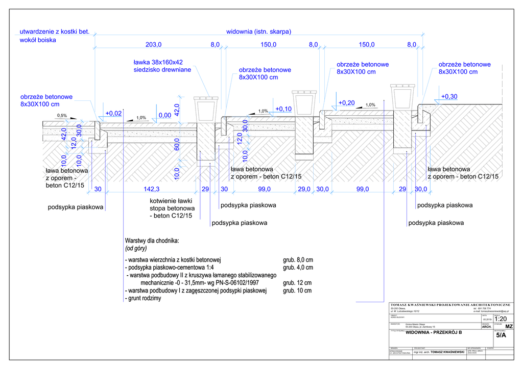 utwardzenie z kostki bet. wokół boiska widownia (istn. skarpa) 203,0 8,0 150,0 ławka 38x160x42 siedzisko drewniane 1,0% podsypka piaskowa 1,0% 10,0 60,0 30 +0,10 +0,30 142,3 kotwienie ławki stopa betonowa - beton C12/15 ława betonowa z oporem - beton C12/15 ława betonowa z oporem - beton C12/15 10,0 ława betonowa z oporem beton C12/15 +0,20 obrzeże betonowe 8x30X100 cm 12,0 30,0 12,0 10,0 42,0 10,0 1,0% 0,00 8,0 30,0 +0,02 0,5% 150,0 obrzeże betonowe 8x30X100 cm obrzeże betonowe 8x30X100 cm 42,0 obrzeże betonowe 8x30X100 cm 8,0 29 30 99,0 29,0 30,0 99,0 29 30,0 podsypka piaskowa podsypka piaskowa podsypka piaskowa podsypka piaskowa Warstwy dla chodnika: (od góry) - warstwa wierzchnia z kostki betonowej - podsypka piaskowo-cementowa 1:4 - warstwa podbudowy II z kruszywa łamanego stabilizowanego mechanicznie -0 - 31,5mm- wg PN-S-06102/1997 - warstwa podbudowy I z zagęszczonej podsypki piaskowej - grunt rodzimy grub. 8,0 cm grub. 4,0 cm grub. 12 cm grub. 10 cm TOMASZ KWAŚNIEWSKI PROJEKTOWANIE ARCHITEKTONICZNE 55-200 Oława, ul. W. Lutosławskiego 10/12 tel. 691 706 774 e-mail: [email protected] OBIEKT, ADRES BUDOWY: DATA: SKALA: 05.2015r. INWESTOR: TYTUŁ RYSUNKU: Gmina Miasto Oława 55-200 Oława, pl. Zamkowy 15 BRANŻA: ARCH. WIDOWNIA - PRZEKRÓJ B BRANŻA: 1:20 STADIUM: MZ NR RYSUNKU: 5/A PROJEKTANT: NR UPRAWNIEŃ: OPRACOWANIE CZ. ARCHITEKTONICZNA: mgr inż. arch. TOMASZ KWAŚNIEWSKI UPR. PROJ.-ARCH. 20/02 DOIA OPRACOWANIE INST. ELEKTRYCZNE: mgr inż. MICHAŁ KIEC UPR. PROJ.-ELEKT. 444/83/WBPP PODPIS: