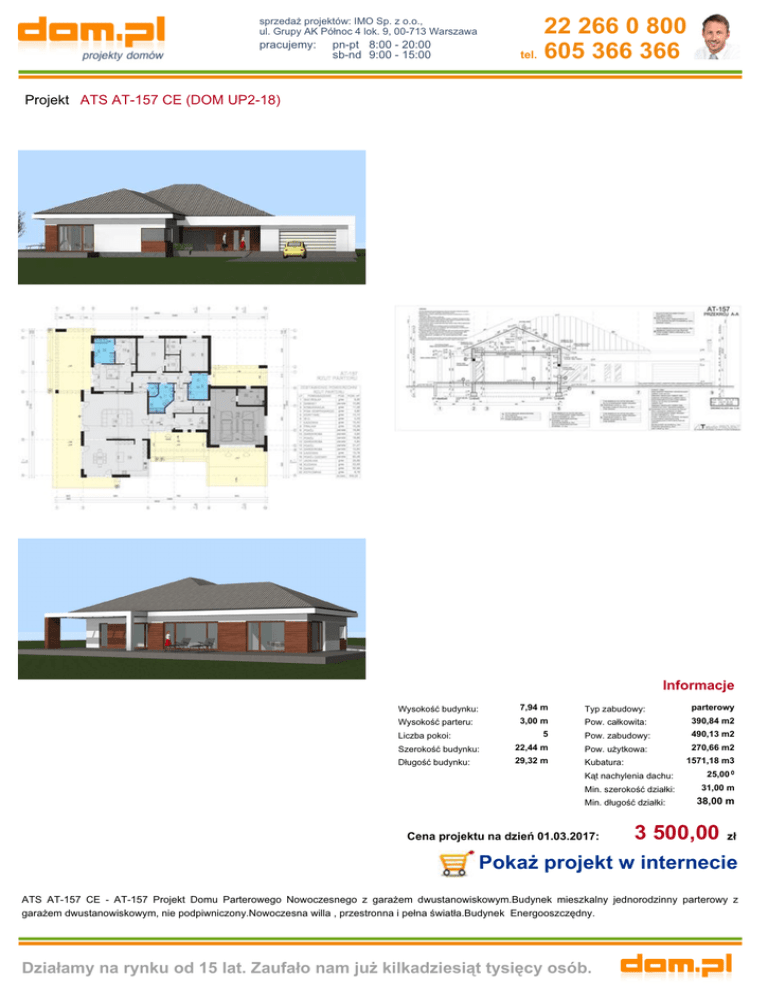 22 266 0 800 tel. 605 366 366 sprzedaż projektów: IMO Sp. z o.o., ul. Grupy AK Północ 4 lok. 9, 00-713 Warszawa pracujemy: pn-pt 8:00 - 20:00 sb-nd 9:00 - 15:00 Projekt ATS AT-157 CE (DOM UP2-18) Informacje Wysokość budynku: 7,94 m Typ zabudowy: parterowy Wysokość parteru: 3,00 m Pow. całkowita: 390,84 m2 Pow. zabudowy: 490,13 m2 5 Liczba pokoi: Szerokość budynku: 22,44 m Długość budynku: 29,32 m Pow. użytkowa: 270,66 m2 1571,18 m3 Kubatura: Kąt nachylenia dachu: 25,00 0 Min. szerokość działki: 31,00 m Min. długość działki: Cena projektu na dzień 01.03.2017: 38,00 m 3 500,00 zł Pokaż projekt w internecie ATS AT-157 CE - AT-157 Projekt Domu Parterowego Nowoczesnego z garażem dwustanowiskowym.Budynek mieszkalny jednorodzinny parterowy z garażem dwustanowiskowym, nie podpiwniczony.Nowoczesna willa , przestronna i pełna światła.Budynek Energooszczędny. Działamy na rynku od 15 lat. Zaufało nam już kilkadziesiąt tysięcy osób.