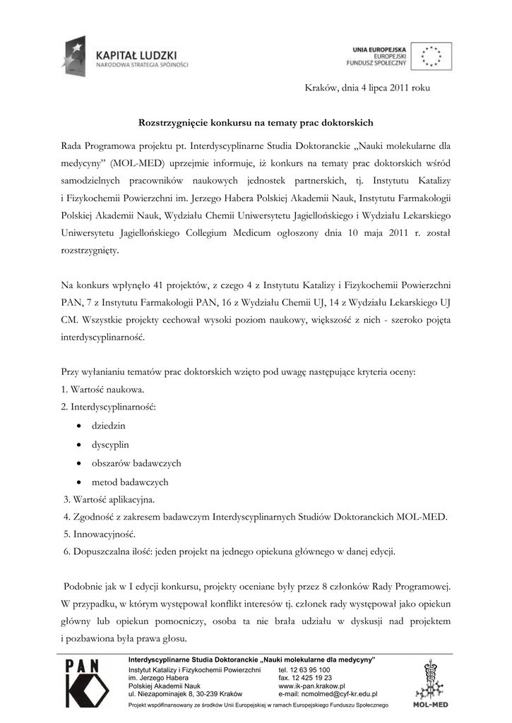 Kraków, dnia 4 lipca 2011 roku Rozstrzygnięcie konkursu na tematy