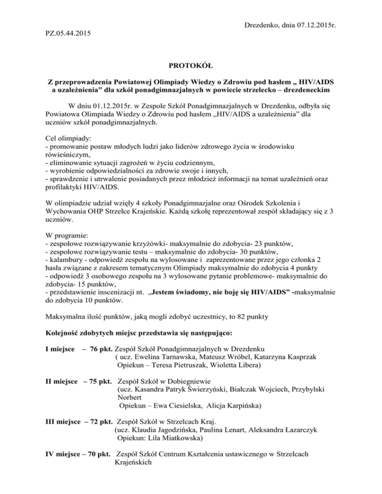 Drezdenko, dnia 07.12.2015r. PZ.05.44.2015 PROTOKÓŁ Z przeprowadzenia Powiatowej Olimpiady Wiedzy o Zdrowiu pod hasłem „ HIV/AIDS a uzależnienia” dla szkół ponadgimnazjalnych w powiecie strzelecko – drezdeneckim W dniu 01.12.2015r. w Zespole Szkół Ponadgimnazjalnych w Drezdenku, odbyła się Powiatowa Olimpiada Wiedzy o Zdrowiu pod hasłem „HIV/AIDS a uzależnienia” dla uczniów szkół ponadgimnazjalnych. Cel olimpiady: - promowanie postaw młodych ludzi jako liderów zdrowego życia w środowisku rówieśniczym, - eliminowanie sytuacji zagrożeń w życiu codziennym, - wyrobienie odpowiedzialności za zdrowie swoje i innych, - sprawdzenie i utrwalenie posiadanych przez młodzież informacji na temat uzależnień oraz profilaktyki HIV/AIDS. W olimpiadzie udział wzięły 4 szkoły Ponadgimnazjalne oraz Ośrodek Szkolenia i Wychowania OHP Strzelce Krajeńskie. Każdą szkołę reprezentował zespół składający się z 3 uczniów. W programie: - zespołowe rozwiązywanie krzyżówki- maksymalnie do zdobycia- 23 punktów, - zespołowe rozwiązywanie testu – maksymalnie do zdobycia- 30 punktów, - kalambury - odpowiedź zespołu na wylosowane i zaprezentowane przez jego członka 2 hasła związane z zakresem tematycznym Olimpiady maksymalnie do zdobycia 4 punkty - odpowiedź 3 osobowego zespołu na 3 wylosowane pytanie problemowe- maksymalnie do zdobycia- 15 punktów, - przedstawienie inscenizacji nt. „Jestem świadomy, nie boję się HIV/AIDS” -maksymalnie do zdobycia 10 punktów. Maksymalna ilość punktów, jaką mogli zdobyć uczestnicy, to 82 punkty Kolejność zdobytych miejsc przedstawia się następująco: I miejsce – 76 pkt. Zespół Szkół Ponadgimnazjalnych w Drezdenku ( ucz. Ewelina Tarnawska, Mateusz Wróbel, Katarzyna Kasprzak Opiekun – Teresa Pietruszak, Wioletta Libera) II miejsce – 75 pkt. Zespół Szkół w Dobiegniewie (ucz. Kasandra Patryk Świerzyński, Białczak Wojciech, Przybylski Norbert Opiekun – Ewa Ciesielska, Alicja Karpińska) III miejsce – 72 pkt. Zespół Szkół w Strzelcach Kraj. (ucz. Klaudia Jagodzińska, Paulina Lenart, Aleksandra Łazarczyk Opiekun: Lila Miatkowska) IV miejsce – 70 pkt. Zespół Szkół Centrum Kształcenia ustawicznego w Strzelcach Krajeńskich (ucz. Natalia Trojanek, Agata Sicińska, Kondrad Puszyńsk Opiekun – Justyna Turek) V miejsce – 56 pkt. Ośrodek Szkolenia i Wychowania OHP w Strzelcach Kraj. (ucz. Syga Patrycja, Wyszońska Żaneta, Łukomska Katarzyna Opiekun: Agnieszka Gaj) Wszyscy uczestnicy Olimpiady otrzymali nagrody rzeczowe, na kwotę 750,00 zł, które zostały ufundowane przez o Ośrodek Pomocy Społecznej w Drezdenku, o Urząd Miejski Dobiegniewie o Urząd Miejski w Strzelce Kraj. Starostwo Powiatowe w Strzelcach ufundowało nagrody rzeczowe w postaci książek za I miejsce na kwotę ok. 200 zł Pozostali uczestnicy otrzymali gadżety od PSSE Drezdenko. Poczęstunek dla uczestników i opiekunów Olimpiady zapewniła Powiatowa Stacja SanitarnoEpidemiologiczna a także Zespół Szkół Ponadgimnazjalnych w Drezdenku. Zawodników oceniała Komisja w składzie: Przewodnicząca – Małgorzata Kożuch – Kierownik Oddziału Nadzoru Sanitarnego PSSE Drezdenko Członkowie: - Łabędź Elżbieta – stanowisko ds. zdrowia i spraw społecznych, Starostwo Powiatowe w Strzelcach Krajeńskich. - Justyna Moroz – Gminna Komisja Rozwiązywania Problemów Alkoholowych Imprezę prowadziła: Monika Nawrot – stażysta ds. PZiOZ – PSSE Drezdenko Państwowy Powiatowy Inspektor Sanitarny w Drezdenku składa serdeczne podziękowanie dla dyrekcji Zespołu Szkół Ponadgimnazjalnych w Drezdenku za przygotowanie poczęstunku, przygotowanie sali oraz sympatyczną atmosferę podczas organizacji Olimpiady. Wyrazy wdzięczności kieruję również do dyrektorów szkół biorących udział w olimpiadzie, opiekunów młodzieży oraz sponsorów nagród rzeczowych. Olimpiadę zorganizowano z okazji obchodów Światowego Dnia Walki z AIDS w trakcie olimpiady przekazano materiały edukacyjne dotyczące tematyki HIV/AIDS. Sporządził : Monika Nawrot stażysta ds. PZiOZ