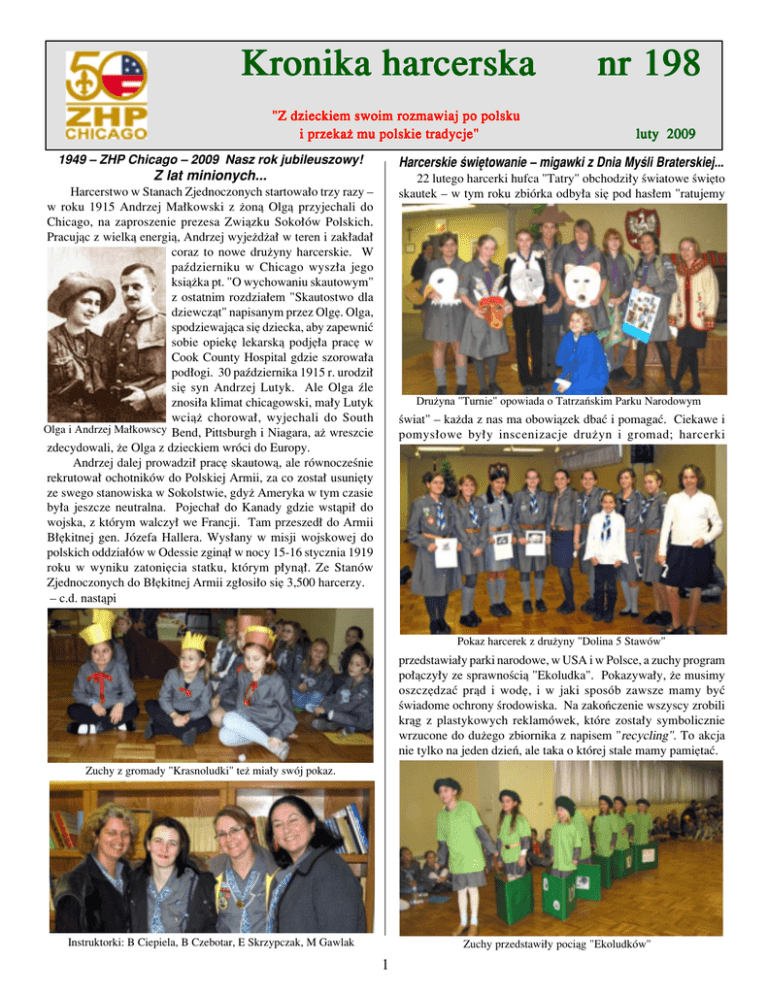 Kronika harcerska &Z dzieckiem swoim rozmawiaj po polsku i przeka# mu polskie tradycje& 1949 – ZHP Chicago – 2009 Nasz rok jubileuszowy! nr 198 luty 2009 Harcerskie =wi/towanie – migawki z Dnia My=li Braterskiej... Z lat minionych... 22 lutego harcerki hufca &Tatry& obchodzi;y =wiatowe =wi/to skautek – w tym roku zbi[rka odby;a si/ pod has;em &ratujemy Harcerstwo w Stanach Zjednoczonych startowa;o trzy razy – w roku 1915 Andrzej Ma;kowski z #on' Olg' przyjechali do Chicago, na zaproszenie prezesa Zwi'zku Soko;[w Polskich. Pracuj'c z wielk' energi', Andrzej wyje#d#a; w teren i zak;ada; coraz to nowe dru#yny harcerskie. W pa-dzierniku w Chicago wysz;a jego ksi'#ka pt. &O wychowaniu skautowym& z ostatnim rozdzia;em &Skautostwo dla dziewcz't& napisanym przez Olg/. Olga, spodziewaj'ca si/ dziecka, aby zapewni\ sobie opiek/ lekarsk' podj/;a prac/ w Cook County Hospital gdzie szorowa;a pod;ogi. 30 pa-dziernika 1915 r. urodzi; si/ syn Andrzej Lutyk. Ale Olga -le znosi;a klimat chicagowski, ma;y Lutyk wci'# chorowa;, wyjechali do South Olga i Andrzej Ma;kowscy Bend, Pittsburgh i Niagara, a# wreszcie zdecydowali, #e Olga z dzieckiem wr[ci do Europy. Andrzej dalej prowadzi; prac/ skautow', ale r[wnocze=nie rekrutowa; ochotnik[w do Polskiej Armii, za co zosta; usuni/ty ze swego stanowiska w Sokolstwie, gdy# Ameryka w tym czasie by;a jeszcze neutralna. Pojecha; do Kanady gdzie wst'pi; do wojska, z kt[rym walczy; we Francji. Tam przeszed; do Armii B;/kitnej gen. J[zefa Hallera. Wys;any w misji wojskowej do polskich oddzia;[w w Odessie zgin'; w nocy 15*16 stycznia 1919 roku w wyniku zatoni/cia statku, kt[rym p;yn';. Ze Stan[w Zjednoczonych do B;/kitnej Armii zg;osi;o si/ 3,500 harcerzy. – c.d. nast'pi Dru#yna &Turnie& opowiada o Tatrza]skim Parku Narodowym =wiat& – ka#da z nas ma obowi'zek dba\ i pomaga\. Ciekawe i pomys;owe by;y inscenizacje dru#yn i gromad< harcerki Pokaz harcerek z dru#yny &Dolina 5 Staw[w& przedstawia;y parki narodowe, w USA i w Polsce, a zuchy program po;'czy;y ze sprawno=ci' &Ekoludka&. Pokazywa;y, #e musimy oszcz/dza\ pr'd i wod/, i w jaki spos[b zawsze mamy by\ =wiadome ochrony =rodowiska. Na zako]czenie wszyscy zrobili kr'g z plastykowych reklam[wek, kt[re zosta;y symbolicznie wrzucone do du#ego zbiornika z napisem &recycling&. To akcja nie tylko na jeden dzie], ale taka o kt[rej stale mamy pami/ta\. Zuchy z gromady &Krasnoludki& te# mia;y sw[j pokaz. Instruktorki> B Ciepiela, B Czebotar, E Skrzypczak, M Gawlak Zuchy przedstawi;y poci'g &Ekoludk[w& 1 Bal Maskowy KPH Addison 31 stycznia KPH Addison urz'dzi;o Rodzinny Karnawa;owy Bal Maskowy dla dzieci i doros;ych w Glendale Lakes Golf Club w przedmie=ciu Glendale Heights. Zabaw/ poprowadzil DJ Jarek z zespo;em, by;o wiele niespodzianek i konkurs[w dla dzieci i doros;ych, klaun, obiad i s;odki st[; – z opowiada] =wiadk[w by;o weso;o i kolorowo! NRH – Naczelna Rada Harcerska w Chicago W niedziel/, 29 marca cz;onkowie Naczelnictwa i delegaci do Naczelnej Rady Harcerskiej obraduj'cej w Chicago wezm' udzia; we Mszy =w. o godz. 8>00 rano w Jezuickim O=rodku Milenijnym. Zapraszamy ca;' rodzin/ harcersk' do wsp[lnej modlitwy. Prosimy o przybycie w mundurach nie p[-niej ni# o godz. 7>45. Du#o zuch[w bra;o udzia; w Dniu My=li Braterskiej Harcerska Droga Krzy#owa W pi'tek, 27 marca, zapraszamy na Msz/ =w. i Harcersk' Drog/ Krzy#ow' o godz. 7>00 wieczorem w Jezuickim O=rodku Milenijnym, 5835 W. Irving Park Road, Chicago. Mundury obowi'zkowe. Informacje u hufcowych. Odesz;a na wieczn' wart/... Kobieta*genera;*bohater 10 stycznia 2009 w wieku 100 lat zmar;a w Polsce pani Genera; brygady prof. dr. hab. El#bieta Zawacka, ps. &Sulica&, &Zelma&, &Zo&. Podczas okupacji &Zo& by;a legendarn' kurierk' Komendy G;[wnej Armii Krajowej, jedyn' kobiet' w=r[d cichociemnych w latach 1941*44. Bra;a udzia; w Obronie Lwowa w 1939r i Powstaniu Warszawskim w 1944r, oraz w wielu akcjach nara#aj'cych jej #ycie. Niezwykle odwa#na, skoczy;a ze spadochronem w nocy, a p[-niej zas;yn/;a skokiem z jad'cego poci'gu, gdy ucieka;a przed =ledz'cym j' agentem gestapo. By;a kurierem na trasie Warszawa*Berlin ponad sto razy przenosz'c meldunki, kt[re dociera;y do Londynu. W lutym 1943r. wyruszy;a jako emisariuszka Komendanta G;[wnego AK gen. Stefana Roweckiego*Grota z zadaniem dotarcia do w;adz naczelnych w Londynie. Przez Niemcy, Francj/, Andor/, Hiszpani/, Gibraltar dotar;a do El#bieta Zawacka Anglii, sk'd powr[ci;a drog' powietrzn' do kraju. Tu kontynuowa;a walk/ w ruchu oporu, za co po wojnie odsiedzia;a cztery lata w wi/zieniu. Ca;e jej #ycie by;o s;u#b' i walk' o woln' Polsk/. Zosta;a odznaczona dwukrotnie orderem Virtuti Militari i pi/ciokrotnie Krzyzem Walecznych. W 1995 r. otrzyma;a najwy#sze odznaczenie * Order Or;a Bia;ego. Pogrzeb jej w rodzinnym Toruniu by; ogromn' manifestacj' i wruszaj'cym ho;dem dla Polki*kobiety*#o;nierza. (info> pjp) Kom. Chor'gwi hm. L Bucka wr/cza krajk/ phm. J Pawlikowskiej Mianowania! Rozkazem z dnia 11.11.2008 r. Naczelniczka Harcerek mianowa;a dwie nowe podharcmistrzynie z naszego terenu> druhny Monik/ Jaroszewicz i Jolant/ Pawlikowsk'. Obu Druhnom serdecznie gratulujemy! Walne zebranie KPH Chicago W niedziel/, 18 stycznia odby;o si/ walne zebranie Ko;a Przyjaci[; Harcerstwa w Chicago. Szkoda, #e wi/cej rodzic[w naszej m;odzie#y nie by;o obecnych, aby us;ysze\ sprawozdanie dzia;alno=ci Ko;a z ostatnich pi/ciu lat. Z og[lnego dochodu ponad $167,000 zebranego przez r[#ne akcje zarobkowe, KPH wyda;o ponad $140,000 na samo utrzymanie O=rodka Camp Norwid i wspieranie program[w naszych jednostek, zakup sprz/tu, pokrycie op;at za kursy szkoleniowe i cz/=ci koszt[w podr[#y na Zlot 2006. Wszystko to robi; niedu#y energiczny zesp[; os[b, kt[ry wierzy w ruch harcerski i ch/tnie po=wi/ca czas i wysi;ek, aby wesprze\ s;u#b/ dru#ynowych i wodz[w prowadz'cych jednostki. Misja KPH to finansowe i moralne wsparcie naszej harcerskiej pracy. Nale#y im si/ podzi/kowanie i wielkie uznanie – bez tego wysi;ku praca harcerska w hufcach by;a