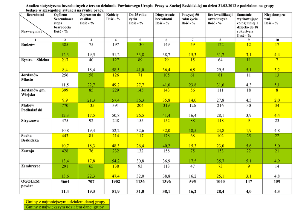 Analiza statystyczna bezrobotnych z terenu działania Powiatowego Urzędu Pracy w Suchej Beskidzkiej na dzień 31.03.2012 z podziałem na grupy będące w szczególnej sytuacji na rynku pracy. Bezrobotni Nazwa gminy 1 Ogółem: Szacunkowa stopa bezrobocia Ilość - % Z prawem do zasiłku Ilość - % Kobiety Ilość - % Do 25 roku życia Ilość - % Długotrwale bezrobotni Ilość - % Powyżej 50 roku życia – Ilość - % Bez kwalifikacji zawodowych Ilość - % Samotnie wychowujące co najmniej 1 dziecko do 18 roku życia Ilość - % 9 Niepełnosprawni Ilość - % 2 3 4 5 6 7 8 Budzów 385 75 197 130 149 59 122 12 17 Bystra – Sidzina 12,3 217 19,5 40 51,2 127 33,8 89 38,7 79 15,3 15 31,7 64 3,1 11 4,4 7 8,4 256 18,4 58 58,5 126 41,0 71 36,4 105 6,9 61 29,5 81 5,1 11 3,2 13 11,5 399 22,7 85 49,2 229 27,7 145 41,0 143 23,8 56 31,6 111 4,3 18 5,1 8 9,9 770 21,3 135 57,4 391 36,3 204 35,8 319 14,0 126 27,8 216 4,5 30 2,0 34 12,3 475 17,5 92 50,8 248 26,5 155 41,4 152 16,4 88 28,1 118 3,9 9 4,4 23 10,8 443 19,4 81 52,2 214 32,6 117 32,0 178 18,5 68 24,8 102 1,9 25 4,8 22 Zawoja 10,7 428 18,3 76 48,3 232 26,4 132 40,2 158 15,3 75 23,0 153 5,6 22 5,0 21 Zembrzyce 13,4 291 17,8 65 54,2 138 30,8 93 36,9 113 17,5 47 35,7 73 5,1 9 4,9 14 13,6 3664 22,3 707 47,4 1902 32,0 1136 38,8 1396 16,2 595 25,1 1040 3,1 147 4,8 159 11,4 19,3 51,9 31,0 38,1 16,2 28,4 4,0 4,3 Jordanów Miasto Jordanów gm. Wiejska Maków Podhalański Stryszawa Sucha Beskidzka OGÓŁEM powiat Gminy z najmniejszym udziałem danej grupy Gminy z największym udziałem danej grupy 10 Bezrobotni Nazwa gminy 11 Kobiety, które nie podjęły zatrudnienia po urodzeniu dziecka Ilość - % 12 Bez doświadczenia zawodowego Ilość - % Bez wykształcenia średniego Ilość - % Po odbyciu kary pozbawienia wolności nie podjęli zatrudnienia Ilość - % 15 13 14 41 99 235 5 10,6 29 25,7 79 61,0 110 1,3 0 13,4 17 36,4 59 50,7 126 0,0 7 6,6 49 23,0 113 49,2 213 2,7 4 12,3 99 28,3 246 53,4 435 1,0 13 12,9 36 31,9 137 56,5 262 1,7 7 7,6 47 28,8 118 55,2 225 1,5 13 Zawoja 10,6 59 26,6 137 50,8 253 2,9 4 Zembrzyce 13,8 27 32,0 82 59,1 165 0,9 3 9,3 404 28,2 1070 56,7 2024 1,0 56 11,0 29,2 55,2 1,5 Budzów Bystra – Sidzina Jordanów Miasto Jordanów gm. Wiejska Maków Podhalański Stryszawa Sucha Beskidzka OGÓŁEM powiat Gminy z najmniejszym udziałem danej grupy Gminy z największym udziałem danej grupy Opracował: Zenon Przysiężniak, na podstawie danych statystycznych PUP w Suchej Beskidzkiej Sucha Beskidzka, dnia 11.04.2012 r.