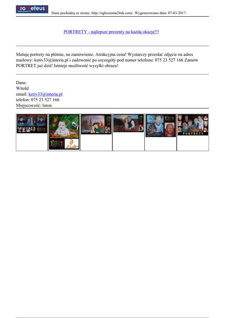 Dane pochodzą ze strony: http://ogloszenia24uk.com/. Wygenerowano dnia: 07-03-2017. PORTRETY - najlepsze prezenty na każdą okazję!!! Maluję portrety na płótnie, na zamówienie. Atrakcyjna cena! Wystarczy przesłać zdjęcie na adres mailowy: [email protected] i zadzwonić po szczegóły pod numer telefonu: 075 23 527 166 Zamów PORTRET już dziś! Istnieje możliwość wysyłki obrazu! Dane: Witold email: [email protected] telefon: 075 23 527 166 Miejscowość: luton