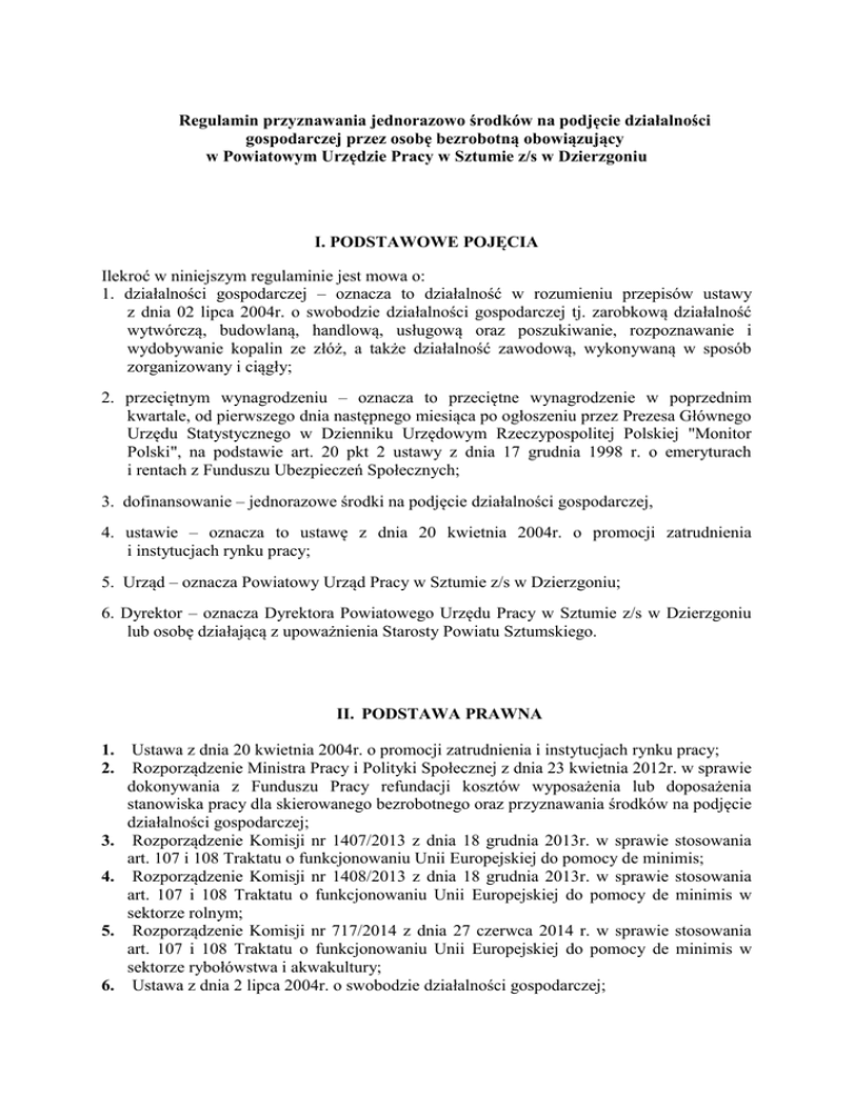 Regulamin przyznawania jednorazowo środków na podjęcie działalności gospodarczej przez osobę bezrobotną obowiązujący w Powiatowym Urzędzie Pracy w Sztumie z/s w Dzierzgoniu I. PODSTAWOWE POJĘCIA Ilekroć w niniejszym regulaminie jest mowa o: 1. działalności gospodarczej – oznacza to działalność w rozumieniu przepisów ustawy z dnia 02 lipca 2004r. o swobodzie działalności gospodarczej tj. zarobkową działalność wytwórczą, budowlaną, handlową, usługową oraz poszukiwanie, rozpoznawanie i wydobywanie kopalin ze złóż, a także działalność zawodową, wykonywaną w sposób zorganizowany i ciągły; 2. przeciętnym wynagrodzeniu – oznacza to przeciętne wynagrodzenie w poprzednim kwartale, od pierwszego dnia następnego miesiąca po ogłoszeniu przez Prezesa Głównego Urzędu Statystycznego w Dzienniku Urzędowym Rzeczypospolitej Polskiej "Monitor Polski", na podstawie art. 20 pkt 2 ustawy z dnia 17 grudnia 1998 r. o emeryturach i rentach z Funduszu Ubezpieczeń Społecznych; 3. dofinansowanie – jednorazowe środki na podjęcie działalności gospodarczej, 4. ustawie – oznacza to ustawę z dnia 20 kwietnia 2004r. o promocji zatrudnienia i instytucjach rynku pracy; 5. Urząd – oznacza Powiatowy Urząd Pracy w Sztumie z/s w Dzierzgoniu; 6. Dyrektor – oznacza Dyrektora Powiatowego Urzędu Pracy w Sztumie z/s w Dzierzgoniu lub osobę działającą z upoważnienia Starosty Powiatu Sztumskiego. II. PODSTAWA PRAWNA 1. 2. 3. 4. 5. 6. Ustawa z dnia 20 kwietnia 2004r. o promocji zatrudnienia i instytucjach rynku pracy; Rozporządzenie Ministra Pracy i Polityki Społecznej z dnia 23 kwietnia 2012r. w sprawie dokonywania z Funduszu Pracy refundacji kosztów wyposażenia lub doposażenia stanowiska pracy dla skierowanego bezrobotnego oraz przyznawania środków na podjęcie działalności gospodarczej; Rozporządzenie Komisji nr 1407/2013 z dnia 18 grudnia 2013r. w sprawie stosowania art. 107 i 108 Traktatu o funkcjonowaniu Unii Europejskiej do pomocy de minimis; Rozporządzenie Komisji nr 1408/2013 z dnia 18 grudnia 2013r. w sprawie stosowania art. 107 i 108 Traktatu o funkcjonowaniu Unii Europejskiej do pomocy de minimis w sektorze rolnym; Rozporządzenie Komisji nr 717/2014 z dnia 27 czerwca 2014 r. w sprawie stosowania art. 107 i 108 Traktatu o funkcjonowaniu Unii Europejskiej do pomocy de minimis w sektorze rybołówstwa i akwakultury; Ustawa z dnia 2 lipca 2004r. o swobodzie działalności gospodarczej; Ustawa z dnia 20 sierpnia 1997 r. o Krajowym Rejestrze Sądowym; Ustawa z dnia 30 kwietnia 2004r. o postępowaniu w sprawach dotyczących pomocy publicznej; 9. Ustawy z dnia 23 kwietnia 1964 r. Kodeks cywilny. 10. Rozporządzenie Rady Ministrów z dnia 29 marca 2010 r. w sprawie zakresu informacji przedstawianych przez podmiot ubiegający się o pomoc de minimis; 11. Rozporządzenie Rady Ministrów z dnia 24 października 2014 r. zmieniające rozporządzenie w sprawie zakresu informacji przedstawianych przez podmiot ubiegający się o pomoc de minimis. 7. 8. III. OSOBY UPRAWNIONE DO OTRZYMANIA ŚRODKÓW 1. Do otrzymania dofinansowania na podjęcie działalności gospodarczej uprawniona jest osoba bezrobotna, która spełnia następujące warunki: a) ma ustalony II profil pomocy, b) ma opracowany Indywidualny Plan Działania (IPD), c) dodatkowe kryteria, w ramach projektów, w zależności od finansowania; IV. INFORMACJE OGÓLNE 1. Przed złożeniem wniosku osoba bezrobotna zobowiązana jest do rozmowy z doradcą zawodowym w celu uzyskania opinii na temat predyspozycji wnioskodawcy do prowadzania działalności gospodarczej. 2. Dofinansowanie może być przyznane w wysokości określonej w umowie, nie wyższej jednak niż 6-krotnej wysokości przeciętnego wynagrodzenia, które przyjmowane jest na dzień zawarcia umowy. 3. Dofinansowanie przekazywane jest wyłącznie na rachunek bankowy wskazany przez wnioskodawcę. 4. Urząd nie może przyznać dofinansowania osobom, które: a) otrzymały bezzwrotne środki z Funduszu Pracy lub inne bezzwrotne środki publiczne na podjęcie działalności gospodarczej lub rolniczej, założyły lub przystąpiły do spółdzielni socjalnej, b) posiadają wpis do ewidencji działalności gospodarczej w okresie 12 miesięcy bezpośrednio poprzedzających dzień złożenia wniosku, c) były karane w okresie 2 lat przed dniem złożenia wniosku za przestępstwo przeciwko obrotowi gospodarczemu, w rozumieniu ustawy z dnia 6 czerwca 1997r. - Kodeks karny lub ustawy z dnia 28 października 2002r. o odpowiedzialności podmiotów za czyny zabronione pod groźbą kary, d) złożyły wniosek do innego starosty o przyznanie dofinansowania lub przyznanie jednorazowo środków na założenie lub przystąpienie do spółdzielni socjalnej, e) w okresie 12 miesięcy bezpośrednio poprzedzających dzień złożenia wniosku: - odmówiły bez uzasadnionej przyczyny przyjęcia propozycji odpowiedniej pracy lub innej formy pomocy określonej w ustawie oraz udziału w działaniach w ramach Programu Aktywizacja i Integracja, o którym mowa w art. 62a ustawy o promocji zatrudnienia i instytucjach rynku pracy, - przerwały z własnej winy szkolenie, staż, realizację indywidualnego planu działania, udział w ramach Programu Aktywizacja i Integracja, o którym mowa w art. 62 a ustawy, wykonywanie prac społecznie użytecznych lub inną formę pomocy określoną w ustawie, - po skierowaniu nie podjęły szkolenia, przygotowania zawodowego dorosłych, stażu, prac społecznie użytecznych lub innej formy pomocy określonej w ustawie. 5. Wnioski w sprawie przyznania jednorazowo środków na podjęcie działalności gospodarczej przyjmowane i rozpatrywane są na bieżąco. 6. Złożenie wniosku nie gwarantuje przyznania dofinansowania, jak również nie zwalnia z konieczności stawiania się na obowiązkowe wizyty w Urzędzie w wyznaczonych terminach. 7. Złożony wniosek wraz z dokumentacją nie podlega zwrotowi. Urząd nie wydaje kopii wniosku lub jeg