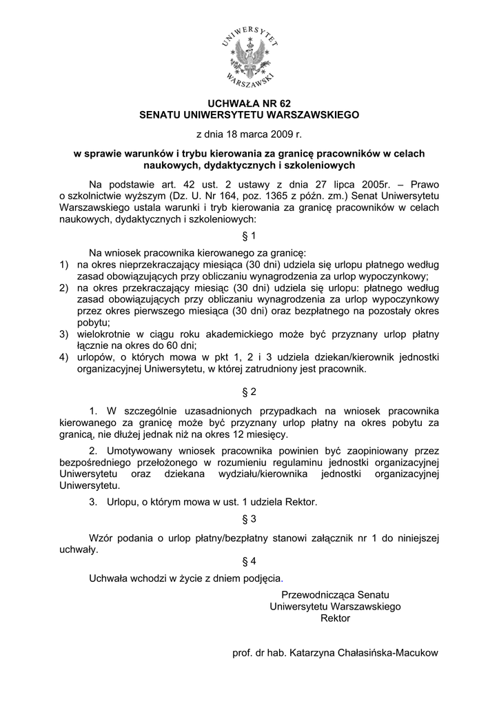 UCHWAŁA NR 62 SENATU UNIWERSYTETU WARSZAWSKIEGO z dnia 18 marca 2009 r. w sprawie warunków i trybu kierowania za granicę pracowników w celach naukowych, dydaktycznych i szkoleniowych Na podstawie art. 42 ust. 2 ustawy z dnia 27 lipca 2005r. – Prawo o szkolnictwie wyższym (Dz. U. Nr 164, poz. 1365 z późn. zm.) Senat Uniwersytetu Warszawskiego ustala warunki i tryb kierowania za granicę pracowników w celach naukowych, dydaktycznych i szkoleniowych: §1 Na wniosek pracownika kierowanego za granicę: 1) na okres nieprzekraczający miesiąca (30 dni) udziela się urlopu płatnego według zasad obowiązujących przy obliczaniu wynagrodzenia za urlop wypoczynkowy; 2) na okres przekraczający miesiąc (30 dni) udziela się urlopu: płatnego według zasad obowiązujących przy obliczaniu wynagrodzenia za urlop wypoczynkowy przez okres pierwszego miesiąca (30 dni) oraz bezpłatnego na pozostały okres pobytu; 3) wielokrotnie w ciągu roku akademickiego może być przyznany urlop płatny łącznie na okres do 60 dni; 4) urlopów, o których mowa w pkt 1, 2 i 3 udziela dziekan/kierownik jednostki organizacyjnej Uniwersytetu, w której zatrudniony jest pracownik. §2 1. W szczególnie uzasadnionych przypadkach na wniosek pracownika kierowanego za granicę może być przyznany urlop płatny na okres pobytu za granicą, nie dłużej jednak niż na okres 12 miesięcy. 2. Umotywowany wniosek pracownika powinien być zaopiniowany przez bezpośredniego przełożonego w rozumieniu regulaminu jednostki organizacyjnej Uniwersytetu oraz dziekana wydziału/kierownika jednostki organizacyjnej Uniwersytetu. 3. Urlopu, o którym mowa w ust. 1 udziela Rektor. §3 Wzór podania o urlop płatny/bezpłatny stanowi załącznik nr 1 do niniejszej uchwały. §4 Uchwała wchodzi w życie z dniem podjęcia. Przewodnicząca Senatu Uniwersytetu Warszawskiego Rektor prof. dr hab. Katarzyna Chałasińska-Macukow