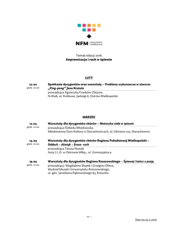 Temat edycji 2016 Improwizacja i ruch w śpiewie LUTY 27.02 godz. 10.00 Spotkanie dyrygentów oraz warsztaty – Problemy wykonawcze w utworze „Ping-pong” Jana Krutula prowadząca Agnieszka Franków-Żelazny N-Klub, ul. Królowej Jadwigi 8, Ostrów Wielkopolski MARZEC 12.03 godz. 10.00 14.03 godz. 10.00 19.03 godz. 10.00 Warsztaty dla dyrygentów chórów – Motoryka ciała w śpiewie prowadząca Elżbieta Wtorkowska Młodzieżowy Dom Kultury w Starachowicach, ul. Gliniana 10a, Starachowice Warsztaty dla dyrygentów chórów Regionu Południowej Wielkopolski – Oddech – dźwięk – fraza- ruch prowadząca Teresa Nowak Aula I L.O. w Ostrowie Wlkp., ul. Gimnazjalna 9 Warsztaty dla dyrygentów Regionu Rzeszowskiego – Śpiewaj i tańcz z pasją prowadzący: Magdalena Słupek i Grzegorz Oliwa, Wydział Muzyki Uniwersytetu Rzeszowskiego, ul. gen. Jarosława Dąbrowskiego 83, Rzeszów str. 1 Stan na 25.11.2016 KWIECIEŃ 16.04 godz. 11.00 - 22.00 17.04 godz. 8.00 - 17.00 18.04 godz. 16.00 – 20.00 Warsztaty ogólnopolskie dla dyrygentów Śpiewające ciało prowadząca Anna Krotoska Funkcjonowanie zespołu - lustrem motywacji i postaw dyrygenta prowadząca Joanna Misiek-Zbierska Centrum Szkoleniowe Falenty, al. Hrabska 4, Raszyn-Falenty Warsztaty dla dyrygentów Regionu Opolskiego – Interpretacja utworu a zgodność z partyturą w kontekście przygotowania chóru do występu konkursowego prowadząca Izabela Polakowska-Rybska Wydział Muzykologii Uniwersytetu Opolskiego ul. Drzymały 1A, Opole 21.04 Warsztaty dla dyrygentów chórów Regionu Szczecińskiego – Rytmiczne ciało w śpiewie prowadząca Anna Tarnowska Szkoła Podstawowa nr 56, ul. Malczewskiego 22, Szczecin 23.04 Warsztaty ogólnopolskie dla dyrygentów Śpiewające ciało prowadząca Anna Krotoska Funkcjonowanie zespołu - lustrem motywacji i postaw dyrygenta prowadząca Joanna Misiek-Zbierska Hotel Novotel Poznań Malta, ul. Termalna 5, Poznań godz. 11.00 - 22.00 24.04 godz. 8.00 - 17.00 25.04 godz. 10.00 24.04-02.05 25-29.04 29.04 godz. 19.00 30.04 godz. 19.00 Przegląd Chórów Regionu Starachowice Muzeum Przyrody i Techniki Ekomuzeum im. Jana Pazdura, ul. Wielkopiecowa 1, Starachowice Sesja wiosenna Polskiego Narodowego Chóru Młodzieżowego Chór w muzyce „mniej poważnej” Olsztyn Seminarium dyrygentów przy sesji wiosennej Polskiego Narodowego Chóru Młodzieżowego Olsztyn Koncert Akademii Chóralnej w Gdańsku Chór Music Everywhere, dyrygent Beata Śnieg Polski Narodowy Chór Młodzieżowy, dyrygenci: Marcin Wawruk, Roger Treece Akademia Muzyczna im. Stanisława Moniuszki, ul. Łakowa 1-2, Gdańsk Koncert Akademii Chóralnej w Malborku Chór Music Everywhere, dyrygent Beata Śnieg Polski Narodowy Chór Młodzieżowy, dyrygenci: Marcin Wawruk, Roger Treece Muzeum zamkowe, ul. Starościńska 1, Malbork str. 2 Stan na 25.11.2016 MAJ 1.05 godz. 19.00 10.05 godz. 12.00 12.05 godz. 10.00 - 12.00 12.05 godz. 13.00 14.05 godz. 10.00 - 14.30 18.05 godz. 10.00 18.05 godz. 18.45 20.05 godz. 16.00 20.05 godz. 10.30 20.05 godz. 9.00 – 18.00 20.05 godz. 15.30 - 18.00 21.05 Koncert Akademii Chóralnej w Olsztynie Chór Music Everywhere, dyrygent Beata Śnieg Polski Narodowy Chór Młodzieżowy, dyrygenci: Marcin Wawruk, Roger Treece Filharmonia Warmińsko-Mazurska, ul. Bartosza Głowackiego 1, Olsztyn Przegląd Chórów Regionu Małopolskiego Europejskie Centrum Muzyki Krzysztofa Pendereckiego w Lusławicach, Lusławice 250, Zakliczyn Warsztaty dla dyrygentów – Z zakamarków ludzkiego ciała – głos bez tajemnic prowadzenie warsztatów Bogumiła Tarasiewicz Kościół p. w. Podwyższenia Krzyża, pl. B. Błyskoszowej 6, Zielona Góra - Ochla Przegląd Chórów Regionu Lubuskiego Kościół p. w. Podwyższenia Krzyża, pl. B. Błyskoszowej 6, Zielona Góra - Ochla Przegląd Chórów Regionu Warszawskiego Państwowa Szkoła Muzyczna I st. nr 2 im. Fryderyka Chopina, ul. Namysłowska, Warszawa Przegląd Chórów Regionu Bydgoskiego Sala Koncertowa Akademii Muzycznej im. F. Nowowiejskiego, ul. Gdańska 2, Bydgoszcz Koncert Chórów Regionu Podlaskiego w ramach Festiwalu Nauki i Sztuki Kościół pw. bł. Bolesławy Lament, ul. Marii Dąbrowskiej 3, Białystok Warsztaty dla dyrygentów chórów – Na cztery i na sześć prowadząca Ewelina Boesche-Kopczyńska, Aula Akademii Muzycznej im. Feliksa Nowowiejskiego, ul. Słowackiego 7, Bydgoszcz XVI Pomorski Przegląd Chórów Akademii Chóralnej Śpiewającej Polski Sala koncertowa Akademii Muzycznej im. Stanisława Moniuszki, ul. Łąkowa 1-2, Gdańsk Przegląd Chórów Regionu Południowej Wielkopolski Aula Domu Katechetycznego przy Kościele, pw. św. Antoniego, ul. Raszkowska, Ostrów Wielkopolski Przegląd Chórów Regionu Lubelskiego Aula Zespołu Szkół nr 5, ul. Józefa Elsnera, Lublin godz. 10.00 - 13.30 str. 3 Stan na 25.11.2016 21.05 godz. 11.00 21.05 godz. 14.00 22.05 godz. 10.00 - 14.00 22.05 godz. 14.00 23.05 godz. 10.00 - 18.00 23.05 godz. 12.00 23.05 godz. 11.00 31.05 godz. 11.00 Przegląd Chórów Regionu Poznańskiego Aula Akademii Muzycznej im. I. J. Paderewskiego, ul. Św. Marcin 87, Poznań Warsztaty dla dyrygentów – Emisja w pracy z zespołem dziecięcomłodzieżowym prowadzenie warsztatów Barbara Tritt Aula Akademii Muzycznej im. I. J. Paderewskiego, ul. Św. Marcin 87, Poznań Przegląd Chórów Regionu Opolskiego i Katowickiego Akademia Muzyczna im. Karola Szymanowskiego, ul. Zacisze 3, Katowice Warsztaty dla dyrygentów i chórów Regionu Opolskiego i Katowickiego prowadzące warsztaty: Małgorzata Sapiecha-Muzioł, Iga Eckert Akademia Muzyczna im. Karola Szymanowskiego, ul. Zacisze 3, Katowice Przegląd Chórów Regionu Wrocławskiego i Dolnego Śląska Zespół Szkół nr 1, ul. Słubicka, Wrocław Przegląd Chórów Regionu Rzeszowskiego Wydział Muzyki Uniwersytetu Rzeszowskiego, ul. Dąbrowskiego 83, Rzeszów Przegląd Chórów Regionu Podlaskiego Centrum Wystawienniczo-Konferencyjne Archidiecezji Białostockiej, ul. Kościelna 1a, B