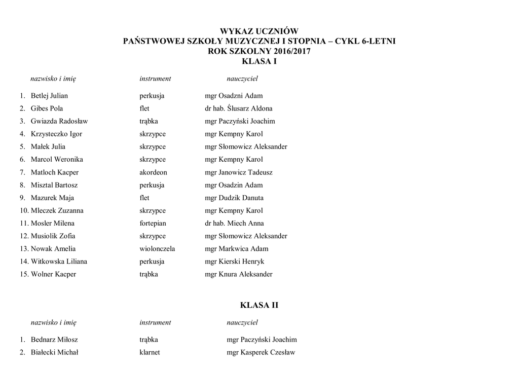 WYKAZ UCZNIÓW PAŃSTWOWEJ SZKOŁY MUZYCZNEJ I STOPNIA – CYKL 6-LETNI ROK SZKOLNY 2016/2017 KLASA I nazwisko i imię instrument nauczyciel 1. Betlej Julian perkusja mgr Osadzni Adam 2. Gibes Pola flet dr hab. Ślusarz Aldona 3. Gwiazda Radosław trąbka mgr Paczyński Joachim 4. Krzysteczko Igor skrzypce mgr Kempny Karol 5. Małek Julia skrzypce mgr Słomowicz Aleksander 6. Marcol Weronika skrzypce mgr Kempny Karol 7. Matloch Kacper akordeon mgr Janowicz Tadeusz 8. Misztal Bartosz perkusja mgr Osadzin Adam 9. Mazurek Maja flet mgr Dudzik Danuta 10. Mleczek Zuzanna skrzypce mgr Kempny Karol 11. Mosler Milena fortepian dr hab. Miech Anna 12. Musiolik Zofia skrzypce mgr Słomowicz Aleksander 13. Nowak Amelia wiolonczela mgr Markwica Adam 14. Witkowska Liliana perkusja mgr Kierski Henryk 15. Wolner Kacper trąbka mgr Knura Aleksander KLASA II nazwisko i imię instrument nauczyciel 1. Bednarz Miłosz trąbka mgr Paczyński Joachim 2. Białecki Michał klarnet mgr Kasperek Czesław 3. Błatoń Zuzanna klarnet mgr Sobik Sebastian 4. Buchta Paweł skrzypce mgr Kempny Karol 5. Chromik Matylda wiolonczela mgr Lubińska Marianna 6. Cisek Antoni puzon dr hab. Śmietana Stanisław 7. Dąbkowska Łucja fortepian mgr Ulbrich Iwona 8. Gajda Julia skrzypce mgr Kempny Karol 9. Grochowska Daria fortepian mgr Ulbrich Iwona 10. Hajska Nina skrzypce mgr Słomian Zbigniew 11. Juraszek Nikola wiolonczela mgr Lubińska Marianna 12. Macura Maciej fortepian dr hab. Miech Anna 13. Maruszewski Rafał fortepian mgr Bugla-Słomian Izabela 14. Matuszczak Szymon akordeon mgr Janowicz Tadeusz 15. Mosoń Nikodem wiolonczela mgr Lubińska Marianna 16. Podeszwa Zofia skrzypce mgr Kempny Karol 17. Porwoł Antoni fortepian mgr Ulbrich Iwona 18. Szydłowski Aureliusz obój mgr Ludwik Marek 19. Urgoł Natalia skrzypce mgr Kempny Karol 20. Wcisło Wiktoria fortepian dr hab. Miech Anna 21. Welchar Filip perkusja mgr Osadzin Adam 22. Wiaska Ines gitara mgr Otremba Andrzej 23. Wilk Hanna perkusja mgr Kierski Henryk 24. Wołoszyn Laura flet dr hab. Ślusarz Aldona 25. Wójcik Katarzyna skrzypce mgr Słomian Zbigniew KLASA III nazwisko i imię instrument nauczyciel 1. Brzoza Marcin perkusja mgr Kierski Henryk 2. Feczko Antonina wiolonczela mgr Lubińska Marianna 3. Gadlina Kamil fortepian doc. Seligman Janusz 4. Giza Emilia fortepian dr hab. Miech Anna 5. Gondek Zofia skrzypce mgr Słomian Zbigniew 6. Grabiec Marlena akordeon mgr Janowicz Tadeusz 7. Jackowska Anna skrzypce mgr Słomian Zbigniew 8. Jankowska Julia fortepian mgr Ulbrich Iwona 9. Jastrzębski Jan perkusja mgr Kierski Henryk 10. Juchnik Amelia skrzypce mgr Słomian Zbigniew 11. Kloczkowski Mateusz fortepian mgr Pala Marek 12. Klyszcz Dominika flet mgr Dudzik Danuta 13. Kupczak Dominika obój mgr Ludwik Marek 14. Kupczak Zofia wiolonczela mgr Markwica Adam 15. Litwińczuk Kacper perkusja mgr Kierski Henryk 16. Ludwiczak Alicja skrzypce mgr Kempny Karol 17. Maciejewski Michał obój mgr Ludwik Marek 18. Marzańska Amelia skrzypce mgr Słomian Zbigniew 19. Masny Wiktoria fortepian dr hab. Miech Anna 20. Matuszczak Wioleta wiolonczela mgr Lubińska Marianna 21. Matuszny Majka gitara mgr Otremba Andrzej 22. Prątnicka Olga fortepian dr hab. Miech Anna 23. Prysak Antonina wiolonczela mgr Markwica Adam 24. Stanek Aleksandra fortepian mgr Ulbrich Iwona 25. Torz Anastazja gitara mgr Otremba Andrzej 26. Wachtarczyk Kinga fortepian doc. Seligman Janusz 27. Walczak Maria wiolonczela mgr Markwica Adam KLASA IV nazwisko i imię instrument nauczyciel praca z akompaniatorem 1. Biernacka Agata skrzypce mgr Słomian Zbigniew mgr Bugla-Słomian Izabela 2. Błasiak Dominika fortepian mgr Pala Marek ---------------------------------- 3. Bochnak Julia fortepian doc. Seligman Janusz ---------------------------------- 4. Dusza Aleksandra flet mgr Dudzik Danuta mgr Solik Krzysztof 5. Frank Antonina skrzypce mgr Słomian Zbigniew mgr Bugla-Słomian Izabela 6. Frączek Karolina flet mgr Dudzik Danuta mgr Solik Krzysztof 7. Gazur Julia klarnet mgr Śmietana Piotr 8. Grabowski Tymoteusz fortepian doc. Seligman Janusz ---------------------------------- 9. Grzonka Kacper fortepian mgr Ulbrich Iwona ---------------------------------- 10. Jabłońska Kinga wiolonczela mgr Markwica Adam mgr Solik Krzysztof 11. Kędzia Helena skrzypce mgr Słomian Zbigniew mgr Bugla-Słomian Izabela 12. Kłak Zofia wiolonczela mgr Lubińska Marianna mgr Solik Krzysztof 13. Lorenz Hanna gitara mgr Otremba Andrzej ---------------------------------- 14. Matuszczak Natalia gitara mgr Otremba Andrzej ---------------------------------- 15. Miler Tomasz perkusja mgr Osadzin Adam mgr Solik Krzysztof 16. Mleczko Amelia skrzypce mgr Słomian Zbigniew mgr Bugla-Słomian Izabela 17. Mosoń Paweł perkusja mgr Osadzin Adam mgr Solik Krzysztof 18. Plonka Mateusz obój mgr Ludwik Marek mgr Solik Krzysztof 19. Salamon Radosław akordeon mgr Janowicz Tadeusz ----------------------------------- 20. Smolorz Dorota klarnet mgr Śmietana Piotr 21. Stachoń Łucja fortepian mgr Bugla-Słomian Izabela ----------------------------------- 22. Stencel Małgorzata gitara mgr Otremba Andrzej ----------------------------------- 23. Stencel Weronika fortepian dr. hab. Miech Anna ----------------------------------- 24. Wcisło Weronika skrzypce mgr Kempny Karol mgr Bugla-Słomian Izabela 25. Wita Sonia skrzypce mgr Kempny Karol mgr Solik Krzysztof 26. Wróblewska Julia skrzypce mgr Słomian Zbigniew mgr Bugla-Słomian Izabela KLASA V lp. nazwisko i imię instrument nauczyciel fortepian dodatkowy praca z akompaniatorem 1. Bernas Julia skrzypce mgr Słomowicz Aleksander mgr Bugla-Słomian Izabela mgr Pala Tomasz 2. Cichońska Agnieszka klarnet mgr Kasperek Antoni mgr Bugla-Słomian Izabela mgr Solik Krzysztof 3. Cichońska Kinga skrzypce mgr Słomowicz Aleksander mgr Bugla-Słomian Izabela mgr Pala Tomasz 4. Faruga Zbigniew fortepian doc. Seligman Janusz ---------------------------- --------------------------------- 5. Gatner Natalia wiolonczela mgr Ma