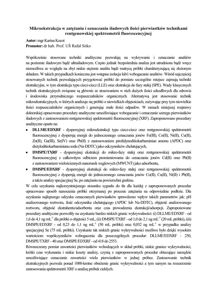 Mikroekstrakcja w zatężaniu i oznaczaniu śladowych ilości pierwiastków technikami rentgenowskiej spektrometrii fluorescencyjnej Autor: mgr Karina Kocot Promotor: dr hab. Prof. UŚ Rafał Sitko Współcześnie stosowane techniki analityczne pozwalają na wykrywanie i oznaczanie analitów na poziomie śladowym bądź ultraśladowym. Często jednak bezpośrednia analiza jest utrudniona bądź wręcz niemożliwa ze względu na zbyt niskie stężenie analitu bądź matrycę próbki charakteryzującą się złożonym składem. W takich przypadkach konieczna jest wstępna izolacja lub/i wzbogacanie analitów. Wśród najczęściej stosowanych technik pozwalających przygotować próbki do pomiaru szczególne miejsce zajmują techniki ekstrakcyjne, w tym ekstrakcja typu ciecz-ciecz (LLE) oraz ekstrakcja do fazy stałej (SPE). Wady klasycznych technik ekstrakcyjnych związane są głównie ze stosowaniem w nich dużych ilości szkodliwych dla zdrowia i środowiska przyrodniczego rozpuszczalników organicznych. Alternatywą jest stosowanie technik mikroekstrakcyjnych, w których analizuje się próbki o niewielkich objętościach, zużywając przy tym niewielkie ilości rozpuszczalników organicznych i generując małe ilości odpadów. W ramach niniejszej rozprawy doktorskiej opracowano procedury analityczne umożliwiające wzbogacanie i oznaczanie szeregu pierwiastków śladowych z zastosowaniem rentgenowskiej spektrometrii fluorescencyjnej (XRF). Zaproponowano procedury analityczne oparte na: DLLME/EDXRF - dyspersyjnej mikroekstrakcji typu ciecz-ciecz oraz rentgenowskiej spektrometrii fluorescencyjnej z dyspersją energii do jednoczesnego oznaczania jonów Fe(III), Co(II), Ni(II), Cu(II), Zn(II), Ga(III), Se(IV) oraz Pb(II) z zastosowaniem pirolidynoditiokarbaminian amonu (APDC) oraz dietyloditiokarbaminianu sodu (Na-DDTC) jako odczynników chelatujących, DMSPE/TXRF - dyspersyjnej ekstrakcji do mikro-fazy stałej oraz rentgenowskiej spektrometrii fluorescencyjnej z całkowitym odbiciem promieniowania do oznaczania jonów Cd(II) oraz Pb(II) z zastosowaniem wielościennych nanorurek węglowych (MWCNT) jako adsorbentu, DMSPE/EDXRF - dyspersyjnej ekstrakcji do mikro-fazy stałej oraz rentgenowskiej spektrometrii fluorescencyjnej z dyspersją energii do jednoczesnego oznaczania jonów Co(II), Cu(II), Ni(II) i Pb(II), a także analizy specjacyjnej Se, po zatężaniu na powierzchni grafenu. W celu uzyskania najkorzystniejszego stosunku sygnału do tła dla każdej z zaproponowanych procedur opracowano sposób nanoszenia próbki otrzymanej po procesie zatężania na odpowiednie podłoże. Dla uzyskania najlepszego odzysku oznaczanych pierwiastków sprawdzono wpływ takich parametrów jak: pH analizowanego roztworu, ilość odczynnika chelatującego (APDC lub Na-DDTC), objętość analizowanego roztworu, objętość ekstrahentu/adsorbentu oraz czas prowadzenia ekstrakcji/adsorpcji. Zaproponowane procedury analityczne pozwoliły na uzyskanie bardzo niskich granic wykrywalności: (i) DLLME/EDXRF - od 1,6 do 4,1 ng mL-1 dla próbki o objętości 5 mL, (ii) DMSPE/TXRF - od 1,0 do 2,1 ng mL-1 (20 mL próbki), (iii) DMSPE/EDXRF - od 0,23 do 1,1 ng mL-1 (50 mL próbki) oraz 0,032 ng mL-1 w przypadku analizy specjacyjnej Se (75 mL próbki). Uzyskanie tak niskich granic wykrywalności możliwe było dzięki wysokim wartościom współczynników wzbogacenia dla poszczególnych procedur: DLLME/EDXRF - 250, DMSPE/TXRF - 40 oraz DMSPE/EDXRF - od 418 do 2553. Równoczesny pomiar zawartości pierwiastków wchodzących w skład próbki, niskie granice wykrywalności, krótki czas wykonania i niskie koszty analizy, czynią z zaproponowanych procedur obiecujące narzędzie umożliwiające oznaczanie zawartości wielu pierwiastków w jednej próbce. Zastosowanie technik ekstrakcyjnych pozwala ponad 1000-krotne obniżenie granic wykrywalności a tym samym na rozszerzenie zastosowania spektrometrii XRF o analizę próbek ciekłych.