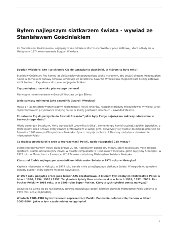 Byłem najlepszym siatkarzem świata - wywiad ze Stanisławem Gościniakiem Ze Stanisławem Gościniakiem, najlepszym zawodnikiem Mistrzostw Świata w piłce siatkowej, które odbyły się w Meksyku w 1974 roku rozmawia Bogdan Wiekiera. Bogdan Wiekiera: Kto i co skłoniło Cię do uprawiania siatkówki, w którym to było roku? Stanisław Gościniak: Pod koniec lat pięćdziesiątych poprzedniego wieku marzyłem, aby zostać pilotem. Rozpocząłem naukę w technikum budowy silników lotniczych we Wrocławiu. Gwardia Wrocławska zorganizowała turniej siatkówki szkół średnich. Zagrałem w drużynie swojego technikum. Czy pamiętasz nazwisko pierwszego trenera? Pierwszym moim trenerem w Gwardii Wrocław był Jan Śliwka. Jakie sukcesy odniosłeś jako zawodnik Gwardii Wrocław? Mając 17 lat zostałem wystawiającym reprezentacji Polski juniorów, następnie drużyny młodzieżowej. W wieku 19 lat reprezentowałem już pierwszą drużynę Polski, w której grał także Jasiu Such – zawodnik Resovii. Co skłoniło Cię do przejścia do Resovii Rzeszów? Jakie były Twoje największe sukcesy odniesione w barwach tego klubu? Młody trener Jan Strzelczyk, który wprowadził „podwójną krótką”, elementy gry kombinacyjnej, szybkiej japońskiej, a także młody skład Resovii, który zawsze preferowałem w swojej grze, przyczyniły się właśnie do mojego przejścia do Resovii w 1968 roku po Olimpiadzie w Meksyku. Była to decyzja osobista. Z Resovią zdobyłem czterokrotnie mistrzostwo Polski. Co możesz powiedzieć o grze w reprezentacji Polski, gdzie rozegrałeś 218 meczy? Byłem reprezentantem Polski przez prawie 20 lat. Rozegrałem ponad 200 meczy, które zaspokajały moje ambicje sportowe. Brałem udział między innymi w dwóch Olimpiadach: w 1968 roku w Meksyku, gdzie zajęliśmy 5 miejsce i w 1972 roku w Monachium – 9 miejsce. W 1974 roku zdobyliśmy Mistrzostwo Świata w Meksyku. Kto uznał Ciebie najlepszym zawodnikiem Mistrzostw Świata w 1974 roku w Meksyku? Kapituła mistrzostw w Meksyku w 1974 roku uznała mnie za najlepszego siatkarza świata. W nagrodę otrzymałem okazały puchar, który sprawił mi pełną satysfakcję. W 1977 roku podjąłeś pracę jako trener AZS Częstochowa. Z klubem tym zdobyłeś Mistrzostwo Polski w latach 1990, 1994, 1995 i 1997. Trzykrotnie tytuły V-ce mistrzowskie w latach 1991, 1992 i 2001. Raz Puchar Polski w 1998 roku, a w 1995 roku Super Puchar. Który z tych tytułów cenisz najwyżej? Wszystko co dzieje się po raz pierwszy sprawia największą radość. Dlatego pierwsze Mistrzostwo Polski zdobyte w 1990 roku cenię najbardziej. W latach 1986-1987 byłeś trenerem reprezentacji Polski. Ponownie pełniłeś rolę trenera w latach 2003-2004. Jakie w tym czasie miałeś osiągnięcia? 1 Na Mistrzostwach Świata w Paryżu nasza reprezentacja zajęła 9 miejsce, a na Olimpiadzie w Atenach miejsce 5-8. Byłem również trzykrotnie trenerem drużyn akademickich na Mistrzostwach Świata. Jak toczą się Twoje lata pracy jako trenera po 2004 roku? W 2005 roku zacząłem pracę w „Norwidzie”, gdzie z juniorami dwukrotnie zdobyłem Mistrzostwo Polski. Moimi wychowankami są między innymi aktualni reprezentanci Polski: Bieniek i Bednorz. Aktualnie pracuję z młodzieżą Norwida. Uczę ich pracowitości, systematyczności, wyciągania wniosków z porażek. Mam pomysł na pracę z młodzieżą. W 2015 roku zostałem członkiem „Siatkarskiej Galerii Sław” mieszczącej się w Holyoke koło Bostonu. Bardzo Ci dziękuję za możliwość przeprowadzenia tego wywiadu, który miłośnikom siatkówki przybliży Twoje osiągnięcia jako zawodnika a następnie trenera. Cała przyjemność po mojej stronie. Ze sportowym pozdrowieniem! 2