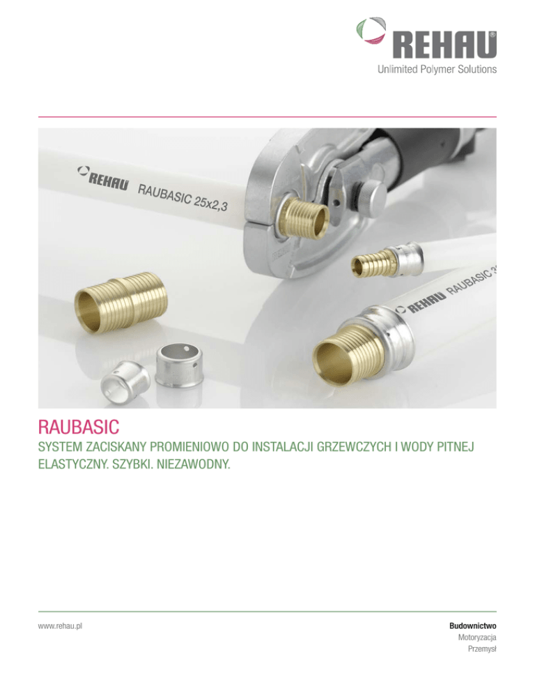 RAUBASIC System zaciskany promieniowo do instalacji grzewczych i wody pitnej elastyczny. szybki. niezawodny. www.rehau.pl Budownictwo Motoryzacja Przemysł System RAUBASIC: zaciskanie promieniowe bez uszczelki O-RING RAUBASIC to system do instalacji wody pitnej i grzewczych o maksymalnym ciśnieniu 6 bar, przeznaczony do zastosowania wewnątrz budynków. System instalacyjny przekonuje przede wszystkim elastycznością oraz szybką i niezawodną techniką łączenia. Instalacja wody pitnej Podłączenie grzejników 2 KOMPONENTy systemu: sprawdzona jakość REHAU Zarówno w instalacjach wody pitnej, jak i grzewczych można stosować rury RAUBASIC o średnicach 16, 20, 25 i 32. System składa się z następujących komponentów: Program rur RAUBASIC --giętkie, bezpieczne rury PE-Xa: -- RAUBASIC Natur: do instalacji wody pitnej -- RAUBASIC Eval z warstwą antydyfuzyjną: do instalacji grzewczych --materiał zapobiega powstawaniu osadów --dostępne średnice 16, 20, 25 a teraz także 32 Rury RAUBASIC Program złączek RAUBASIC --trwale szczelne bez uszczelki O-Ring (możliwość układania pod tynkiem/jastrychem) --z wysokiej jakości mosiądzu --tuleje zaprasowywane ze stali nierdzewnej ze zintegrowanym okienkiem podglądu ułatwiającym kontrolę --jednoznaczne oznakowanie na tulejach (system + średnica) Tworzywo spełniające najwyższe wymagania. Firma REHAU stosuje w rurach RAUBASIC materiał PE-Xa. Skrót ten oznacza polietylen sieciowany w wysokiej temperaturze i pod wysokim ciśnieniem. W tzw. procesie Engela pojedyncze molekuły materiału łączą się w trójwy miarową sieć. Także w przypadku rur o grubych ściankach są one równomiernie i bardzo gęsto sieciowane na całej grubości. Złączki i tuleje RAUBASIC 3 technika łączenia: zaciskanie promieniowe bez uszczelki O-Ring --bez O-Ringów, które w długotrwałej eksploatacji często okazują się słabym punktem --brak konieczności kalibrowania lub fazowania końcówki rury --możliwość natychmiastowego obciążenia ciśnieniem Szybkie wykonanie połączenia w zaledwie czterech krokach: Przycięcie rury RAUBASIC PE-Xa za pomocą nożyc - bez zadziorów i pod kątem prostym - na żądaną długość. 4 Całkowite wsunięcie tulei zaciskowej RAUBASIC ze stali nierdzewnej na końcówkę rury. Otwory kontrolne tulei muszą być całkowicie zasłonięte. narzędzia montażowe: Profesjonalne narzędzia montażowe RAUTOOL Dla zapewnienia trwale szczelnej i komfortowej instalacji REHAU oferuje profesjonalne narzędzia: --uniwersalne narzędzia montażowe RAUTOOL są specjalnie dopasowane do techniki łączenia RAUBASIC. --kompaktowa konstrukcja ułatwia posługiwanie się narzędziem także w trudnej sytuacji montażowej. --wysokiej jakości komponenty są gwarancją stale wysokiej jakości. Zestaw RAUTOOL press 16-25 Cęgi ręczne dla średnic 16 – 25 oraz --nożyce do rur 25 --niezależne od zasilania prądem --wytrzymałe i długowieczne --korzystny cenowo model dla początkujących RAUTOOL press 16 RAUTOOL X-press1 Akumulatorowe narzędzie do zaciskania promieniowego dla średnic 16 – 32 oraz --2 akumulatory i ładowarka --cęgi zaciskowe 16 -32 (opcjonalnie) --łatwa obsługa dzięki ergonomicznemu designowi --akumulator wystarcza do wykonania nawet 120 połączeń --wytrzymałe i długowieczne Wsunięcie złączki RAUBASIC do oporu w końcówkę rury. Przyłożenie narzędzia RAUBASIC pod kątem prostym do tulei ze stali nierdzewnej i wykonanie czynności zaprasowania. Kleszcze otwierają się wyłącznie po całkowitym zaciśnięciu połączenia. 5 Jako marka premium w dziedzinie produktów polimerowych firma REHAU oferuje systemy spełniające najwyższe wymagania jakościowe. Nieustanne dążenie do wprowadzania nowoczesnych i coraz bardziej efektywnych rozwiązań odróżnia REHAU od konkurencji. Ponadto proces obsługi klienta jest dla nas szerokim pojęciem i wykracza daleko poza samą sprzedaż i wysyłkę towaru. Doradztwo we wszystkich fazach realizacji inwestycji Nasze spójne rozwiązania systemowe, podobnie jak kompleksowa obsługa klienta, to ważne zalety dla inwestorów, architektów, projektantów i wykonawców. REHAU przykłada dużą wagę do tego, aby we wszystkich fazach współpracy pełnić rolę pełnowartościowego partnera dla swoich klientów. Dzięki szerokiej palecie usług doradczych i serwisowych REHAU zapewnia wsparcie przy każdym kroku podczas projektowania i realizacji inwestycji. 6 Począwszy od praktycznego i przyjaznego dla użytkownika oprogramowania projektowego, poprzez możliwości rozwoju umiejętności zawodowych na szkoleniach Akademii REHAU, aż po profesjonalne materiały informacyjne – REHAU dba o to, aby klienci zawsze otrzymywali potrzebne wsparcie. Rozbudowane struktury sprzedaży sprawiają, że REHAU jest zawsze blisko klientów. Zapewnia to dostęp do wszystkich informacji potrzebnych podczas realizacji inwestycji. współpraca partnerska kompleksowa obsługa klienta i serwis Akademia REHAU – wiedza drogą do sukcesu. Weź udział w warsztatach w Centrum Szkoleniowym Akademii REHAU lub skorzystaj z możliwości zorganizowania seminarium w Twojej firmie. Szczegółowe informacje na ten temat są zawarte w terminarzu szkoleń na stronie internetowej www.rehau.pl/akademia. Portal Klientów Błyskawiczny dostęp do kompletnych informacji z pewnego źródła. Zarejestruj się i korzystaj z naszego portalu, do którego dostęp jest chroniony hasłem. Na Portalu Klientów zawsze znajdziesz najbardziej aktualne informacje, dzięki którym możesz prawidłowo projektować i profesjonalnie doradzać swoim klientom. Szczegółowe informacje można uzyskać w Biurze Handlowo-Technicznym REHAU. Oprogramowanie projektowe REHAU Instal – szybkie i dokładne projektowanie. Oprogramowanie obliczeniowe REHAU Instal stanowi profesjonalne wsparcie na etapie planowania, projektowania czy przetargu. Przekonaj się o efektywności naszego oprogramowania. Autoryzowany Partner REHA