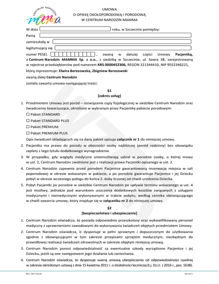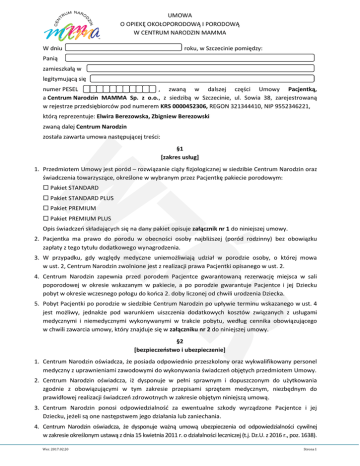 UMOWA O OPIEKĘ OKOŁOPORODOWĄ I PORODOWĄ W CENTRUM NARODZIN MAMMA W dniu roku, w Szczecinie pomiędzy: Panią zamieszkałą w legitymującą się numer PESEL , zwaną w dalszej części Umowy Pacjentką, a Centrum Narodzin MAMMA Sp. z o.o., z siedzibą w Szczecinie, ul. Sowia 38, zarejestrowaną w rejestrze przedsiębiorców pod numerem KRS 0000452306, REGON 321344410, NIP 9552346221, którą reprezentuje: Elwira Berezowska, Zbigniew Berezowski zwaną dalej Centrum Narodzin została zawarta umowa następującej treści: §1 [zakres usług] 1. Przedmiotem Umowy jest poród – rozwiązanie ciąży fizjologicznej w siedzibie Centrum Narodzin oraz świadczenia towarzyszące, określone w wybranym przez Pacjentkę pakiecie porodowym: Pakiet STANDARD Pakiet STANDARD PLUS Pakiet PREMIUM Pakiet PREMIUM PLUS Opis świadczeń składających się na dany pakiet opisuje załącznik nr 1 do niniejszej umowy. 2. Pacjentka ma prawo do porodu w obecności osoby najbliższej (poród rodzinny) bez obowiązku zapłaty z tego tytułu dodatkowego wynagrodzenia. 3. W przypadku, gdy względy medyczne uniemożliwiają udział w porodzie osoby, o której mowa w ust. 2, Centrum Narodzin zwolnione jest z realizacji prawa Pacjentki opisanego w ust. 2. 4. Centrum Narodzin zapewnia przed porodem Pacjentce gwarantowaną rezerwację miejsca w sali poporodowej w okresie wskazanym w pakiecie, a po porodzie gwarantuje Pacjentce i jej Dziecku pobyt w okresie wczesnego połogu do końca 2. doby liczonej od chwili urodzenia Dziecka. 5. Pobyt Pacjentki po porodzie w siedzibie Centrum Narodzin po upływie terminu wskazanego w ust. 4 jest możliwy, jednakże pod warunkiem uiszczenia dodatkowych kosztów związanych z usługami medycznymi i niemedycznymi wykonywanymi w trakcie pobytu, według cennika obowiązującego w chwili zawarcia umowy, który znajduje się w załączniku nr 2 do niniejszej umowy. §2 [bezpieczeństwo i ubezpieczenie] 1. Centrum Narodzin oświadcza, że posiada odpowiednio przeszkolony oraz wykwalifikowany personel medyczny z uprawnieniami zawodowymi do wykonywania świadczeń objętych przedmiotem Umowy. 2. Centrum Narodzin oświadcza, iż dysponuje w pełni sprawnym i dopuszczonym do użytkowania zgodnie z obowiązującymi w tym zakresie przepisami sprzętem medycznym, niezbędnym do prawidłowej realizacji świadczeń zdrowotnych w zakresie objętym niniejszą umową. 3. Centrum Narodzin ponosi odpowiedzialność za ewentualne szkody wyrządzone Pacjentce i jej Dziecku, jeżeli są one następstwem jego działania lub zaniechania. 4. Centrum Narodzin oświadcza, że dysponuje ważną umową ubezpieczenia od odpowiedzialności cywilnej w zakresie określonym ustawą z dnia 15 kwietnia 2011 r. o działalności leczniczej (t.j. Dz.U. z 2016 r., poz. 1638). Wer. 2017.02.20 Strona 1 UMOWA O OPIEKĘ OKOŁOPORODOWĄ I PORODOWĄ W CENTRUM NARODZIN MAMMA §3 [najwyższa staranność; obowiązki Centrum Narodzin] 1. Centrum Narodzin zobowiązuje się do świadczenia objętych niniejszą Umową usług zgodnie z zasadami wiedzy medycznej, z najwyższą starannością, a także zobowiązuje się do przestrzegania praw pacjenta. 2. Centrum Narodzin jest zobowiązane do udzielania Pacjentce lub wskazanej przez nią osobie pełnej informacji o stanie zdrowia Pacjentki i Dziecka oraz podejmowanych działaniach medycznych. 3. Centrum Narodzin zobowiązane jest ponadto do: a. prowadzenia dokumentacji medycznej zgodnie z obowiązującymi przepisami, b. zachowania w tajemnicy wszystkich okoliczności i danych, pozyskanych w związku lub podczas wykonywania umowy, c. dbania o poszanowanie godności i dobrego imienia Pacjentki. §4 [data porodu] Planowana data porodu przypada na dzień §5 [zobowiązania Pacjentki] 1. Pacjentka zobowiązuje się do przybycia do siedziby Centrum Narodzin celem porodu w wyznaczonym przez lekarza Centrum Narodzin terminie. 2. Pacjentka zobowiązana jest do utrzymywania stałego kontaktu z Centrum Narodzin wynikającego z zaleceń lekarskich (plan wizyt), a nadto do telefonicznego uprzedzenia o przyjeździe do porodu lub na konsultacje. 3. Pacjentka zobowiązana jest do ścisłego współdziałania z personelem medycznym Centrum Narodzin, w tym w szczególności do poinformowania Centrum Narodzin o stanie swojego zdrowia, wszelkich dolegliwościach, przebytych lub posiadanych chorobach, przebiegu poprzednich ciąż i porodów, a także przebiegu obecnej ciąży, a na żądanie personelu Centrum Narodzin do przedstawienia w terminie przez niego wskazanym wszelkiej posiadanej w tym zakresie dokumentacji medycznej. 4. Brak współdziałania, o którym mowa w ust. 3 przede wszystkim może w znaczący sposób wpłynąć na jakość i efektywność realizowanej opieki udzielanej przez Centrum Narodzin, oraz umożliwia wypowiedzenie przez Centrum narodzin niniejszej umowy z przyczyn leżących po stronie Pacjentki. W takim przypadku zastosowanie mają postanowienia zawarte w § 7 ust. 2 niniejszej umowy. 5. W przypadku, gdy akcja porodowa nie rozpocznie się samoistnie do końca 41. tygodnia ciąży, Pacjentka zobowiązana jest do stawienia się Centrum Narodzin w ostatnim dniu tego terminu - do godziny 15:00, po uprzednim kontakcie telefonicznym. 6. Pacjentka oświadcza, iż została poinformowana o tym, że w przypadku porodu fizjologicznego (siłami natury) metoda rozwiązania ciąży może zmienić się w trakcie porodu, jeżeli przemawiają za tym względy medyczne. Przykładem okoliczności opisanych powyżej, uzasadniających zastosowanie zabiegu cesarskiego cięcia, próżnociągu położniczego lub kleszczy są w szczególności: a. objawy zagrożenia życia matki (np. krwotok śródporodowy, skok ciśnienia, utrata przytomności, ewakuacja krwiaka kanału rodnego), b. objawy zagrożenia życia Dziecka (np. zaburzenia tętna płodu, przedwczesne odklejenie łożyska, wypadnięcie pępowiny), Wer. 2017.02.20 Strona 2 UMOWA O OPIEKĘ OKOŁOPORODOWĄ I PORODOWĄ W CENTRUM NARODZIN MAMMA c. inne