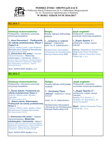 PODRĘCZNIKI OBOWIĄZUJACE R w Publicznej Szkoły Podstawowej Nr 4 z Oddziałami Integracyjnymi im. św. Kazimierza Jagiellończyka w Radomiu ADOM W ROKU SZKOLNYM 2016/2017 KLASA 1 Język angielski: Podręczniki i ćwiczenia uczniowie otrzymują bezpłatnie. Religia; Koszty zakupu pokrywają rodzice 1.„Nasz Elementarz” . Podręcznik 1. „Jesteśmy w rodzinie 1.„Super Sparks 1”- Edukacja wczesnoszkolna: do szkoły podstawowej. Klasa 1. Jezusa” - Katechizm Częsć1-4 autor: ks. S. Łabendowicz, autorzy: Maria Lorek, Lidia Wollman Ministerstwo Edukacji Narodowej Rok dopuszczenia 2014 2.„Elementarz XXI wieku”. Zestaw rekomendowany . Materiały edukacyjne i ćwiczenia -klasa 1 Podręczniki i ćwiczenia uczniowie otrzymują bezpłatnie. podręcznik z płytą i zeszyt ćwiczeń, Autorzy: Magdalena Szpotowicz, Wydawnictwo Diecezjalne i Drukarnia lub Wydawnictwo Małgorzata Szulc-Kurpaska Wyd.: Oxford University Press Diecezji Radomskiej AVE Polska Sp. z o.o. Autorzy: Ewa Hryszkiewicz, Barbara Stępień, Krystyna Bielenica, Maria Bura, Małgorzata Kwil, Bogusława Lankiewicz, Joanna Winiecka-Nowak Wyd. NOWA ERA Spółka z o.o. KLASA 2 Religia; Koszty zakupu pokrywają rodzice Język angielski: 1.„Nasza Szkoła. Podręcznik do szkoły podstawowej. Klasa 2.” Autorzy: Maria Lorek, Monika Zatorska 1. „Kochamy Pana Jezusa” -Katechizm i zeszyt 1.„Super Sparks 2”- Rok dopuszczenia 2015 Autor: ks. S. Łabendowicz, Edukacja wczesnoszkolna: Podręczniki i ćwiczenia uczniowie otrzymują bezpłatnie. 2. „Nasza szkoła. Matematyka. ćwiczeń Podręczniki i ćwiczenia uczniowie otrzymują bezpłatnie. podręcznik z płytą i zeszyt ćwiczeń, Autorzy: P.A. Davies, C. Graham, M. Szpotowicz, M. Szulc-Kurpaska Podręcznik do szkoły podstawowej. Wydawnictwo Diecezjalne Klasa 2. ” i Drukarnia lub Wydawnictwo Wyd.: Oxford University Press Autorzy: Maria Lorek, Agata Ludwa Polska Sp. z o.o. Diecezji Radomskiej AVE Ministerstwo Edukacji Narodowej Rok dopuszczenia 2015 3. Elementarz XXI wieku” .Zestaw rekomendowany. Materiały edukacyjne i ćwiczenia - klasa 2 Autorzy: Ewa Hryszkiewicz, Barbara Stępień, Małgorzata Ogrodowczyk, Krystyna Bielenica, Maria Bura, Małgorzata Kwil, Bogusława Lankiewicz, Joanna Winiecka-Nowak Wyd. NOWA ERA Spółka z o.o. PODRĘCZNIKI OBOWIĄZUJACE R w Publicznej Szkoły Podstawowej Nr 4 z Oddziałami Integracyjnymi im. św. Kazimierza Jagiellończyka w Radomiu ADOM W ROKU SZKOLNYM 2016/2017 KLASA 3 Edukacja wczesnoszkolna: Religia: Język angielski: Podręczniki i ćwiczenia uczniowie otrzymują bezpłatnie. Koszty zakupu pokrywają rodzice Podręczniki i ćwiczenia uczniowie otrzymują bezpłatnie. 1. „Przyjmujemy Pana Jezusa”- Katechizm i zeszyt 1. „Super Sparks 3”- 1. „Elementarz XXI wieku – kl.3, pakiet podręczników” ćwiczeń Autorzy: E. Hryszkiewicz, B. Stępień, J. Winiecka-Nowak Autor: ks. S. Łabendowicz, Skład pakietu: Podręcznik cz.1 i 2. Ćwiczenia zintegrowane cz.1- 4 Matematyka cz. 1- 4. Zeszyt ćwiczeń do muzyki z płytą CD Zeszyt ćwiczeń Teczka artysty. Wyprawka dla ucznia Zeszyt ortograficzny Zajęcia komputerowe z płytą CD Wyd. NOWA ERA Spółka z o.o. podręcznik z płytą i zeszyt ćwiczeń, Autorzy: M. Szpotowicz, M.SzulcKurpaska, Carolyn Graham i P.A. Davies Wydawnictwo Diecezjalne i Drukarnia lub Wydawnictwo Wyd.: Oxford University Press Diecezji Radomskiej AVE Polska Sp. z o.o.
