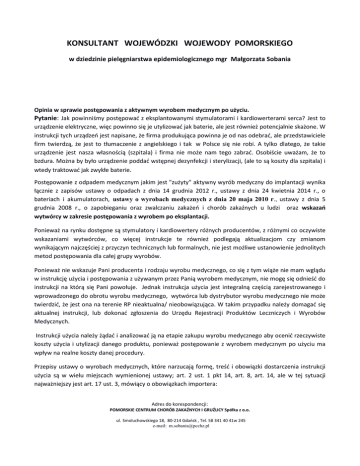 KONSULTANT WOJEWÓDZKI WOJEWODY POMORSKIEGO w dziedzinie pielęgniarstwa epidemiologicznego mgr Małgorzata Sobania Opinia w sprawie postępowania z aktywnym wyrobem medycznym po użyciu. Pytanie: Jak powinniśmy postępować z eksplantowanymi stymulatorami i kardiowerterami serca? Jest to urządzenie elektryczne, więc powinno się je utylizować jak baterie, ale jest również potencjalnie skażone. W instrukcji tych urządzeń jest napisane, że firma produkująca powinna je od nas odebrać, ale przedstawiciele firm twierdzą, że jest to tłumaczenie z angielskiego i tak w Polsce się nie robi. A tylko dlatego, że takie urządzenie jest nasza własnością (szpitala) i firma nie może nam tego zabrać. Osobiście uważam, że to bzdura. Można by było urządzenie poddać wstępnej dezynfekcji i sterylizacji, (ale to są koszty dla szpitala) i wtedy traktować jak zwykłe baterie. Postępowanie z odpadem medycznym jakim jest "zużyty" aktywny wyrób medyczny do implantacji wynika łącznie z zapisów ustawy o odpadach z dnia 14 grudnia 2012 r., ustawy z dnia 24 kwietnia 2014 r., o bateriach i akumulatorach, ustawy o wyrobach medycznych z dnia 20 maja 2010 r., ustawy z dnia 5 grudnia 2008 r., o zapobieganiu oraz zwalczaniu zakażeń i chorób zakaźnych u ludzi oraz wskazań wytwórcy w zakresie postępowania z wyrobem po eksplantacji. Ponieważ na rynku dostępne są stymulatory i kardiowertery różnych producentów, z różnymi co oczywiste wskazaniami wytwórców, co więcej instrukcje te również podlegają aktualizacjom czy zmianom wynikającym najczęściej z przyczyn technicznych lub formalnych, nie jest możliwe ustanowienie jednolitych metod postępowania dla całej grupy wyrobów. Ponieważ nie wskazuje Pani producenta i rodzaju wyrobu medycznego, co się z tym wiąże nie mam wglądu w instrukcję użycia i postępowania z używanym przez Panią wyrobem medycznym, nie mogę się odnieść do instrukcji na którą się Pani powołuje. Jednak instrukcja użycia jest integralną częścią zarejestrowanego i wprowadzonego do obrotu wyrobu medycznego, wytwórca lub dystrybutor wyrobu medycznego nie może twierdzić, że jest ona na terenie RP nieaktualna/ nieobowiązująca. W takim przypadku należy domagać się aktualnej instrukcji, lub dokonać zgłoszenia do Urzędu Rejestracji Produktów Leczniczych i Wyrobów Medycznych. Instrukcji użycia należy żądać i analizować ją na etapie zakupu wyrobu medycznego aby ocenić rzeczywiste koszty użycia i utylizacji danego produktu, ponieważ postępowanie z wyrobem medycznym po użyciu ma wpływ na realne koszty danej procedury. Przepisy ustawy o wyrobach medycznych, które narzucają formę, treść i obowiązki dostarczenia instrukcji użycia są w wielu miejscach wymienionej ustawy; art. 2 ust. 1 pkt 14, art. 8, art. 14, ale w tej sytuacji najważniejszy jest art. 17 ust. 3, mówiący o obowiązkach importera: Adres do korespondencji: POMORSKIE CENTRUM CHORÓB ZAKAŹNYCH I GRUŹLICY Spółka z o.o. ul. Smoluchowskiego 18, 80-214 Gdańsk , Tel. 58 341 40 41w 245 e-mail: [email protected] KONSULTANT WOJEWÓDZKI WOJEWODY POMORSKIEGO w dziedzinie pielęgniarstwa epidemiologicznego mgr Małgorzata Sobania Art. 17 [Obowiązki importera i dystrybutora]1. Importer i dystrybutor są obowiązani działać z należytą starannością w celu zapewnienia bezpieczeństwa wyrobów, w szczególności nie dostarczając i nie udostępniając wyrobów, o których wiedzą lub o których, zgodnie z posiadanymi informacjami i doświadczeniem zawodowym, powinni wiedzieć, że nie spełniają one wymagań określonych w ustawie. 2. Przed wprowadzeniem wyrobu do obrotu importer jest obowiązany sprawdzić, czy: 1) wytwórca lub autoryzowany przedstawiciel przeprowadzili właściwą procedurę oceny zgodności wyrobu; 2) wytwórca wyznaczył autoryzowanego przedstawiciela dla wyrobu; 3) wyrób jest oznakowany znakiem CE, a także numerem identyfikacyjnym jednostki notyfikowanej, która brała udział w ocenie zgodności, jeżeli jest wyrobem, o którym mowa w art. 29 ust. 5; 4) informacje dostarczane przez wytwórcę spełniają wymagania zasadnicze. 3. Importer i dystrybutor są obowiązani sprawdzić, czy wyroby, które wprowadzają do obrotu, wprowadzają do używania, dostarczają lub udostępniają, są właściwie oznakowane i mają odpowiednie instrukcje używania. Z obowiązku tego wynika, że dystrybutor w żaden sposób nie może się uchylić od dostarczenia właściwej instrukcji używania. Zgodnie z Ustawą o wyrobach medycznych z dnia 20 maja 2010 r., będącej przeniesieniem wymagań Dyrektywy93/42/EEC na grunt prawa polskiego wszelkie czynności prowadzone wobec wyrobów medycznych, w tym postępowania z wyrobem medycznym czy też jego dekontaminacji, utylizacji powinny odbywać się w oparciu o instrukcje wytwórcy. Określają one precyzyjnie warunki, techniki i metody postępowania, należy pamiętać, że tego typu urządzenie może eksplodować na skutek narażenia na temperatury panujące podczas kremacji zwłok lub spalania odpadów szpitalnych. Tak więc obowiązkiem wytwórcy jest określenie warunków prawidłowego postępowania z wyrobem medycznym w trakcie używania i po użyciu. Małgorzata Sobania Konsultant ds.pielęgniarstwa epidemiologicznego Adres do korespondencji: POMORSKIE CENTRUM CHORÓB ZAKAŹNYCH I GRUŹLICY Spółka z o.o. ul. Smoluchowskiego 18, 80-214 Gdańsk , Tel. 58 341 40 41w 245 e-mail: [email protected] KONSULTANT WOJEWÓDZKI WOJEWODY POMORSKIEGO w dziedzinie pielęgniarstwa epidemiologicznego mgr Małgorzata Sobania Adres do korespondencji: POMORSKIE CENTRUM CHORÓB ZAKAŹNYCH I GRUŹLICY Spółka z o.o. ul. Smoluchowskiego 18, 80-214 Gdańsk , Tel. 58 341 40 41w 245 e-mail: [email protected]