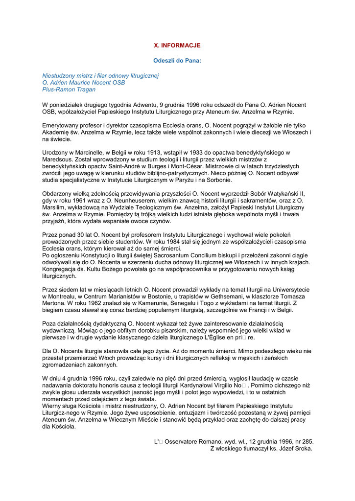 X. INFORMACJE Odeszli do Pana: Niestudzony mistrz i filar odnowy litrugicznej O. Adrien Maurice Nocent OSB Pius-Ramon Tragan W poniedziałek drugiego tygodnia Adwentu, 9 grudnia 1996 roku odszedł do Pana O. Adrien Nocent OSB, wpółzałożyciel Papieskiego Instytutu Liturgicznego przy Ateneum św. Anzelma w Rzymie. Emerytowany profesor i dyrektor czasopisma Ecclesia orans, O. Nocent pogrążył w żałobie nie tylko Akademię św. Anzelma w Rzymie, lecz także wiele wspólnot zakonnych i wiele diecezji we Włoszech i na świecie. Urodzony w Marcinelle, w Belgii w roku 1913, wstąpił w 1933 do opactwa benedyktyńskiego w Maredsous. Został wprowadzony w studium teologii i liturgii przez wielkich mistrzów z benedyktyńskich opactw Saint-André w Burges i Mont-César. Mistrzowie ci w latach trzydziestych zwrócili jego uwagę w kierunku studiów biblijno-patrystycznych. Nieco później O. Nocent odbywał studia specjalistyczne w Instytucie Liturgicznym w Paryżu i na Sorbonie. Obdarzony wielką zdolnością przewidywania przyszłości O. Nocent wyprzedził Sobór Watykański II, gdy w roku 1961 wraz z O. Neunheuserem, wielkim znawcą historii liturgii i sakramentów, oraz z O. Marsilim, wykładowcą na Wydziale Teologicznym św. Anzelma, założył Papieski Instytut Liturgiczny św. Anzelma w Rzymie. Pomiędzy tą trójką wielkich ludzi istniała głęboka wspólnota myśli i trwała przyjaźń, która wydała wspaniałe owoce czynów. Przez ponad 30 lat O. Nocent był profesorem Instytutu Liturgicznego i wychował wiele pokoleń prowadzonych przez siebie studentów. W roku 1984 stał się jednym ze współzałożycieli czasopisma Ecclesia orans, którym kierował aż do samej śmierci. Po ogłoszeniu Konstytucji o liturgii świętej Sacrosantum Concilium biskupi i przełożeni zakonni ciągle odwoływali się do O. Nocenta w szerzeniu ducha odnowy liturgicznej we Włoszech i w innych krajach. Kongregacja ds. Kultu Bożego powołała go na współpracownika w przygotowaniu nowych ksiąg liturgicznych. Przez siedem lat w miesiącach letnich O. Nocent prowadził wykłady na temat liturgii na Uniwersytecie w Montrealu, w Centrum Marianistów w Bostonie, u trapistów w Gethsemani, w klasztorze Tomasza Mertona. W roku 1962 znalazł się w Kamerunie, Senegalu i Togo z wykładami na temat liturgii. Z biegiem czasu stawał się coraz bardziej popularnym liturgistą, szczególnie we Francji i w Belgii. Poza działalnością dydaktyczną O. Nocent wykazał też żywe zainteresowanie działalnością wydawniczą. Mówiąc o jego obfitym dorobku pisarskim, należy wspomnieć jego wielki wkład w pierwsze i w drugie wydanie klasycznego dzieła liturgicznego L'Église en prire. Dla O. Nocenta liturgia stanowiła całe jego życie. Aż do momentu śmierci. Mimo podeszłego wieku nie przestał przemierzać Włoch prowadząc kursy i dni liturgicznych refleksji w męskich i żeńskich zgromadzeniach zakonnych. W dniu 4 grudnia 1996 roku, czyli zaledwie na pięć dni przed śmiercią, wygłosił laudację w czasie nadawania doktoratu honoris causa z teologii liturgii Kardynałowi Virgilio No. Pomimo cichszego niż zwykle głosu uderzała wszystkich jasność jego myśli i polot jego wypowiedzi, i to w ostatnich momentach przed odejściem z tego świata. Wierny sługa Kościoła i mistrz niestrudzony, O. Adrien Nocent był filarem Papieskiego Instytutu Liturgicz-nego w Rzymie. Jego żywe usposobienie, entuzjazm i twórczość pozostaną w żywej pamięci Ateneum św. Anzelma w Wiecznym Mieście i stanowić będą przykład oraz zachętę do dalszej pracy dla Kościoła. L'Osservatore Romano, wyd. wł., 12 grudnia 1996, nr 285. Z włoskiego tłumaczył ks. Józef Sroka. O. Max Thurian Urodził się w rodzinie kalwińskiej w Genewie. Wstąpił do wspólnoty w Taizé w 1942. Współuczestniczył w przygotowaniu dokumentu Światowej Rady Kościołów na temat sakramentu chrztu, kapłaństwa i Eucharystii. Jeszcze jako brat, Thurian był obserwatorem na Soborze Watykańskim II, posługiwał też w Radzie ds. wprowadzenia w życie Konstytucji o świętej liturgii. W roku 1987 został przyjęty do Kościoła katolickiego i wyświęcony na kapłana. Był członkiem Międzynarodowej Komisji Teologicznej i ekumenicznej wspólnoty w Taizé oraz konsultorem Kongregacji Nauki Wiary i Kongregacji ds. Duchowieństwa. Zmarł w Genewie 15 sierpnia 1996. Newsletter, XXXII, 7-8(1996) Czystość wiary i nieskazitelność moralności powinny stanowić właściwą normę liturgii, którą należy całkowicie uzgodnić z mądrymi naukami Kościoła. Jest więc Naszym obowiązkiem pochwalać i potwierdzać to, co słuszne, a zarazem hamować lub odrzucać to, co z prawdziwej drogi zboczyło. Niechaj jednak opieszali i gnuśni nie sądzą, że chwalimy ich, gdy ganimy błądzących lub hamujemy zbyt śmiałych; podobnie i nieroztropni niechaj nie myślą, że cieszą się naszym uznaniem wtedy, gdy karcimy niedbałych i leniwych. Papież Pius XII, }Mediator Dei et hominum}, Wstęp