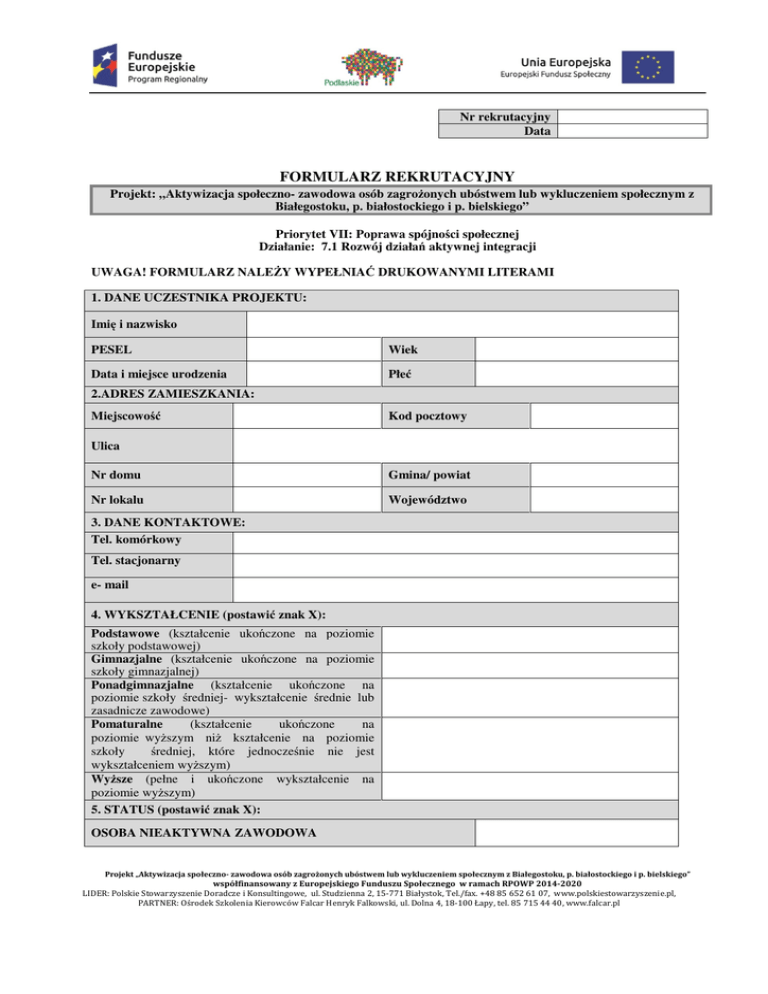 Nr rekrutacyjny Data FORMULARZ REKRUTACYJNY Projekt: „Aktywizacja społeczno- zawodowa osób zagrożonych ubóstwem lub wykluczeniem społecznym z Białegostoku, p. białostockiego i p. bielskiego” Priorytet VII: Poprawa spójności społecznej Działanie: 7.1 Rozwój działań aktywnej integracji UWAGA! FORMULARZ NALEŻY WYPEŁNIAĆ DRUKOWANYMI LITERAMI 1. DANE UCZESTNIKA PROJEKTU: Imię i nazwisko PESEL Wiek Data i miejsce urodzenia Płeć 2.ADRES ZAMIESZKANIA: Miejscowość Kod pocztowy Ulica Nr domu Gmina/ powiat Nr lokalu Województwo 3. DANE KONTAKTOWE: Tel. komórkowy Tel. stacjonarny e- mail 4. WYKSZTAŁCENIE (postawić znak X): Podstawowe (kształcenie ukończone na poziomie szkoły podstawowej) Gimnazjalne (kształcenie ukończone na poziomie szkoły gimnazjalnej) Ponadgimnazjalne (kształcenie ukończone na poziomie szkoły średniej- wykształcenie średnie lub zasadnicze zawodowe) Pomaturalne (kształcenie ukończone na poziomie wyższym niż kształcenie na poziomie szkoły średniej, które jednocześnie nie jest wykształceniem wyższym) Wyższe (pełne i ukończone wykształcenie na poziomie wyższym) 5. STATUS (postawić znak X): OSOBA NIEAKTYWNA ZAWODOWA Projekt „Aktywizacja społeczno- zawodowa osób zagrożonych ubóstwem lub wykluczeniem społecznym z Białegostoku, p. białostockiego i p. bielskiego” współfinansowany z Europejskiego Funduszu Społecznego w ramach RPOWP 2014-2020 LIDER: Polskie Stowarzyszenie Doradcze i Konsultingowe, ul. Studzienna 2, 15-771 Białystok, Tel./fax. +48 85 652 61 07, www.polskiestowarzyszenie.pl, PARTNER: Ośrodek Szkolenia Kierowców Falcar Henryk Falkowski, ul. Dolna 4, 18-100 Łapy, tel. 85 715 44 40, www.falcar.pl OSOBA BEZROBOTNA w tym osoba zakwalifikowana do III profilu pomocy przez Powiatowy Urząd Pracy OSOBA KORZYSTAJĄCA ZE ŚWIADCZEŃ POMOCY SPOŁECZNEJ OSOBA Z NIEPEŁNOSPRAWNOŚCIAMI OSOBA NALEŻĄCA DO MNIEJSZOŚCI NARODOWEJ LUB ETNICZNEJ, MIGRANT, OSOBA OBCEGO POCHODZENIA OSOBA PRZEBYWAJĄCA W GOSPODARSTWIE DOMOWYM BEZ OSÓB PRACUJĄCYCH w tym: w gospodarstwie domowym z dziećmi pozostającymi na utrzymaniu OSOBA ŻYJĄCA W GOSPODARSTWIE SKŁADAJĄCYM SIĘ Z JEDNEJ OSOBY DOROSŁEJ I DZIECI POZOSTAJĄCYCH NA UTRZYMANIU 7. WYBÓR SZKOLENIA ( we właściwym okienku zaznacz X) Operator koparkoładowarki Stolarz Operator obrabiarek CNC Spawacz Glazurnik Kucharz Kurs prawa jazdy kat. C + kurs kwalifikacji wstępnej przyspieszonej kat. C Przedstawiciel handlowy + kurs prawa jazdy kat. B Pracownik biurowy + kurs prawa jazdy kat. B Staż zawodowy a) Oświadczam, pod groźbą odpowiedzialności, że wszystkie podane przeze mnie dane są aktualne i zgodne z prawdą. Mam świadomość konieczności informowania o zmianach statusu, o ile zmiany takie zajdą w trakcie realizacji projektu. b) Oświadczam, iż zostałem/łam poinformowany/a o współfinansowaniu projektu „Aktywizacja społeczno- zawodowa osób zagrożonych ubóstwem lub wykluczeniem społecznym z Białegostoku, p. białostockiego i p. bielskiego przez Unię Europejską w ramach Europejskiego Funduszu Społecznego. c) Oświadczam, iż zapoznałem/am z Regulaminem Rekrutacji i Uczestnictwa w Projekcie i akceptuję jego treść. ……………………………. Miejscowość, data ..……………......……….. Czytelny podpis Projekt „Aktywizacja społeczno- zawodowa osób zagrożonych ubóstwem lub wykluczeniem społecznym z Białegostoku, p. białostockiego i p. bielskiego” współfinansowany z Europejskiego Funduszu Społecznego w ramach RPOWP 2014-2020 LIDER: Polskie Stowarzyszenie Doradcze i Konsultingowe, ul. Studzienna 2, 15-771 Białystok, Tel./fax. +48 85 652 61 07, www.polskiestowarzyszenie.pl, PARTNER: Ośrodek Szkolenia Kierowców Falcar Henryk Falkowski, ul. Dolna 4, 18-100 Łapy, tel. 85 715 44 40, www.falcar.pl