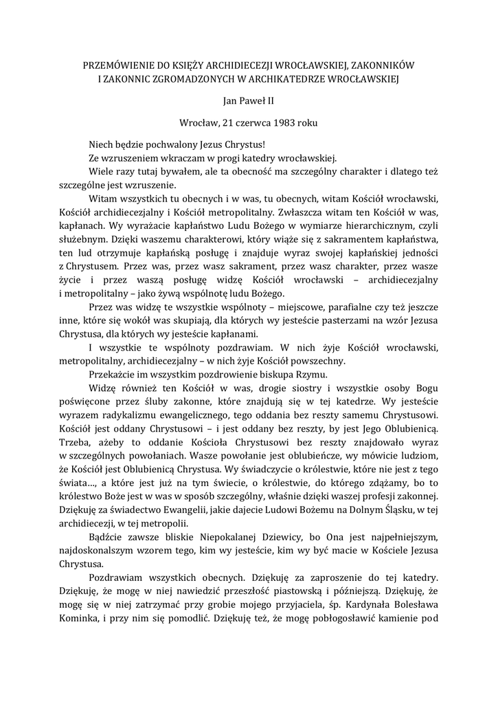 PRZEMÓWIENIE DO KSIĘŻY ARCHIDIECEZJI WROCŁAWSKIEJ, ZAKONNIKÓW I ZAKONNIC ZGROMADZONYCH W ARCHIKATEDRZE WROCŁAWSKIEJ Jan Paweł II Wrocław, 21 czerwca 1983 roku Niech będzie pochwalony Jezus Chrystus! Ze wzruszeniem wkraczam w progi katedry wrocławskiej. Wiele razy tutaj bywałem, ale ta obecność ma szczególny charakter i dlatego też szczególne jest wzruszenie. Witam wszystkich tu obecnych i w was, tu obecnych, witam Kościół wrocławski, Kościół archidiecezjalny i Kościół metropolitalny. Zwłaszcza witam ten Kościół w was, kapłanach. Wy wyrażacie kapłaństwo Ludu Bożego w wymiarze hierarchicznym, czyli służebnym. Dzięki waszemu charakterowi, który wiąże się z sakramentem kapłaństwa, ten lud otrzymuje kapłańską posługę i znajduje wyraz swojej kapłańskiej jedności z Chrystusem. Przez was, przez wasz sakrament, przez wasz charakter, przez wasze życie i przez waszą posługę widzę Kościół wrocławski – archidiecezjalny i metropolitalny – jako żywą wspólnotę ludu Bożego. Przez was widzę te wszystkie wspólnoty – miejscowe, parafialne czy też jeszcze inne, które się wokół was skupiają, dla których wy jesteście pasterzami na wzór Jezusa Chrystusa, dla których wy jesteście kapłanami. I wszystkie te wspólnoty pozdrawiam. W nich żyje Kościół wrocławski, metropolitalny, archidiecezjalny – w nich żyje Kościół powszechny. Przekażcie im wszystkim pozdrowienie biskupa Rzymu. Widzę również ten Kościół w was, drogie siostry i wszystkie osoby Bogu poświęcone przez śluby zakonne, które znajdują się w tej katedrze. Wy jesteście wyrazem radykalizmu ewangelicznego, tego oddania bez reszty samemu Chrystusowi. Kościół jest oddany Chrystusowi – i jest oddany bez reszty, by jest Jego Oblubienicą. Trzeba, ażeby to oddanie Kościoła Chrystusowi bez reszty znajdowało wyraz w szczególnych powołaniach. Wasze powołanie jest oblubieńcze, wy mówicie ludziom, że Kościół jest Oblubienicą Chrystusa. Wy świadczycie o królestwie, które nie jest z tego świata…, a które jest już na tym świecie, o królestwie, do którego zdążamy, bo to królestwo Boże jest w was w sposób szczególny, właśnie dzięki waszej profesji zakonnej. Dziękuję za świadectwo Ewangelii, jakie dajecie Ludowi Bożemu na Dolnym Śląsku, w tej archidiecezji, w tej metropolii. Bądźcie zawsze bliskie Niepokalanej Dziewicy, bo Ona jest najpełniejszym, najdoskonalszym wzorem tego, kim wy jesteście, kim wy być macie w Kościele Jezusa Chrystusa. Pozdrawiam wszystkich obecnych. Dziękuję za zaproszenie do tej katedry. Dziękuję, że mogę w niej nawiedzić przeszłość piastowską i późniejszą. Dziękuję, że mogę się w niej zatrzymać przy grobie mojego przyjaciela, śp. Kardynała Bolesława Kominka, i przy nim się pomodlić. Dziękuję też, że mogę pobłogosławić kamienie pod budowę nowych kościołów na znak posługi, jaką w dniu 21 czerwca 1983 roku dane mi było spełnić we Wrocławiu. Drodzy bracia i siostry, polecam się waszym modłom. Polecam waszym modłom, waszej braterskiej i siostrzanej wspólnocie, biskupów – waszych, wrocławskich, dolnośląskich, biskupów polskich, wszystkich biskupów na świecie. Ażebyśmy stanowili jedno w Jezusie Chrystusie i żebyśmy, stanowiąc jedno w Nim, mogli zbawiać świat w Jezusie Chrystusie – bo tylko w Nim jest zbawienie świata wczoraj, dzisiaj i na wieki. Przyjmijcie błogosławieństwo. Proszę księży kardynałów i biskupów, ażeby się do tego błogosławieństwa mojego dołączyli.