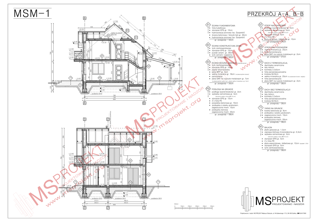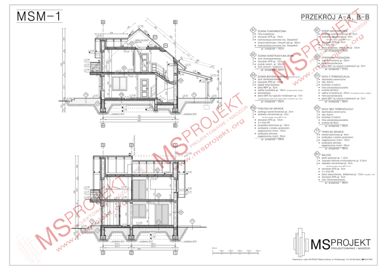 A B + 7.65 66 26 1 6 S1 ST 1 358 + 6.59 236 ST + 5.61 hydroizolacja pionowa (np. Dysperbit) gr. przegrody - 42cm 20 + 2.84 x1 7. 8 + 2.82 x2 + 2.25 7. 0 - 0.34 T1 - 0.02 40 folia paroizolacyjna gr. przegrody - 35cm 40 - 1.39 PG podbeton B10 podbeton B10 ( 6/10 cm) styropian EPS gr. 12cm 2 x folia PE posadzka betonowa gr. 10cm podsypka z piasku gruboziarn. zageszczona mech. 10cm zageszczona mech. 20cm gr. przegrody - 59cm 2 DACH (BEZ TERMOIZOLACJI) wylewka cementowa gr. 5cm 60 B 3 gr. przegrody - 36cm D2 1 A folia paroprzepuszczalna krokiew 8x16cm (w (w - 0.51 796 736 856 D1 paroizolacja - 1.14 60 gr. przegrody - 27cm - 0.03 S1 - 1.54 folia paroizolacyjna (nieprzekrojona) 203 3 x x 2 17 5. .0 0 - 0.19 80 1 STROP NAD PODDASZEM tynk cienkowarstwowy styropian EPS gr. 10cm papier bitumizowany 326 27 + 1.99 210 PG 202 - 0.02 120 80 1 folia paroprzepuszczalna krokiew 8x16cm gr. przegrody - 26cm T1 TARAS NA GRUNCIE kostka betonowa gr. 6cm podsypka z piasku gruboziarn. zageszczona mech. 10cm zageszczona mech. 20cm gr. przegrody - 36cm + 7.65 B1 BALKON 236 zaprawa klefowa mrozoodporna gr. 0,5cm wylewka cementowa gr. 5cm ( ST 2 + 5.61 6/10 cm) styropian EPS gr. 5cm 2 x folia PE + 5.60 30 140 25 25 + 2.60 150 50 24 80 112 + 2.84 - 0.02 T1 PG 1 - 0.19 - 0.34 S2 237 85 210 24 210 260 50 62 210 + 2.72 S1 - 1.14 - 1.54 40 120 80 322 T1 + 3.80 + 3.41 ST 1 18 B1 + 2.82 styropian EPS gr. 5cm tynk cienkowarstwowy gr. przegrody - 36cm 220 + 3.41 + 5.34 + 3.96 220 250 799 232 + 3.92 30 25 30 (spadek 1,5%) 242 322 T1 85 235 150 260 S2 2 S3 120 + 2.60 16 39 220 1 25 37 24 ST + 2.72 50 B1 + 2.82 + 3.41 + 3.80 112 + 3.41 6/10 cm) gr. przegrody - 24cm ST tynk cienkowarstwowy styropian EPS gr. 12cm pustak ceram. gr. 30cm tynk cement.-wapienny gr. przegrody - 42cm 380 321 210 220 250 799 232 S2 2 15 67 16 + 5.34 11 + 3.92 ( styropian EPS gr. 5cm 2 x folia PE 40 30 + 4.92 28 3 D1 wylewka cementowa gr. 5cm styropian EPS gr. 12cm hydroizolacja pionowa (np. Dysperbit) 0 60x120 2 25 66 D2 STROP NAD PARTEREM podbeton B10 60 312,5 252,5 podbeton B10 483,5 423,5 60 podbeton B10 60 856 3 2 1 SKALA 0 100cm 200cm 300cm 400cm 500cm