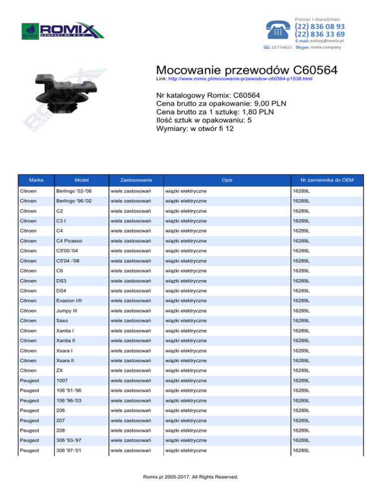 Mocowanie przewodów C60564 Link: http://www.romix.pl/mocowanie-przewodow-c60564-p1538.html Nr katalogowy Romix: C60564 Cena brutto za opakowanie: 9,00 PLN Cena brutto za 1 sztukę: 1,80 PLN Ilość sztuk w opakowaniu: 5 Wymiary: w otwór fi 12 Marka Model Zastosowanie Opis Nr zamiennika do OEM Citroen Berlingo '02-'08 wiele zastosowań wiązki elektryczne 16289L Citroen Berlingo '96-'02 wiele zastosowań wiązki elektryczne 16289L Citroen C2 wiele zastosowań wiązki elektryczne 16289L Citroen C3 I wiele zastosowań wiązki elektryczne 16289L Citroen C4 wiele zastosowań wiązki elektryczne 16289L Citroen C4 Picasso wiele zastosowań wiązki elektryczne 16289L Citroen C5'00-'04 wiele zastosowań wiązki elektryczne 16289L Citroen C5'04 -'08 wiele zastosowań wiązki elektryczne 16289L Citroen C6 wiele zastosowań wiązki elektryczne 16289L Citroen DS3 wiele zastosowań wiązki elektryczne 16289L Citroen DS4 wiele zastosowań wiązki elektryczne 16289L Citroen Evasion I/II wiele zastosowań wiązki elektryczne 16289L Citroen Jumpy III wiele zastosowań wiązki elektryczne 16289L Citroen Saxo wiele zastosowań wiązki elektryczne 16289L Citroen Xantia I wiele zastosowań wiązki elektryczne 16289L Citroen Xantia II wiele zastosowań wiązki elektryczne 16289L Citroen Xsara I wiele zastosowań wiązki elektryczne 16289L Citroen Xsara II wiele zastosowań wiązki elektryczne 16289L Citroen ZX wiele zastosowań wiązki elektryczne 16289L Peugeot 1007 wiele zastosowań wiązki elektryczne 16289L Peugeot 106 '91-'96 wiele zastosowań wiązki elektryczne 16289L Peugeot 106 '96-'03 wiele zastosowań wiązki elektryczne 16289L Peugeot 206 wiele zastosowań wiązki elektryczne 16289L Peugeot 207 wiele zastosowań wiązki elektryczne 16289L Peugeot 208 wiele zastosowań wiązki elektryczne 16289L Peugeot 306 '93-'97 wiele zastosowań wiązki elektryczne 16289L Peugeot 306 '97-'01 wiele zastosowań wiązki elektryczne 16289L Romix.pl 2005-2017. All Rights Reserved. Peugeot 307 '01-'05 wiele zastosowań wiązki elektryczne 16289L Peugeot 307 '05-'08 wiele zastosowań wiązki elektryczne 16289L Peugeot 406 '97-'99 wiele zastosowań wiązki elektryczne 16289L Peugeot 406 '99-'04 uszczelki wiązki elektryczne 16289L Peugeot 407 wiele zastosowań wiązki elektryczne 16289L Peugeot 5008 wiele zastosowań wiązki elektryczne 16289L Peugeot 508 wiele zastosowań wiązki elektryczne 16289L Peugeot 607 '04-'10 wiele zastosowań wiązki elektryczne 16289L Peugeot 607 '99-'04 wiele zastosowań wiązki elektryczne 16289L Peugeot 806 wiele zastosowań wiązki elektryczne 16289L Peugeot 807 wiele zastosowań wiązki elektryczne 16289L Peugeot Bipper wiele zastosowań wiązki elektryczne 16289L Peugeot Expert I/II wiele zastosowań wiązki elektryczne 16289L Peugeot Expert III wiele zastosowań wiązki elektryczne 16289L Peugeot Partner '02-'08 wiele zastosowań wiązki elektryczne 16289L Peugeot Partner '96-'02 wiele zastosowań wiązki elektryczne 16289L Romix.pl 2005-2017. All Rights Reserved.