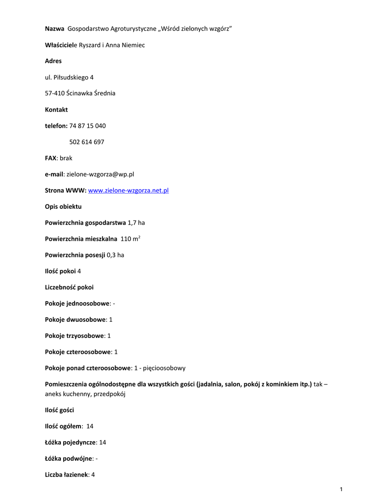 Nazwa Gospodarstwo Agroturystyczne „Wśród zielonych wzgórz” Właściciele Ryszard i Anna Niemiec Adres ul. Piłsudskiego 4 57-410 Ścinawka Średnia Kontakt telefon: 74 87 15 040 502 614 697 FAX: brak e-mail: [email protected] Strona WWW: www.zielone-wzgorza.net.pl Opis obiektu Powierzchnia gospodarstwa 1,7 ha Powierzchnia mieszkalna 110 m2 Powierzchnia posesji 0,3 ha Ilość pokoi 4 Liczebność pokoi Pokoje jednoosobowe: Pokoje dwuosobowe: 1 Pokoje trzyosobowe: 1 Pokoje czteroosobowe: 1 Pokoje ponad czteroosobowe: 1 - pięcioosobowy Pomieszczenia ogólnodostępne dla wszystkich gości (jadalnia, salon, pokój z kominkiem itp.) tak – aneks kuchenny, przedpokój Ilość gości Ilość ogółem: 14 Łóżka pojedyncze: 14 Łóżka podwójne: Liczba łazienek: 4 1 Kuchnia dla gości (z wyposażeniem czy bez): tak – z wyposażeniem Wyposażenie pokoi (sprzęt AGD, RTV itp.) – tak, pokoje z wyposażeniem RTV Przystosowanie dla niepełnosprawnych (wyposażenie, komunikacja itp.) – brak Parking dla gości - tak Plac zabaw dla dzieci - tak Miejsce na grilla – tak Miejsce na ognisko - brak Altany, wiaty, tarasy itp. – tak – zadaszone miejsce na grilla, leżaki, huśtawki Możliwość przyjazdu ze zwierzętami – brak Miejsce do przechowania rowerów - tak Sposób dojazdu (komunikacja zbiorowa, komunikacja indywidualna) – komunikacja indywidualna, PKS, PKP Znajomość języków obcych – brak Okres działalności/sezon –całorocznie Oddzielne wyjście dla gości - tak Możliwość zapewnienia wyżywienia - brak Dostępność produktów lokalnych/regionalnych oraz rękodzieła – brak Zwierzęta gospodarskie/możliwość uczestnictwa w pracach gospodarskich - brak Sprzęt turystyczny do dyspozycji gości -brak Możliwość wypożyczenia rowerów (ew. Ich ilość) – brak Materiały promocyjne i pomocnicze do dyspozycji gości – tak, mapy oraz osobiste doradztwo i pomoc Dostęp do internetu – tak Forma płatności – gotówka Opis własny: Gospodarstwo agroturystyczne „Wśród Zielonych Wzgórz” powstało w 2007r. Położone jest na terenie Kotliny Kłodzkiej (woj. dolnośląskie) w miejscowości Ścinawka Średnia, pomiędzy Kłodzkiem i Radkowem. Znajduje się ono w punkcie centralnym, z którego wyruszyć można w pobliskie Góry Stołowe, tajemnicze Góry Sowie, zwiedzić Wambierzyce, zwane dolnośląską Jerozolimą oraz miejscowości zdrojowe: Polanicę, Kudowę i Duszniki. W położonym 5 km od nas Tłumaczowie znajduje się przejście graniczne, skąd można dostać się na stronę czeską Gór Stołowych. Malownicze krajobrazy, niezależnie od pory roku zachęcają do górskich wędrówek i wycieczek rowerowych. W sezonie zimowym miłośnikom nart polecamy niedaleko położone ośrodki sportów zimowych w Zieleńcu, Rzeczce i Sokolcu. Oferujemy Państwu 2 noclegi w pokojach: 2, 3, 4 i 5 - osobowym. Wszystkie pokoje mają łazienki i wyposażone są w radio i TV. Do dyspozycji gości jest aneks kuchenny. Na terenie ogrodzonej posesji znajduje się parking dla Gości oraz miejsce do grillowania. Czeka na Państwa wiele atrakcji i miła atmosfera. 3