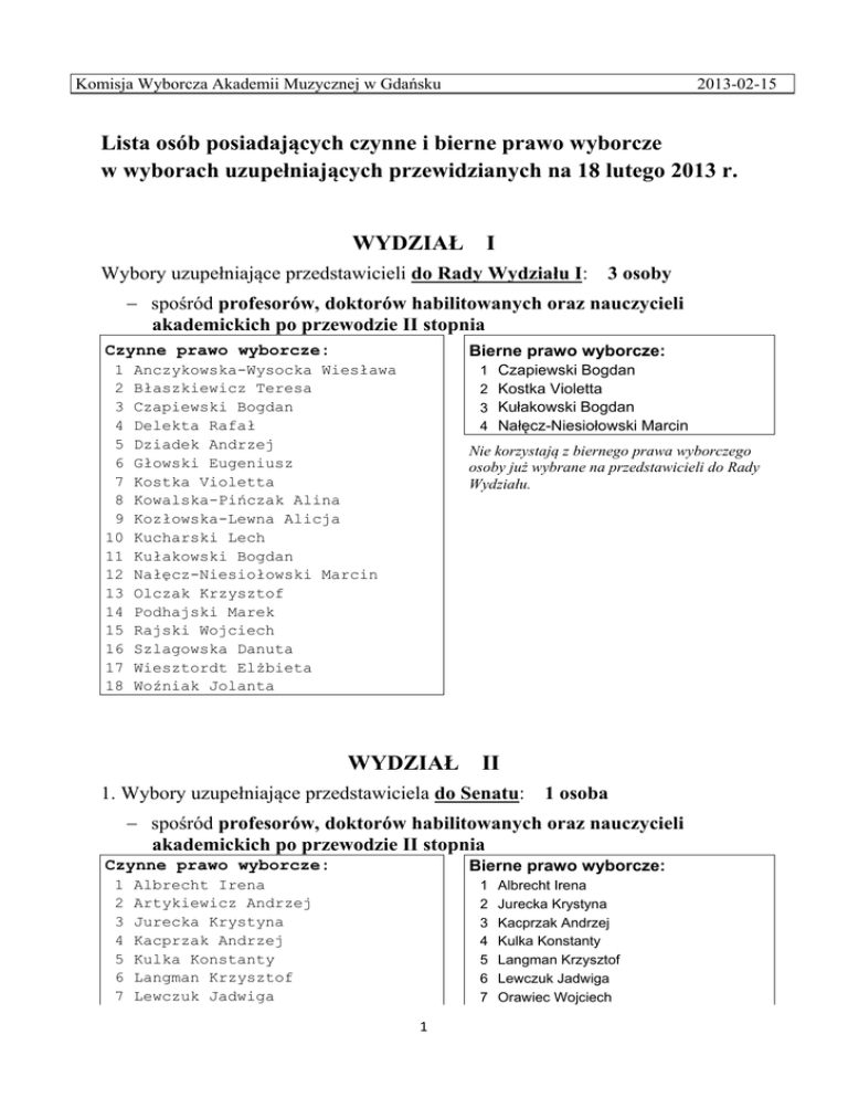 Komisja Wyborcza Akademii Muzycznej w Gdańsku 2013-02-15 Lista osób posiadających czynne i bierne prawo wyborcze w wyborach uzupełniających przewidzianych na 18 lutego 2013 r. WYDZIAŁ I Wybory uzupełniające przedstawicieli do Rady Wydziału I: 3 osoby spośród profesorów, doktorów habilitowanych oraz nauczycieli akademickich po przewodzie II stopnia Bierne prawo wyborcze: Czynne prawo wyborcze: 1 2 3 4 5 6 7 8 9 10 11 12 13 14 15 16 17 18 Anczykowska-Wysocka Wiesława Błaszkiewicz Teresa Czapiewski Bogdan Delekta Rafał Dziadek Andrzej Głowski Eugeniusz Kostka Violetta Kowalska-Pińczak Alina Kozłowska-Lewna Alicja Kucharski Lech Kułakowski Bogdan Nałęcz-Niesiołowski Marcin Olczak Krzysztof Podhajski Marek Rajski Wojciech Szlagowska Danuta Wiesztordt Elżbieta Woźniak Jolanta 1 2 3 4 Czapiewski Bogdan Kostka Violetta Kułakowski Bogdan Nałęcz-Niesiołowski Marcin Nie korzystają z biernego prawa wyborczego osoby już wybrane na przedstawicieli do Rady Wydziału. WYDZIAŁ II 1. Wybory uzupełniające przedstawiciela do Senatu: 1 osoba spośród profesorów, doktorów habilitowanych oraz nauczycieli akademickich po przewodzie II stopnia Bierne prawo wyborcze: Czynne prawo wyborcze: 1 2 3 4 5 6 7 Albrecht Irena Artykiewicz Andrzej Jurecka Krystyna Kacprzak Andrzej Kulka Konstanty Langman Krzysztof Lewczuk Jadwiga 1 2 3 4 5 6 7 1 Albrecht Irena Jurecka Krystyna Kacprzak Andrzej Kulka Konstanty Langman Krzysztof Lewczuk Jadwiga Orawiec Wojciech 8 9 10 11 12 13 14 15 16 17 18 19 20 21 22 23 Ocieszak Bogdan Orawiec Wojciech Pawlak Mirosława Perucki Roman Prabucka-Firlej Anna Raatz Józef Rosińska Elżbieta Rydel Paweł Samerek Tadeusz Skorupa-Glinianowicz Małgorzata Skotnicka Małgorzata Sobczak Maciej Suwara Maria Szlachcikowski Wojciech Wojtal Waldemar Wujtewicz Jerzy 8 9 10 11 12 13 14 15 Pawlak Mirosława Perucki Roman Prabucka-Firlej Anna Rydel Paweł Samerek Tadeusz Skotnicka Małgorzata Szlachcikowski Wojciech Wujtewicz Jerzy Nie korzystają z biernego prawa wyborczego osoby pełniące funkcje: rektora, prorektora i dziekana, gdyż z mocy statutu są już członkami Senatu, oraz osoby już wybrane na przedstawicieli do Senatu. 2. Wybory uzupełniające przedstawicieli do Rady Wydziału II: 2 osoby spośród profesorów, doktorów habilitowanych oraz nauczycieli akademickich po przewodzie II stopnia Bierne prawo wyborcze: Czynne prawo wyborcze: 1 2 3 4 5 6 7 8 9 10 11 12 13 14 15 16 17 18 19 20 21 22 23 Albrecht Irena Artykiewicz Andrzej Jurecka Krystyna Kacprzak Andrzej Kulka Konstanty Langman Krzysztof Lewczuk Jadwiga Ocieszak Bogdan Orawiec Wojciech Pawlak Mirosława Perucki Roman Prabucka-Firlej Anna Raatz Józef Rosińska Elżbieta Rydel Paweł Samerek Tadeusz Skorupa-Glinianowicz Małgorzata Skotnicka Małgorzata Sobczak Maciej Suwara Maria Szlachcikowski Wojciech Wojtal Waldemar Wujtewicz Jerzy 2 1 2 3 4 Kacprzak Andrzej Kulka Konstanty Rydel Paweł Samerek Tadeusz Nie korzystają z biernego prawa wyborczego osoby pełniące funkcje dziekana i prodziekana, gdyż z mocy statutu są już członkami Rady Wydziału, oraz osoby już wybrane na przedstawicieli do Rady Wydziału. WYDZIAŁ IV Wybory uzupełniające przedstawicieli do Rady Wydziału IV: 2 osoby spośród profesorów, doktorów habilitowanych oraz nauczycieli akademickich po przewodzie II stopnia Bierne prawo wyborcze: Czynne prawo wyborcze: 1 2 3 4 5 6 7 8 9 10 11 12 13 Bramorski Jacek Fedyk-Klimaszewska Monika Fiebig Anna Górski Waldemar Grabowski Bogusław Grucza-Rogalska Aleksandra Kułakowski Leszek Kupsik Małgorzata Michalski Andrzej Rocławski Marek Szadejko Andrzej Tomczak Marcin Wiesztordt Włodzimierz 1 Grabowski Bogusław 2 Grucza-Rogalska Aleksandra 3 Szadejko Andrzej Nie korzystają z biernego prawa wyborczego osoby pełniące funkcje dziekana i prodziekana, gdyż z mocy statutu są już członkami Rady Wydziału, oraz osoby już wybrane na przedstawicieli do Rady Wydziału. Przewodniczący Komisji Wyborczej Akademii Muzycznej w Gdańsku Tadeusz Szefler 3