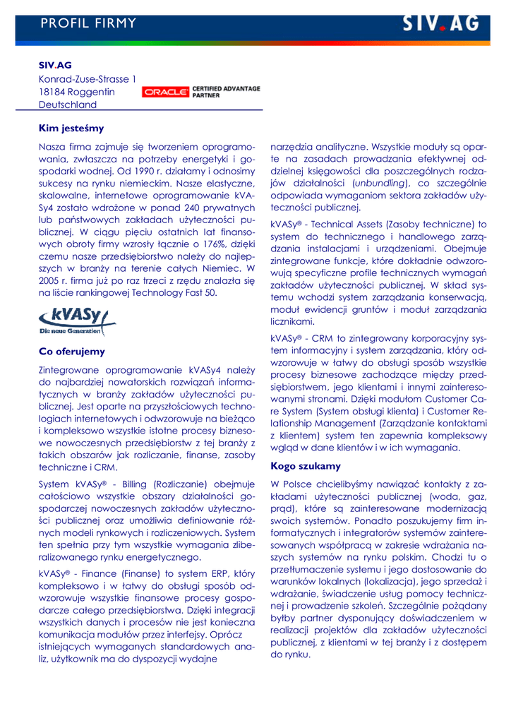 PROFIL FIRMY SIV.AG Konrad-Zuse-Strasse 1 18184 Roggentin Deutschland Kim jesteśmy Nasza firma zajmuje się tworzeniem oprogramowania, zwłaszcza na potrzeby energetyki i gospodarki wodnej. Od 1990 r. działamy i odnosimy sukcesy na rynku niemieckim. Nasze elastyczne, skalowalne, internetowe oprogramowanie kVASy4 zostało wdrożone w ponad 240 prywatnych lub państwowych zakładach użyteczności publicznej. W ciągu pięciu ostatnich lat finansowych obroty firmy wzrosły łącznie o 176%, dzięki czemu nasze przedsiębiorstwo należy do najlepszych w branży na terenie całych Niemiec. W 2005 r. firma już po raz trzeci z rzędu znalazła się na liście rankingowej Technology Fast 50. Co oferujemy Zintegrowane oprogramowanie kVASy4 należy do najbardziej nowatorskich rozwiązań informatycznych w branży zakładów użyteczności publicznej. Jest oparte na przyszłościowych technologiach internetowych i odwzorowuje na bieżąco i kompleksowo wszystkie istotne procesy biznesowe nowoczesnych przedsiębiorstw z tej branży z takich obszarów jak rozliczanie, finanse, zasoby techniczne i CRM. System kVASy® - Billing (Rozliczanie) obejmuje całościowo wszystkie obszary działalności gospodarczej nowoczesnych zakładów użyteczności publicznej oraz umożliwia definiowanie różnych modeli rynkowych i rozliczeniowych. System ten spełnia przy tym wszystkie wymagania zliberalizowanego rynku energetycznego. kVASy® - Finance (Finanse) to system ERP, który kompleksowo i w łatwy do obsługi sposób odwzorowuje wszystkie finansowe procesy gospodarcze całego przedsiębiorstwa. Dzięki integracji wszystkich danych i procesów nie jest konieczna komunikacja modułów przez interfejsy. Oprócz istniejących wymaganych standardowych analiz, użytkownik ma do dyspozycji wydajne narzędzia analityczne. Wszystkie moduły są oparte na zasadach prowadzania efektywnej oddzielnej księgowości dla poszczególnych rodzajów działalności (unbundling), co szczególnie odpowiada wymaganiom sektora zakładów użyteczności publicznej. kVASy® - Technical Assets (Zasoby techniczne) to system do technicznego i handlowego zarządzania instalacjami i urządzeniami. Obejmuje zintegrowane funkcje, które dokładnie odwzorowują specyficzne profile technicznych wymagań zakładów użyteczności publicznej. W skład systemu wchodzi system zarządzania konserwacją, moduł ewidencji gruntów i moduł zarządzania licznikami. kVASy® - CRM to zintegrowany korporacyjny system informacyjny i system zarządzania, który odwzorowuje w łatwy do obsługi sposób wszystkie procesy biznesowe zachodzące między przedsiębiorstwem, jego klientami i innymi zainteresowanymi stronami. Dzięki modułom Customer Care System (System obsługi klienta) i Customer Relationship Management (Zarządzanie kontaktami z klientem) system ten zapewnia kompleksowy wgląd w dane klientów i w ich wymagania. Kogo szukamy W Polsce chcielibyśmy nawiązać kontakty z zakładami użyteczności publicznej (woda, gaz, prąd), które są zainteresowane modernizacją swoich systemów. Ponadto poszukujemy firm informatycznych i integratorów systemów zainteresowanych współpracą w zakresie wdrażania naszych systemów na rynku polskim. Chodzi tu o przetłumaczenie systemu i jego dostosowanie do warunków lokalnych (lokalizacja), jego sprzedaż i wdrażanie, świadczenie usług pomocy technicznej i prowadzenie szkoleń. Szczególnie pożądany byłby partner dysponujący doświadczeniem w realizacji projektów dla zakładów użyteczności publicznej, z klientami w tej branży i z dostępem do rynku.