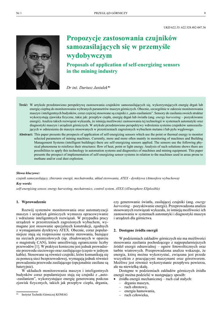 Nr 1 PRZEGLĄD GÓRNICZY 9 UKD 622.33: 622.528.482-047.36 Propozycje zastosowania czujników samozasilających się w przemyśle wydobywczym Proposals of application of self-energizing sensors in the mining industry Dr inż. Dariusz Jasiulek*) Treść: W artykule przedstawiono perspektywę zastosowania czujników samozasilających się, wykorzystujących energię drgań lub energię cieplną do monitorowania wybranych parametrów maszyn górniczych. Obecnie, szczególnie w zakresie monitorowania maszyn i inteligentnych budynków, coraz częściej stosowane są czujniki z „auto-zasilaniem”. Sensory do zasilania swoich struktur wykorzystują zjawiska fizyczne, takie jak: przepływ ciepła, energię drgań lub światła (ang. energy harvesting – pozyskiwanie energii). Analiza takich rozwiązań wykazała, że istnieją możliwości zastosowania tej technologii w systemach automatyki oraz diagnostyki maszyn i urządzeń górniczych. W artykule przedstawiono perspektywy wdrożenia systemu czujników samozasilających w odniesieniu do maszyn stosowanych w przestrzeniach zagrożonych wybuchem metanu i/lub pyłu węglowego. Abstract: This paper presents the prospects of application of self-energizing sensors which use the point or thermal energy to monitor selected parameters of mining machines. Currently, more and more often mainly in monitoring of machines and Building Management Systems (intelligent buildings) there are self-energizing sensors applied. The sensors use the following physical phenomena to reinforce their structures: flow of heat, point or light energy. Analysis of such solutions shows there are possibilities to apply this technology in automation systems and diagnostics of machines and mining equipment. This paper presents the prospect of implementation of self-energizing sensor systems in relation to the machines used in areas prone to methane and/or coal dust explosion. Słowa kluczowe: czujnik samozasilający, zbieranie energii, mechatronika, układ sterowania, ATEX - dyrektywa (Atmosfera wybuchowa) Key words: self-energizing sensor, energy harvesting, mechatronics, control system, ATEX (ATmosphere EXplosible) 1. Wprowadzenie Rozwój systemów monitorowania oraz automatyzacji maszyn i urządzeń górniczych wymusza opracowywanie i wdrażanie inteligentnych rozwiązań. W przypadku pracy urządzeń w przestrzeniach zagrożonych wybuchem, wymagane jest stosowanie specjalnych konstrukcji, zgodnych z wymaganiami dyrektywy ATEX. Obecnie, coraz popularniejsze stają się rozproszone systemy sterowania, bazujące na sieciach przemysłowych (np. zbudowanych w oparciu o magistralę CAN), które umożliwiają ograniczenie liczby przewodów [1]. W praktyce konieczne jest jednak prowadzenie przewodu sieciowego oraz zasilającego (często w jednym kablu). Stosowane są również czujniki, które komunikują się za pomocą sieci bezprzewodowej, wymagają jednak również prowadzenia przewodu zasilającego (opcjonalnie zasilane są bateryjnie). W układach monitorowania maszyn i inteligentnych budynków coraz popularniejsze stają się czujniki z „auto-zasilaniem”, wykorzystujące energię generowaną podczas zjawisk fizycznych, takich jak przepływ ciepła, drgania, *) Instytut Techniki Górniczej KOMAG czy generowanie światła, zasilającej czujniki (ang. energy harvesting – pozyskiwanie energii). Przeprowadzona analiza stosowanych rozwiązań wykazała, że istnieją możliwości ich zastosowania w systemach automatyki i diagnostyki maszyn i urządzeń dla górnictwa. 2. dostępne źródła energii W podziemiach zakładów górniczych nie ma możliwości stosowania zasilania pochodzącego z najpopularniejszych źródeł energii odnawialnej – ogniw fotowolticznych oraz turbin wiatrowych. Przeprowadzona analiza wskazuje, że energia, którą można wykorzystać, związana jest przede wszystkim z pracującymi maszynami oraz górotworem. Możliwe jest również wykorzystanie przepływu powierza, ale na niewielką skalę. Dostępne w podziemiach zakładów górniczych źródła energii można podzielić w następujący sposób: • źródła energii mechanicznej – ruch ciał stałych: – drgania maszyn, – ruch obrotowy, – energia hamowania, – ruch człowieka, 10 PRZEGLĄD GÓRNICZY • źródła energii termalnej: – nagrzewnie komponentów maszyn i urządzeń (energia strat), – temperatura ciała człowieka, – temperatura górotworu, • źródła energii pochodzącej z promieniowania elektromagnetycznego: – pracujące maszyny, – przewody zasilające, • źródła energii pochodzącej z przepływu powietrza. Przystępując do sporządzenia przedstawionego podziału uwzględniono możliwości techniczne pozyskania i przetworzenia energii. Najbardziej rozwinięte są obecnie rozwiązania z zakresu przetwarzania energii drgań oraz energii termalnej. 3. Metody pozyskiwania energii elektrycznej Przeprowadzona analiza literaturowa [4, 17] oraz analiza w zakresie dostępnych rozwiązań [9, 13, 14, 15, 16] – nieprzeznaczanych do pracy w przestrzeniach zagrożonych wybuchem metanu i/lub pyłu węglowego, wskazała na możliwości budowy systemu czujników samozasilających się. W zakresie pozyskiwania energii z drgań mechanicznych przeanalizowano rozwiązania przetworników elektromagnetycznych oraz piezoelektrycznych, jako potencjalnych źródeł zasilania czujników wchodzących w skład systemu [9, 12, 13, 14, 15, 16]. Przeanalizowano również rozwiązania z zakresu przetworników termoelektrycznych oraz fotowoltaicznych [11]. 3.1. Metoda elektromagnetycza Metoda wykorzystuje prawo Faradaya mówiące o tym, że w przewodniku umieszczonym w zmiennym polu magnetycznym indukuje się siła elektromotoryczna. Zmienne pole magnetyczne wytwarzane jest najczęściej przez poruszające się magnesy, natomiast rolę przewodnika pełnią odpowiednio zbudowane układy cewek. Firma Tremont Electric przedstawiła sposób zastosowania przetwornika elektromagnetycznego w