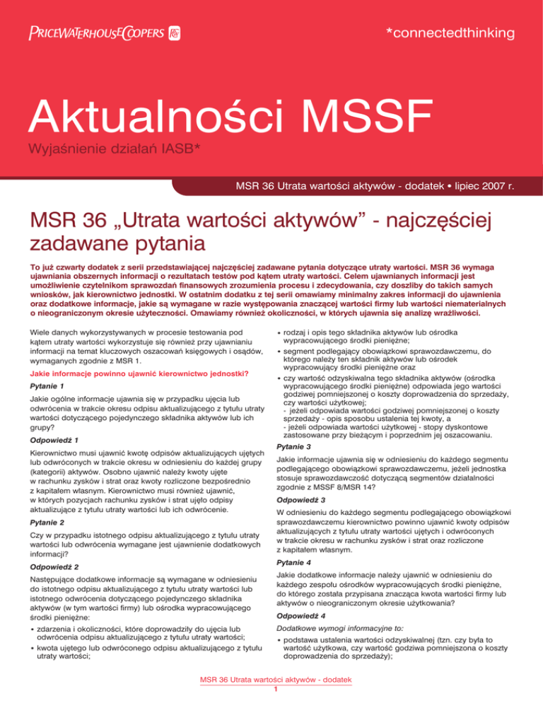 *connectedthinking Aktualności MSSF Wyjaśnienie działań IASB* MSR 36 Utrata wartości aktywów - dodatek l lipiec 2007 r. MSR 36 „Utrata wartości aktywów” - najczęściej zadawane pytania To już czwarty dodatek z serii przedstawiającej najczęściej zadawane pytania dotyczące utraty wartości. MSR 36 wymaga ujawniania obszernych informacji o rezultatach testów pod kątem utraty wartości. Celem ujawnianych informacji jest umożliwienie czytelnikom sprawozdań finansowych zrozumienia procesu i zdecydowania, czy doszliby do takich samych wniosków, jak kierownictwo jednostki. W ostatnim dodatku z tej serii omawiamy minimalny zakres informacji do ujawnienia oraz dodatkowe informacje, jakie są wymagane w razie występowania znaczącej wartości firmy lub wartości niematerialnych o nieograniczonym okresie użyteczności. Omawiamy również okoliczności, w których ujawnia się analizę wrażliwości. Wiele danych wykorzystywanych w procesie testowania pod kątem utraty wartości wykorzystuje się również przy ujawnianiu informacji na temat kluczowych oszacowań księgowych i osądów, wymaganych zgodnie z MSR 1. Jakie informacje powinno ujawnić kierownictwo jednostki? Pytanie 1 Jakie ogólne informacje ujawnia się w przypadku ujęcia lub odwrócenia w trakcie okresu odpisu aktualizującego z tytułu utraty wartości dotyczącego pojedynczego składnika aktywów lub ich grupy? Odpowiedź 1 Kierownictwo musi ujawnić kwotę odpisów aktualizujących ujętych lub odwróconych w trakcie okresu w odniesieniu do każdej grupy (kategorii) aktywów. Osobno ujawnić należy kwoty ujęte w rachunku zysków i strat oraz kwoty rozliczone bezpośrednio z kapitałem własnym. Kierownictwo musi również ujawnić, w których pozycjach rachunku zysków i strat ujęło odpisy aktualizujące z tytułu utraty wartości lub ich odwrócenie. Pytanie 2 Czy w przypadku istotnego odpisu aktualizującego z tytułu utraty wartości lub odwrócenia wymagane jest ujawnienie dodatkowych informacji? • rodzaj i opis tego składnika aktywów lub ośrodka wypracowującego środki pieniężne; • segment podlegający obowiązkowi sprawozdawczemu, do którego należy ten składnik aktywów lub ośrodek wypracowujący środki pieniężne oraz • czy wartość odzyskiwalna tego składnika aktywów (ośrodka wypracowującego środki pieniężne) odpowiada jego wartości godziwej pomniejszonej o koszty doprowadzenia do sprzedaży, czy wartości użytkowej; - jeżeli odpowiada wartości godziwej pomniejszonej o koszty sprzedaży - opis sposobu ustalenia tej kwoty, a - jeżeli odpowiada wartości użytkowej - stopy dyskontowe zastosowane przy bieżącym i poprzednim jej oszacowaniu. Pytanie 3 Jakie informacje ujawnia się w odniesieniu do każdego segmentu podlegającego obowiązkowi sprawozdawczemu, jeżeli jednostka stosuje sprawozdawczość dotyczącą segmentów działalności zgodnie z MSSF 8/MSR 14? Odpowiedź 3 W odniesieniu do każdego segmentu podlegającego obowiązkowi sprawozdawczemu kierownictwo powinno ujawnić kwoty odpisów aktualizujących z tytułu utraty wartości ujętych i odwróconych w trakcie okresu w rachunku zysków i strat oraz rozliczone z kapitałem własnym. Pytanie 4 Odpowiedź 2 Następujące dodatkowe informacje są wymagane w odniesieniu do istotnego odpisu aktualizującego z tytułu utraty wartości lub istotnego odwrócenia dotyczącego pojedynczego składnika aktywów (w tym wartości firmy) lub ośrodka wypracowującego środki pieniężne: • zdarzenia i okoliczności, które doprowadziły do ujęcia lub odwrócenia odpisu aktualizującego z tytułu utraty wartości; • kwota ujętego lub odwróconego odpisu aktualizującego z tytułu utraty wartości; Jakie dodatkowe informacje należy ujawnić w odniesieniu do każdego zespołu ośrodków wypracowujących środki pieniężne, do którego została przypisana znacząca kwota wartości firmy lub aktywów o nieograniczonym okresie użytkowania? Odpowiedź 4 Dodatkowe wymogi informacyjne to: • podstawa ustalenia wartości odzyskiwalnej (tzn. czy była to wartość użytkowa, czy wartość godziwa pomniejszona o koszty doprowadzenia do sprzedaży); MSR 36 Utrata wartości aktywów - dodatek 1 Aktualności MSSF - dodatek lipiec 2007 r. • wartość bilansowa wartości firmy/wartości niematerialnych o nieograniczonym okresie użyteczności, które zostały przypisane do danego ośrodka wypracowującego środki pieniężne/zespołów ośrodków wypracowujących środki pieniężne; • opis kluczowych założeń przyjętych dla potrzeb wyliczeń; • opis podejścia kierownictwa do ustalania wartości poszczególnych kluczowych założeń oraz stwierdzenie, czy wartości poszczególnych założeń są zgodne z dotychczasowym doświadczeniem/danymi pochodzącymi ze źródeł zewnętrznych, a jeżeli nie są - podanie przyczyn takiego stanu rzeczy; • okres objęty przez kierownictwo prognozami przepływów pieniężnych; • założona długoterminowa stopa wzrostu i uzasadnienie zastosowanej stopy wzrostu, jeżeli przewyższa długoterminową stopę wzrostu dla danego kraju, rynku lub sektora oraz • stopa dyskontowa dla kwot przed opodatkowaniem wykorzystana w wyliczeniach. Pytanie 5 Co to jest „kluczowe założenie”? Odpowiedź 5 Kluczowe założenia to założenia, na które wartość odzyskiwalna danego ośrodka wypracowującego środki pieniężne lub ich zespołu jest najbardziej wrażliwa. Kluczowe założenia obejmują zwykle założenia leżące u podstaw przewidywanych możliwości wzrostu sprzedaży lub przychodów, oraz założenia co do poziomu długoterminowego wzrostu. wypracowujących środki pieniężne, o aktywach netto (w tym wartość firmy) 400 mln GBP, wynosi 430 mln GBP, co daje margines w wysokości 30 mln GBP. Kluczowe założenia są zgodne z danymi ze źródeł zewnętrznych. Wyliczenie jest najbardziej wrażliwe na stopy dyskontowe. Ich obecny poziom, czyli 8,5%, jest o 1,0% niższy niż