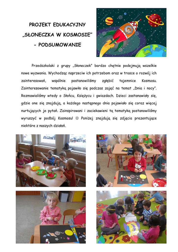 PROJEKT EDUKACYJNY „SŁONECZKA W KOSMOSIE” - PODSUMOWANIE Przedszkolaki z grupy „Słoneczek” bardzo chętnie podejmują wszelkie nowe wyzwania. Wychodząc naprzeciw ich potrzebom oraz w trosce o rozwój ich zainteresowań, wspólnie postanowiliśmy zgłębić tajemnice Kosmosu. Zainteresowanie tematyką pojawiło się podczas zajęć na temat „Dnia i nocy”. Rozmawialiśmy wtedy o Słońcu, Księżycu i gwiazdach. Dzieci zastanawiały się, gdzie one się znajdują, a każdego następnego dnia pojawiało się coraz więcej nurtujących je pytań. Zainspirowani i zaciekawieni tą tematyką postanowiliśmy wyruszyć w podbój Kosmosu!  Poniżej znajdują się zdjęcia prezentujące niektóre z naszych działań. Choć nasza wspaniała przygoda z Kosmosem dobiegła końca, jeszcze długo będziemy pamiętać naszą podróż. Przedszkolaki z grupy „Słoneczek” bardzo zaangażowały się w poznanie Wszechświata. Dzięki ich inicjatywie weryfikowaliśmy dotychczasową wiedzę i pogłębialiśmy ją. Poprzez różnorodne działania temat naszego projektu stał się nam jeszcze bliższy. Wszystkich gorąco zachęcamy do przeżycia takiej przygody!